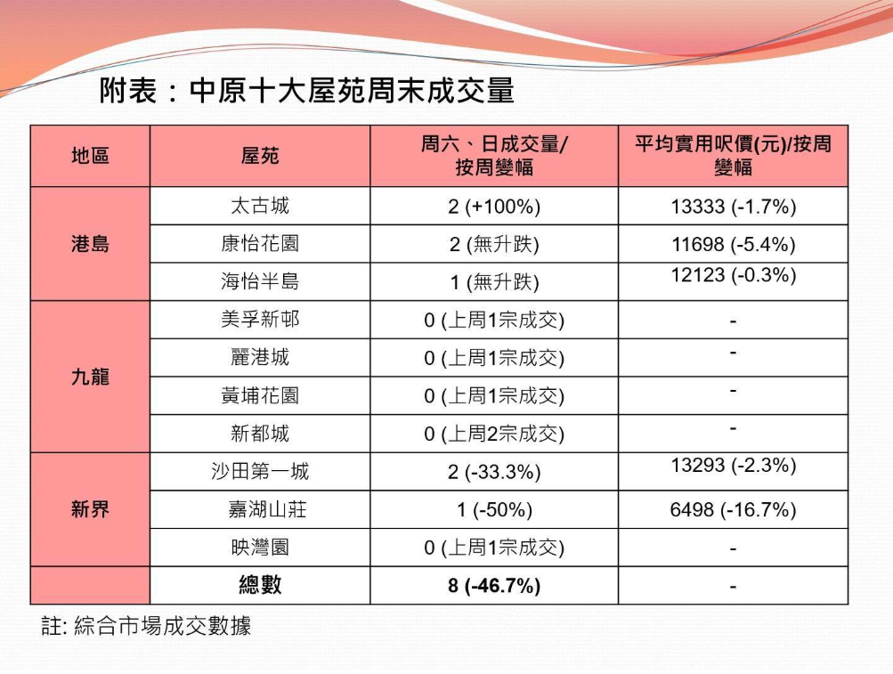 一手新盤熱銷,二手交投受壓並即放慢,中原十大屋苑本周末僅錄8宗,重回個位數水平。(中原提供)