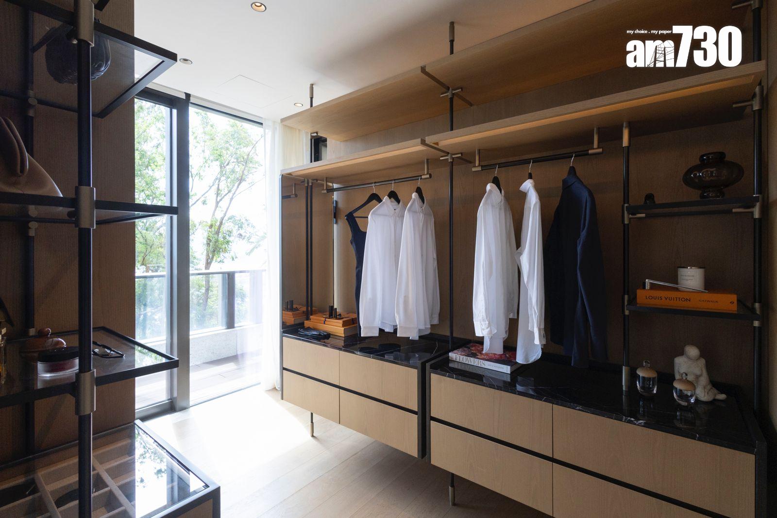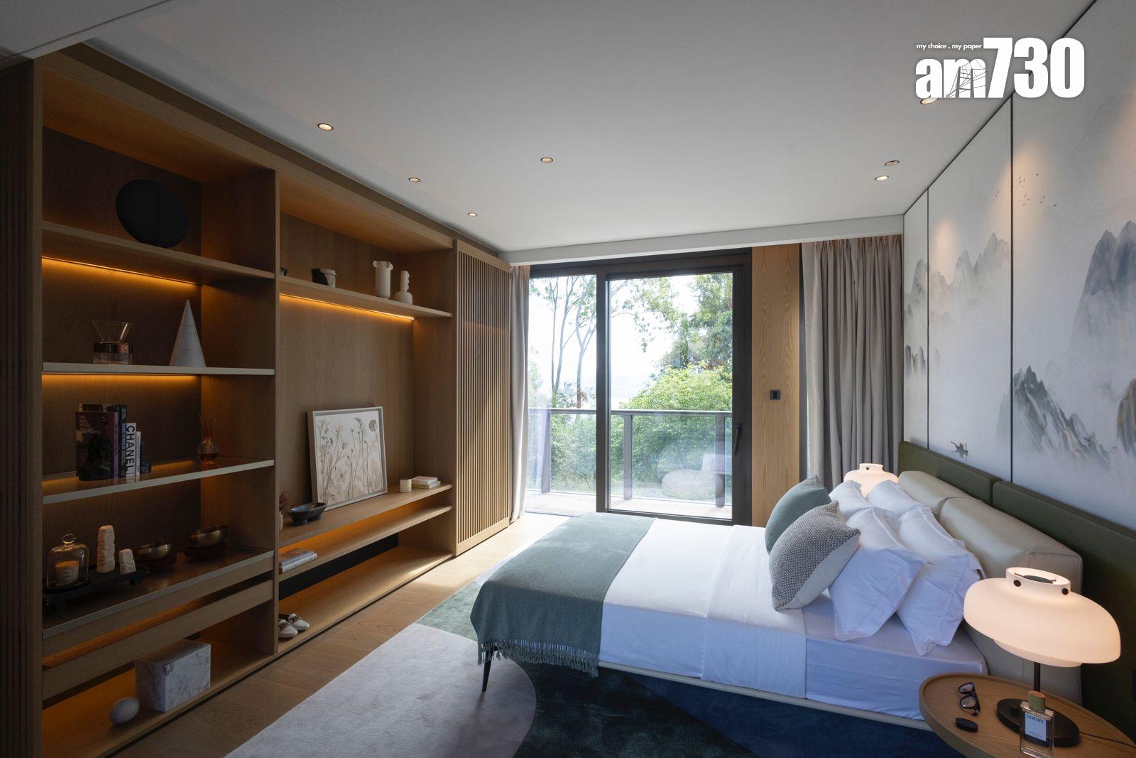 特大主人套房達630方呎,採和風淺木設計,書房以型格黑色營造沉靜氛圍。走廊設 巨型大窗及窗前木紋長櫈和雅致圓形小茶几 5, 6,營造日式禪意,供住戶靜享景致。