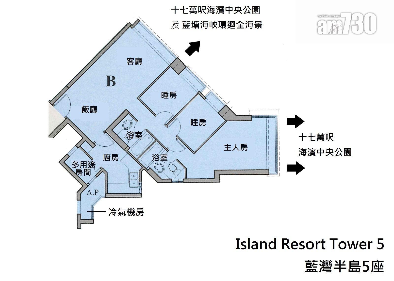 招潔冰指,藍灣半島5座中層B室,實用面積約733方呎,三房連主人套房加工人房設計,眺望藍塘海峽及清水灣海景,以3.26萬元租出,呎租約44.5元。
