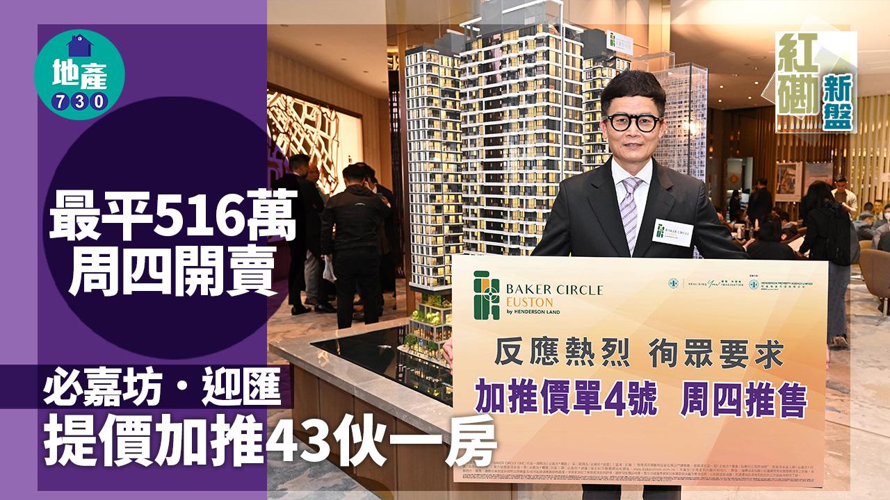 恒基地產(012)紅磡BAKER CIRCLE ONE第二期必嘉坊.迎匯(BAKER CIRCLE.EUSTON)上周五(31日)進行新一輪銷售,涉及84伙,即日售出71伙,佔可發售單位近85%,套現約4.3億元。