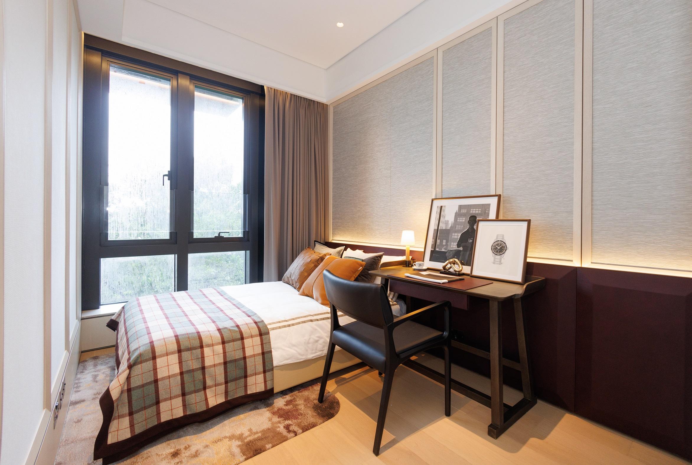 主人睡房亦設有落地大玻璃外接工作平台,與客飯廳同向,均可享吐露港一帶景色。睡房空間寬敞,長約5米、闊約3.6米,空間逾200方呎,擺放特大雙人床、衣櫃及梳妝台後仍可三邊落床。主人浴室同樣採明廁設計,特設淋浴間及浴缸,配合戶主不同需要,並採用雙面盤設計,更升級配置電暖毛巾架。設計師特意預留一個房間作書房或愛好室之用,並配以特色牆板,打造富個性的私人空間。