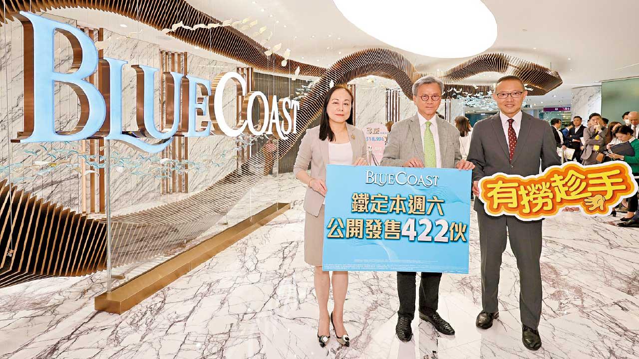以「撈低價」出擊搶盡市場焦點、長江實業集團(1113)與港鐵(066)合作的黃竹坑站港島南岸第3B期「Blue Coast」昨加推3號價單共174伙,扣除最高15%折扣,折實平均呎價23,892元,輕微加價約0.81%至1.73%。同時敲定周六盡推首3張價單共422伙進行首輪銷售。市傳已收約1.5萬票,超額逾34倍,凍結資金達15億元。