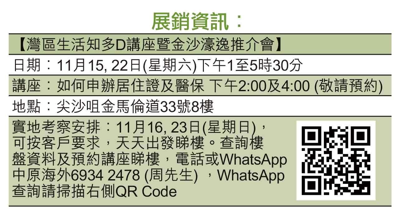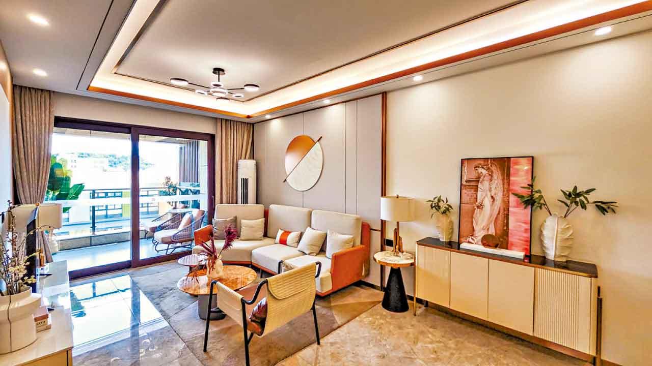 「金沙濠逸花園」設有6米高入戶中央空調大堂,區內罕見,在售現樓單位建築面積由約818至1,120方呎,提供2+1房至3+1房間隔,附帶精裝交樓標準,包括定制鋼木質入戶門、高品質花紋吊頂、客廳配影視背景牆、高儲物量浴室櫃及鏡框等。約818方呎2+1房售價由61萬元人民幣起,首付低至9萬餘元人民幣,即可享受深圳及惠州雙城都會圈生活配套、往來香港快捷便利的生活。