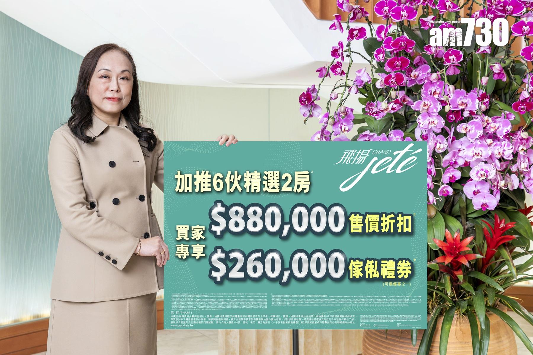 另外,發展商新增優惠以外,再延長「親友共賞優惠」至6月30日。「飛揚」第1期開售至今已合共售出725伙,佔整個項目約90%,套現逾36億元。