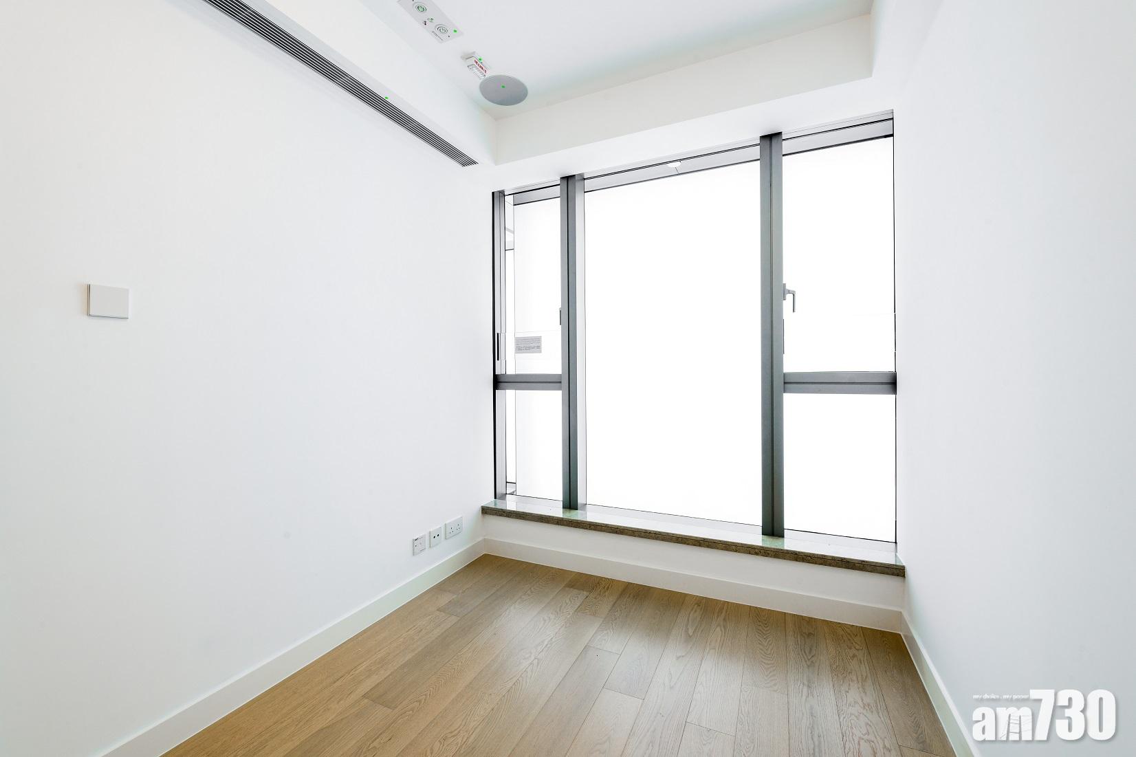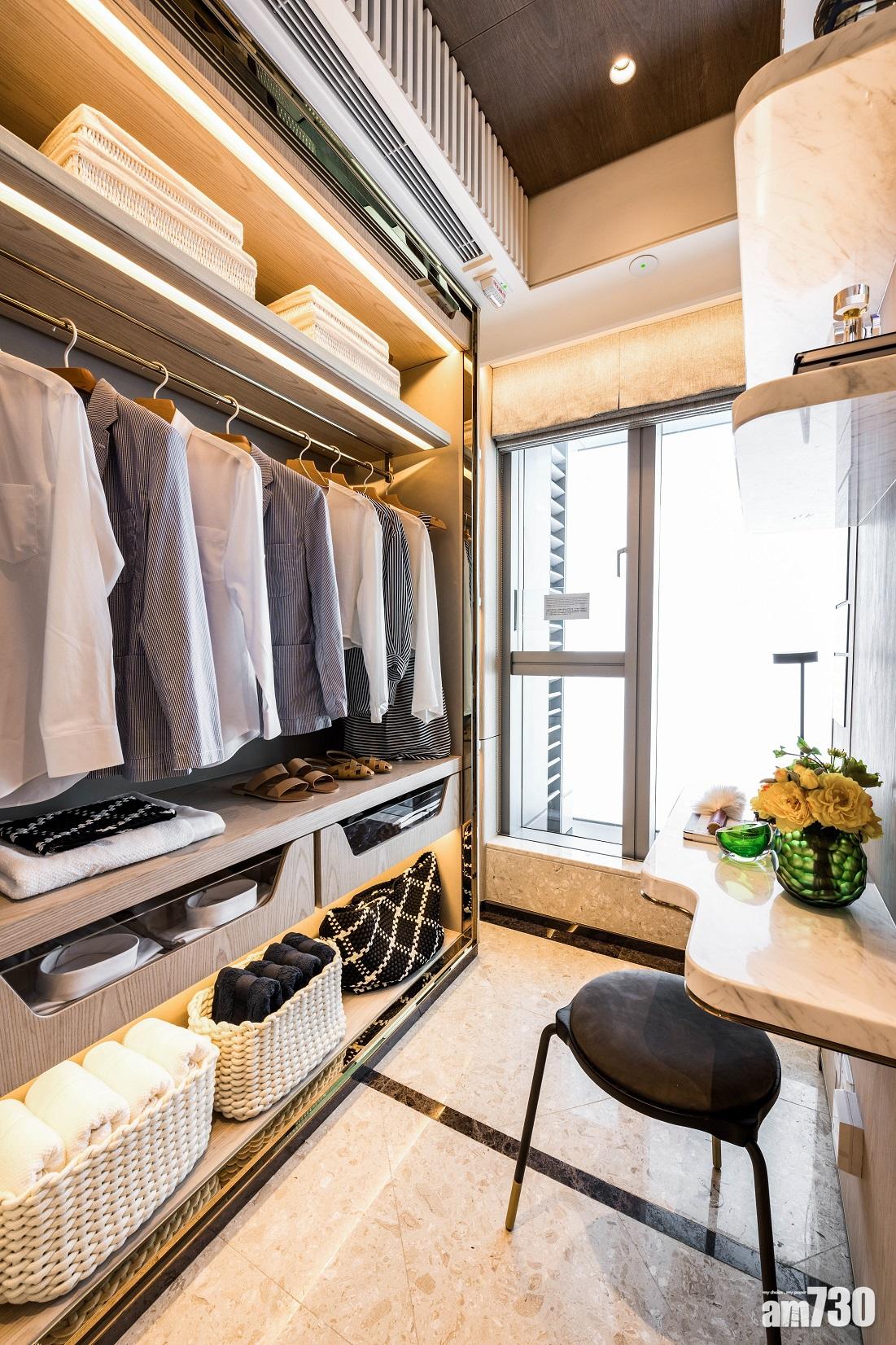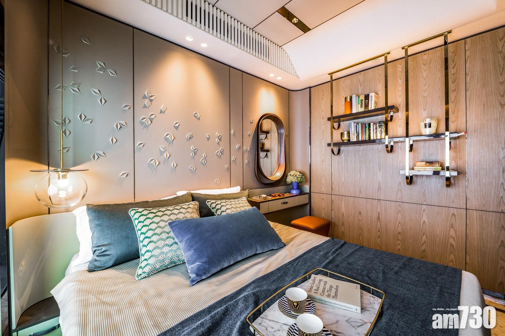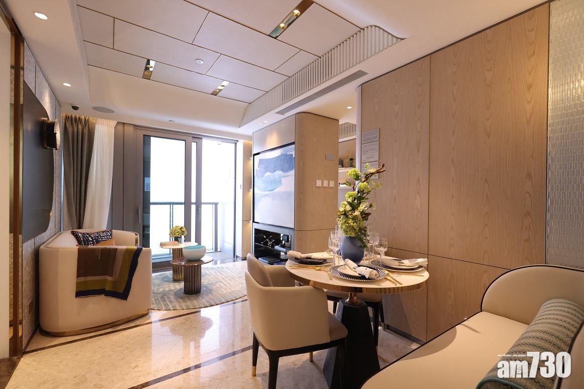 至於另一示範單位為2B座28樓B室連裝修,實用面積480方呎,原則為兩房,現改動為一房間隔。整個單位的設計元素同主題以MONACO以及帆船為靈感,木紋特色牆,配以圓弧形收邊及流線型的假天花。大廳方正,外連大露台配合落地玻璃,外望開揚啟德河景。飯廳以長型沙發椅打造,有如豪華遊艇船艙內的感覺,既能節省空間又別具特色。廚房採「梗廚」設計,一家大細享受下廚樂都非常寬闊,更配備著名品牌Miele及Siemens優質煮食爐具及家電。設計師以電視櫃及書桌打造出開放式衣帽間,亦可作為工作間。發展商指,同呎吋的兩房單位非常適合一些喜歡下廚的新婚夫婦或年輕家庭,空間運用亦都非常靈活,可以將其中一個睡房改建為衣帽間或者書房,滿足不同需要。