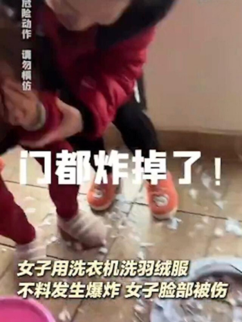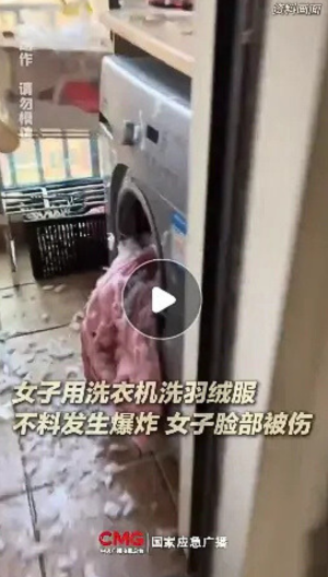 根據中國國家應急廣播及多家媒體報導,一名內地女子在使用洗衣機清洗羽絨服時,洗衣機突然發生猛烈爆炸。從現場影片可見,衝擊力之大,足以將洗衣機門炸開並飛脫墜地,機內的羽絨散落一地。受傷女子用手痛苦地捂著臉,鮮血從指縫中滲出,情況駭人。