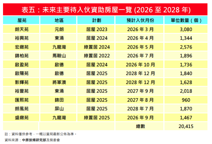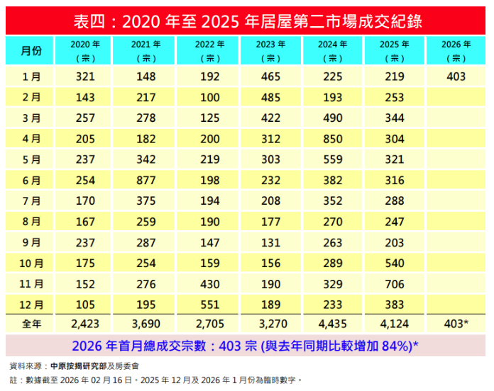 居二市場方面,王美鳳續指,樓市持續回穩向好,買家入市信心增強,同步帶動二手資助房屋成交上升;根據中原按揭研究部及房委會目前數字(截至2026年2月16日數字),2026年1月份居屋第二市場錄得403宗成交,2025年12月宗數為383宗按月微升5.2%,但較2025年1月219宗登記按年升幅達84%,是自2023年1月465宗後首月新高。隨著樓市前景轉趨明朗,加上政府於2025年12月宣布向白居二買家增發一批批准信,相信2026年居二市場交投將回復正增長。