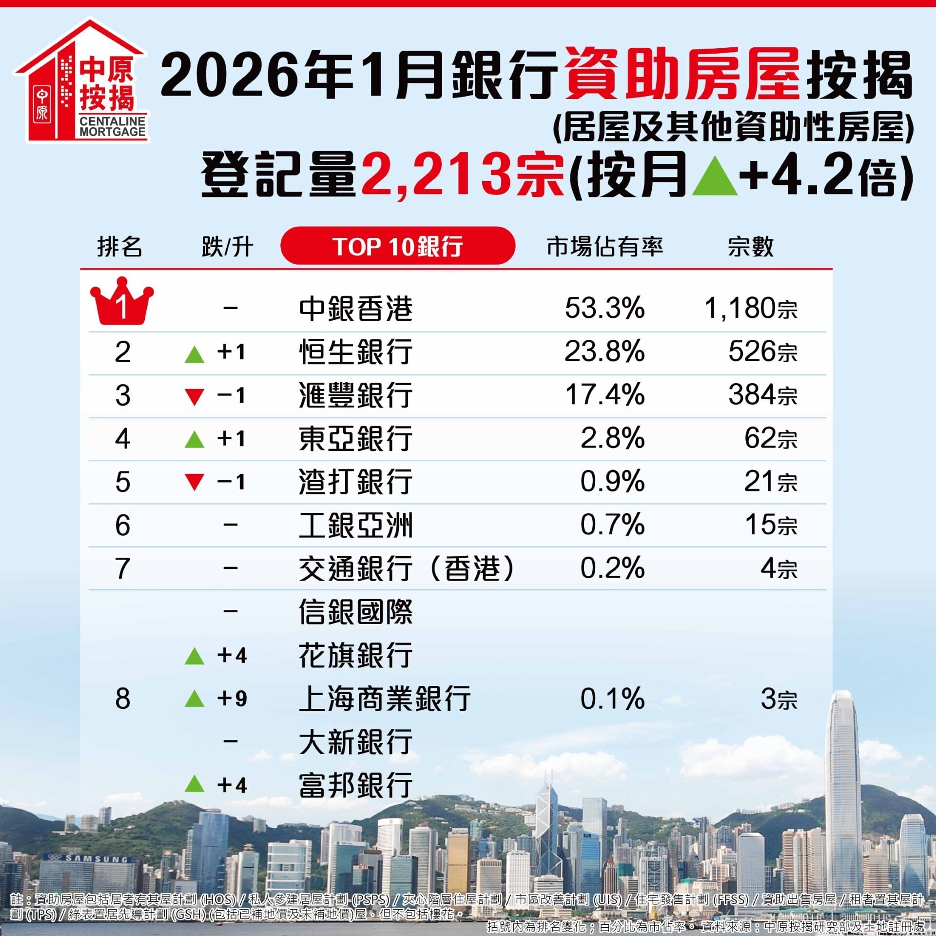 王美鳳表示,根據中原按揭研究部及土地註冊處數據, 2026年1月份本港銀行共錄得2,213宗資助房屋按揭登記,較2025年12月份的425宗,按月急增4.2倍;較2025年1月份的980宗,按年增1.25倍。數字反映現時屬大型新建居屋項目入伙高峰期,當中包括元朗朗天苑,東涌裕興苑及九龍灣宏緻苑。1月份首四位銀行市佔率上升6個百分點至97.3%。排名方面,中銀香港錄得1,180宗資助房屋按揭登記,市佔率按月微升0.6個百分點至53.3%,連續30個月穩居第一;恒生銀行有526宗資助房屋按揭登記,市佔率升9.2個百分點至23.8%,重回第二;滙豐銀行期內錄得384宗資助房屋按揭登記,市佔率微跌1.7個百分點至17.4%,跌一位排名第三;東亞銀行期內錄得62宗資助房屋按揭登記,市佔率輕跌0.3個百分點至2.8%,排名第四。