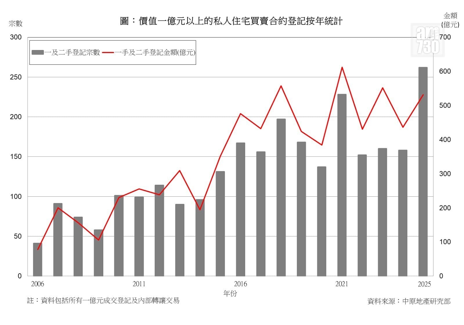 根據中原研究部資料顯示,2025年全年錄得262宗億元私人住宅成交,創歷年新高,成交金額531億元,宗數及金額佔整體成交0.43%及10.27%。2026年首兩個月,億元成交達48宗,成交金額更突破百億元,達104億元。新一份《財政預算案》將億元成交印花稅由4.25%加至6.5%。陳永傑指出,政府意識到豪宅物業交投轉熱,但事實上億元成交宗數多年來佔香港整體私人住宅成交不足1%,而且供應匱乏,屬頂流級別物業,買家非富則貴。即使是次提高億元物業的交易印花稅,對該類物業買家以至全港整體物業市場影響不大。