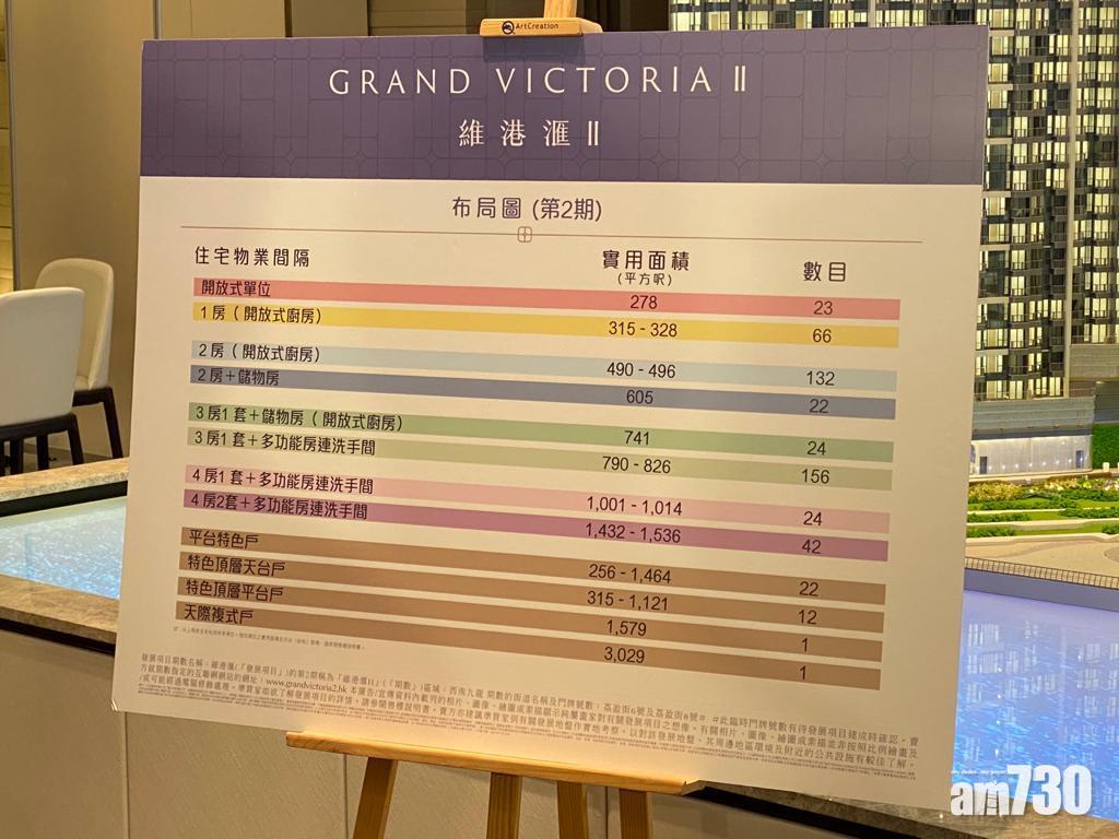 此外,特色單位戶型涵蓋22伙平台特色戶、12伙特色頂層天台戶、1伙特色頂層平台戶及1伙天際複式戶,實用面積由256至3,029方呎。