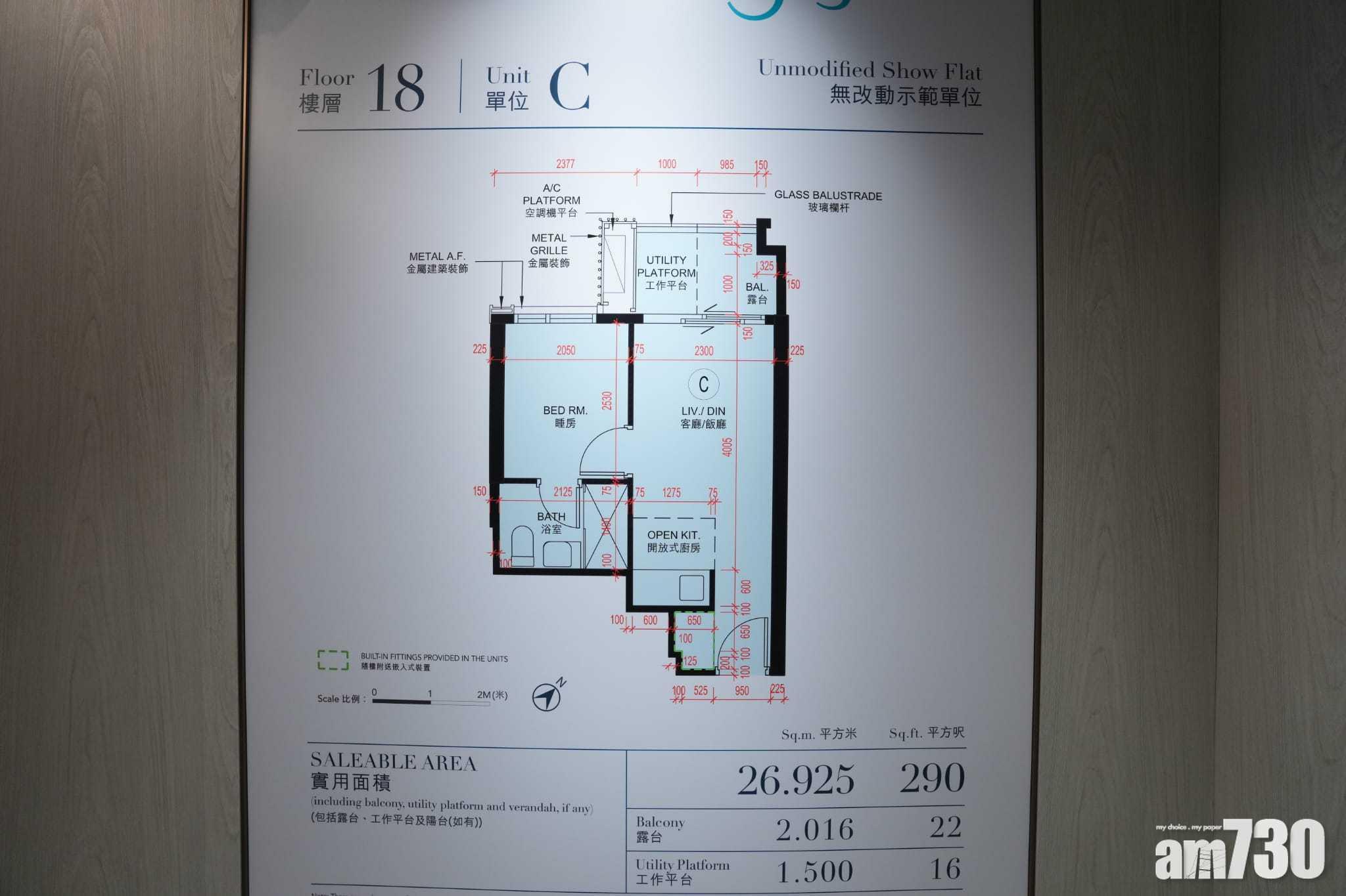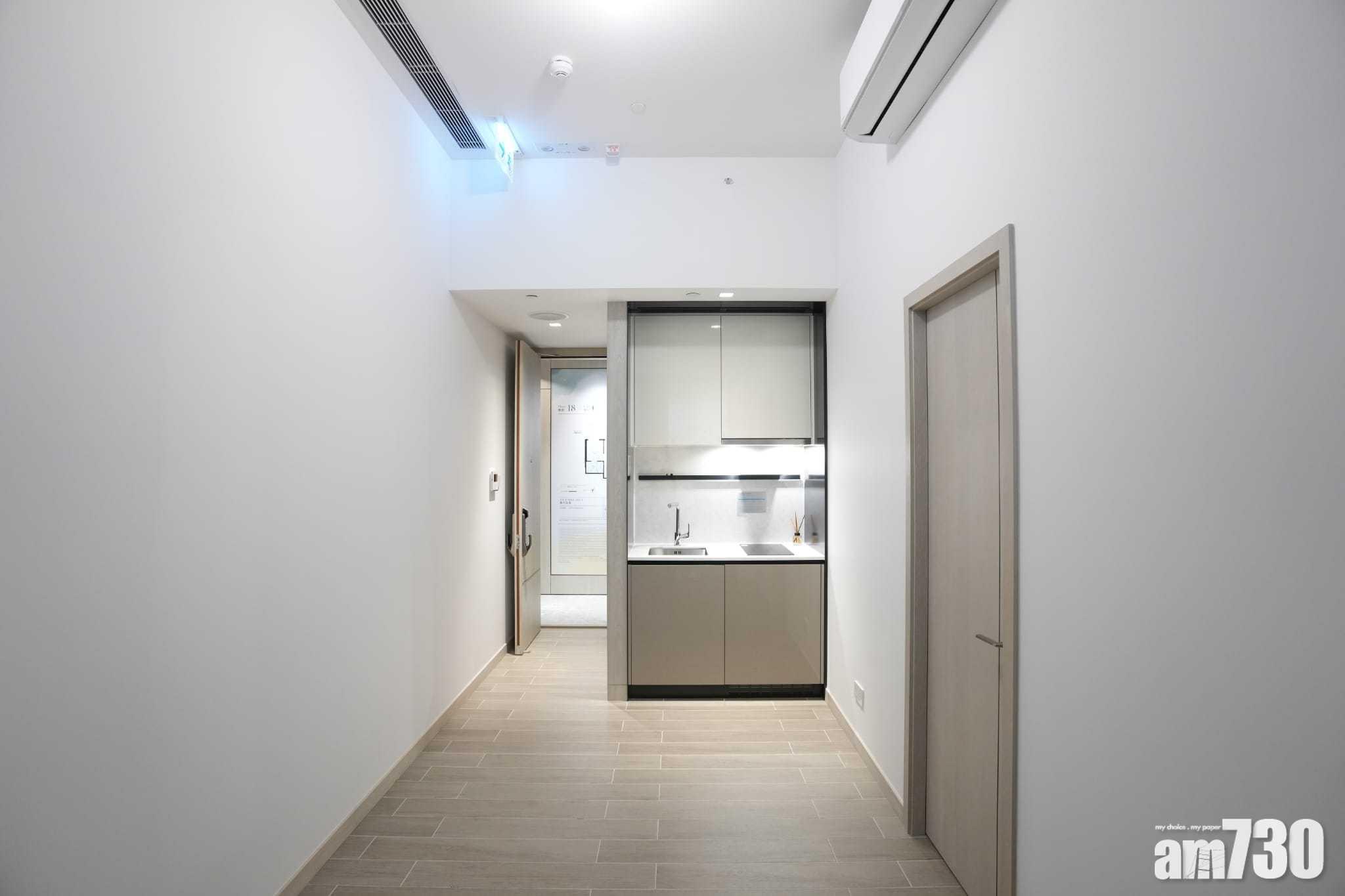 發展商今日首度開放項目一房無改動示範單位,為18樓C單位,實用面積290方呎,特高樓層高達3.5米,配以落地玻璃趟門引進自然光,空間感十足。大門設有韓國Samsung電子門鎖,出入口附近位置設有嵌入式置物櫃,增加儲物空間。旁邊為開放式廚房,配備著名廚具品牌Gorenje家電,包括電磁爐、抽油煙機、洗衣乾衣機、雪櫃等。