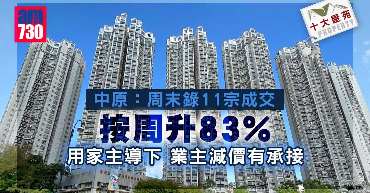 中原地產公布,十大屋苑本周末錄得11宗成交,按周回升83.3%。零成交屋苑錄4個,分別為康怡花園、海怡半島、美孚新邨及黃埔花園。