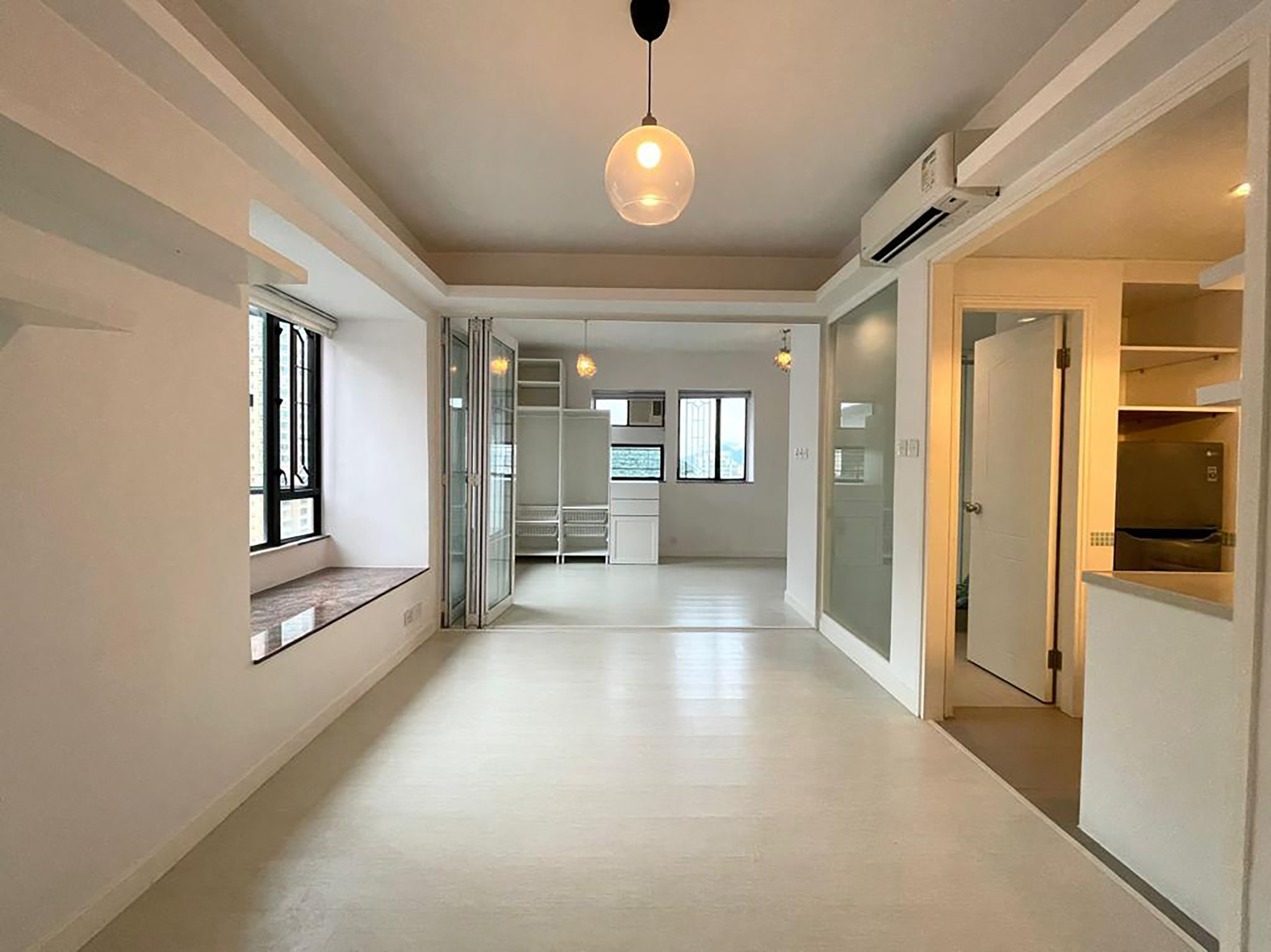 雖然單位實用面積只有404方呎,但單位無走廊的間隔,配合透明大玻璃趟門作廳房分隔的設計,以及開放式廚房和磨砂玻璃設計的浴室,巧妙地令單位的穿透感和空間感大增。
