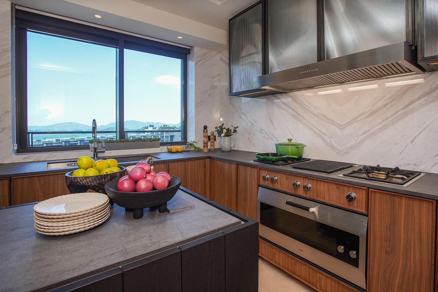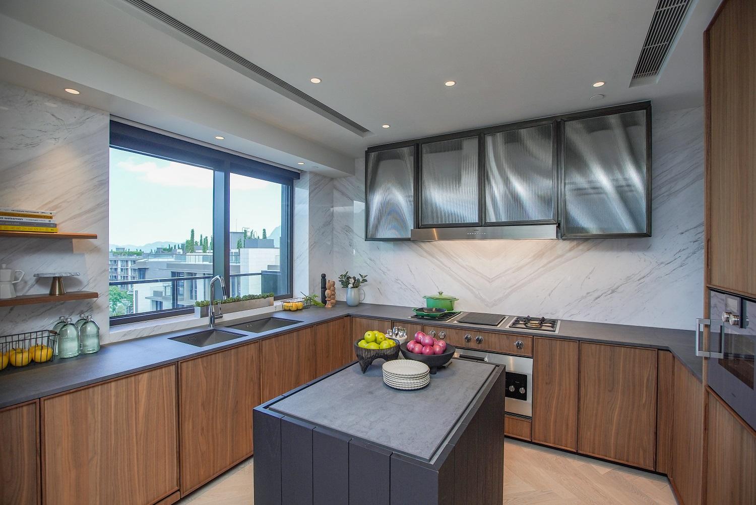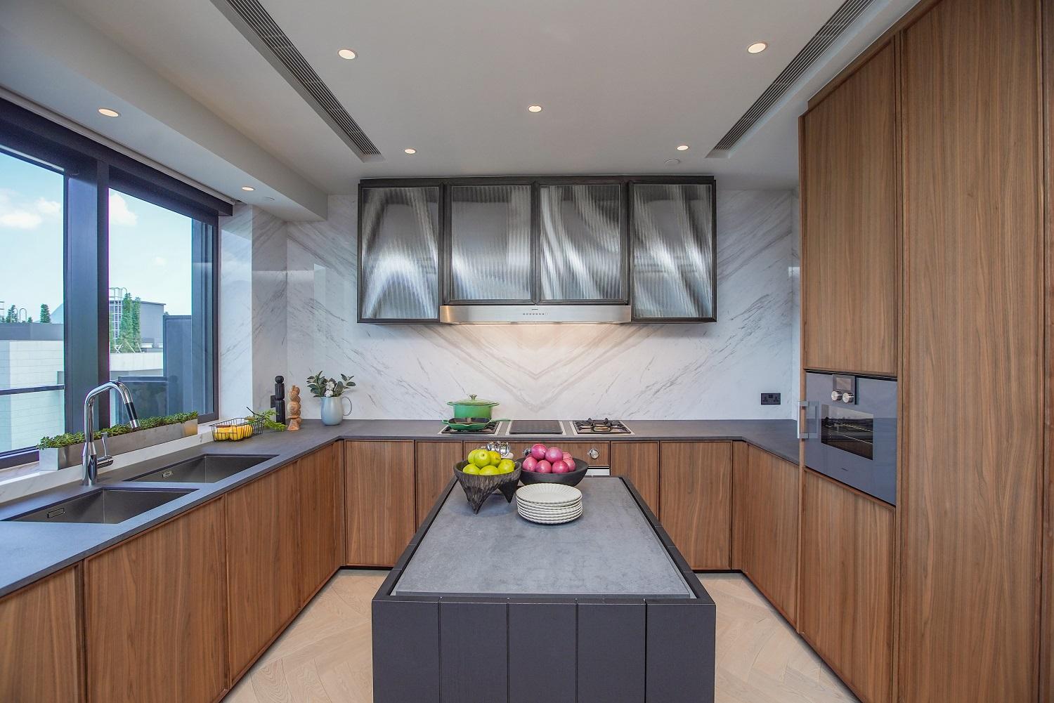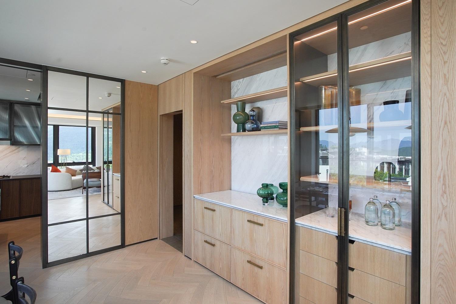 單位間隔方正,客飯廳實用面積逾600方呎,客飯廳分明,闊度逾8.2米,加上高樓底設計,層與層之間的高度有3.38米高。設計師把客飯廳相鄰的家庭廳設計為個人品味空間,供戶主與好友一起欣賞自己喜歡的音樂及收藏。廚房採開放式設計,配備廚具設備及廚櫃組合,色調配襯得宜,格調高雅,更設中島備餐空間。