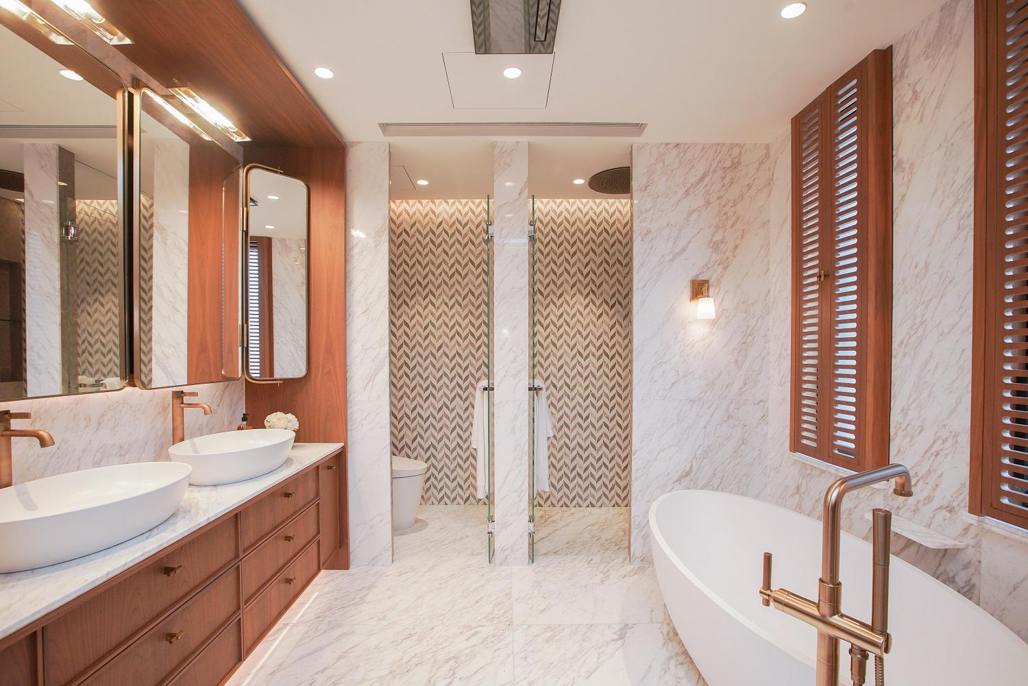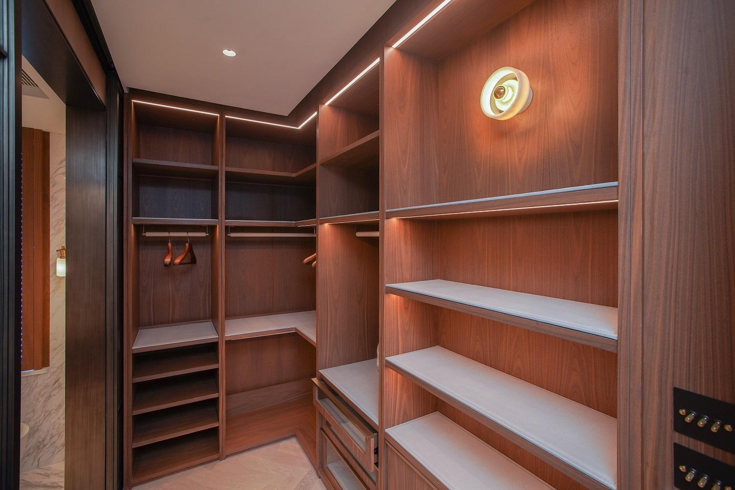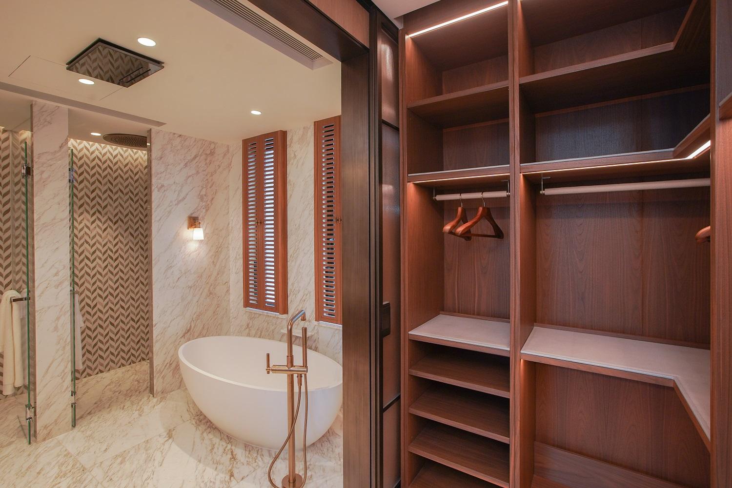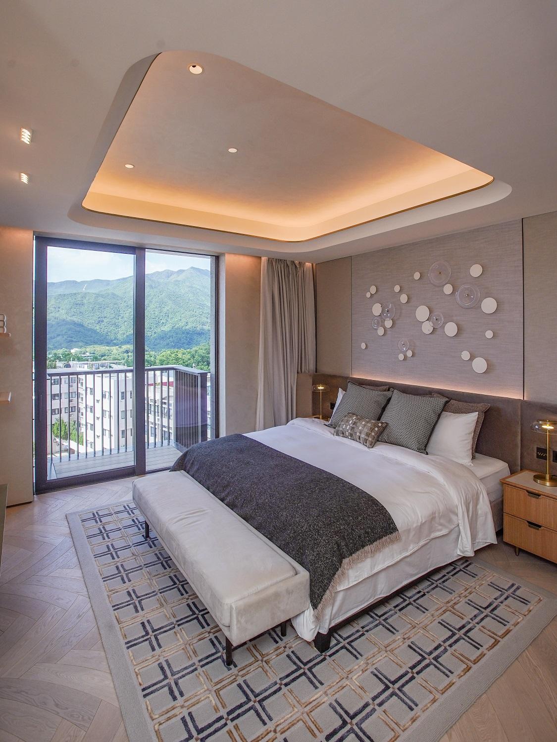 主人套房設廣闊大窗,實用面積逾400方呎,間隔靈活闊落,放置雙人大床後仍可三邊落床。房內更預留特大衣帽室,角落作為梳妝枱後的儲物空間。主人套房浴室為明廁設計,備有雙鋅盤、浴缸及扇形大理石牆淋浴間。至於私人天台以內置樓梯連接,天台長度逾17米。