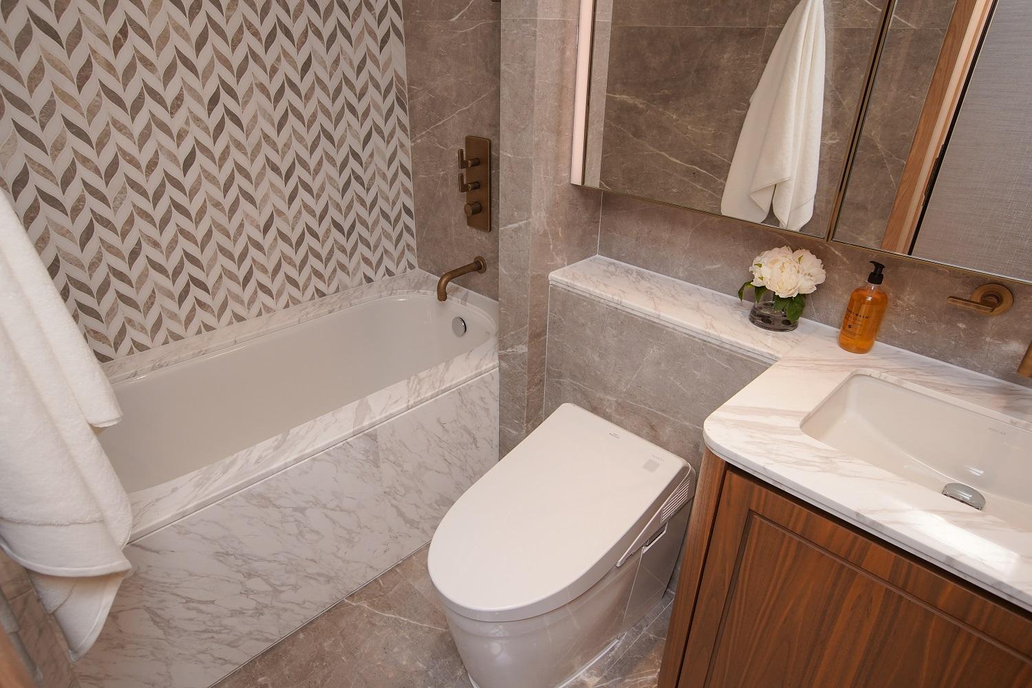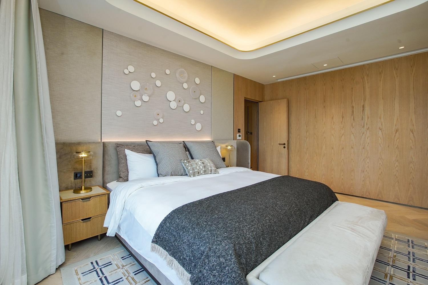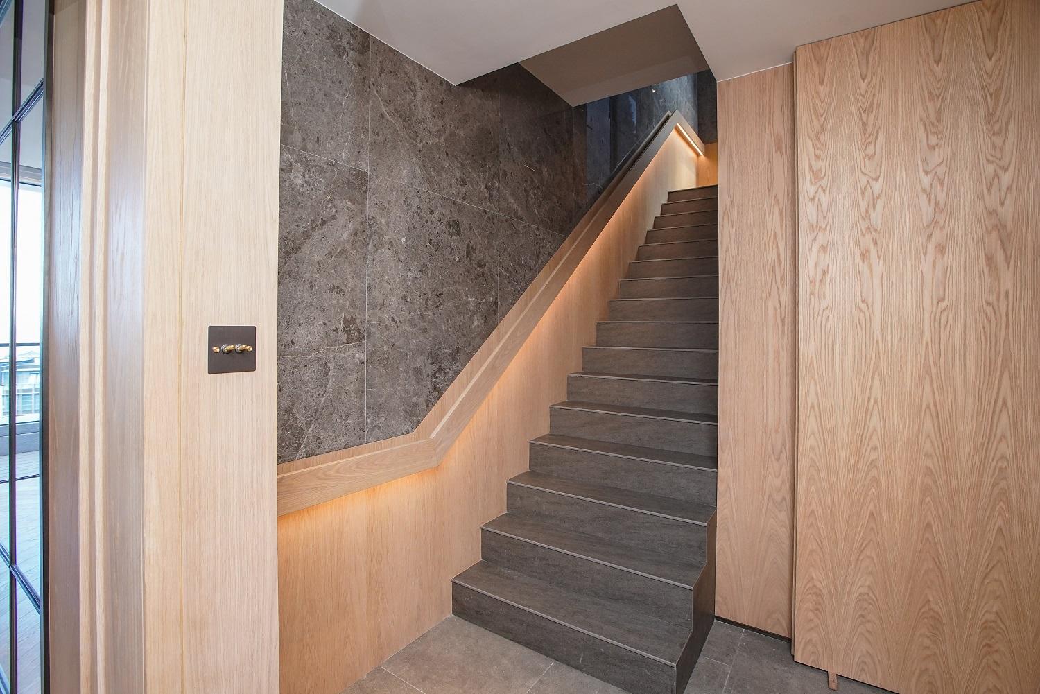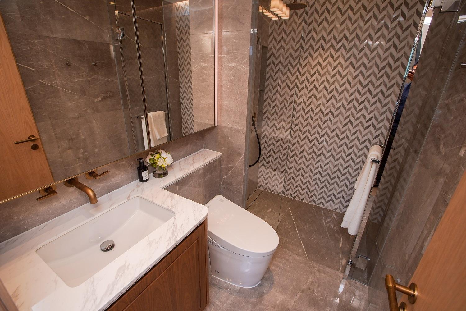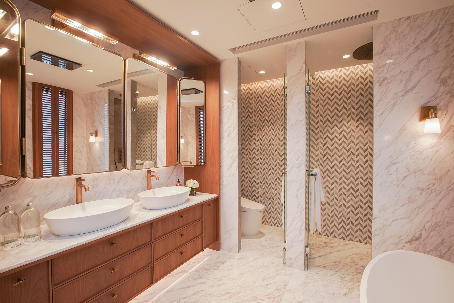 主人套房設廣闊大窗,實用面積逾400方呎,間隔靈活闊落,放置雙人大床後仍可三邊落床。房內更預留特大衣帽室,角落作為梳妝枱後的儲物空間。主人套房浴室為明廁設計,備有雙鋅盤、浴缸及扇形大理石牆淋浴間。至於私人天台以內置樓梯連接,天台長度逾17米。
