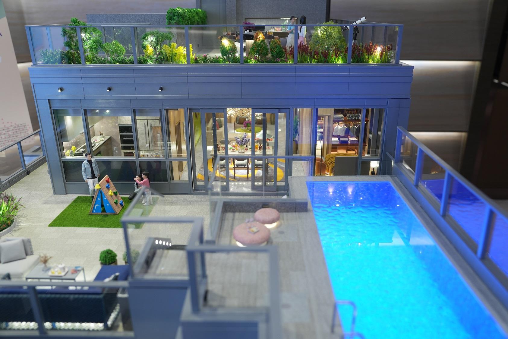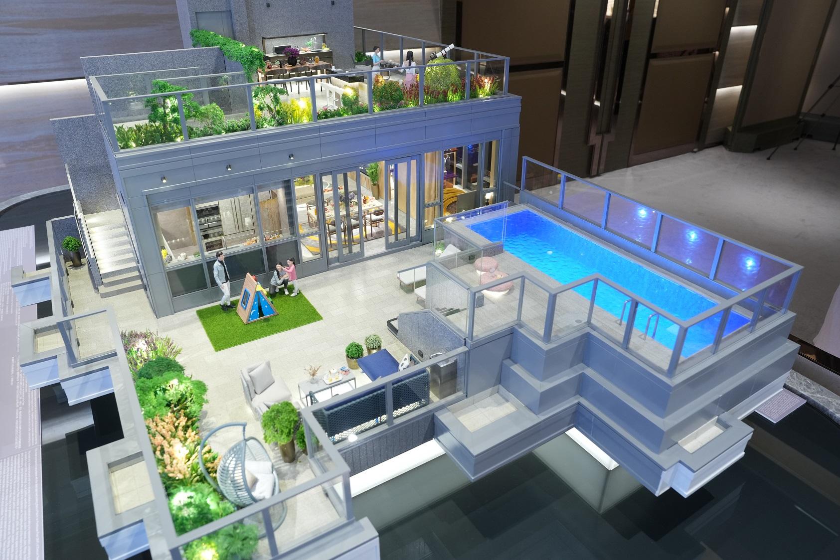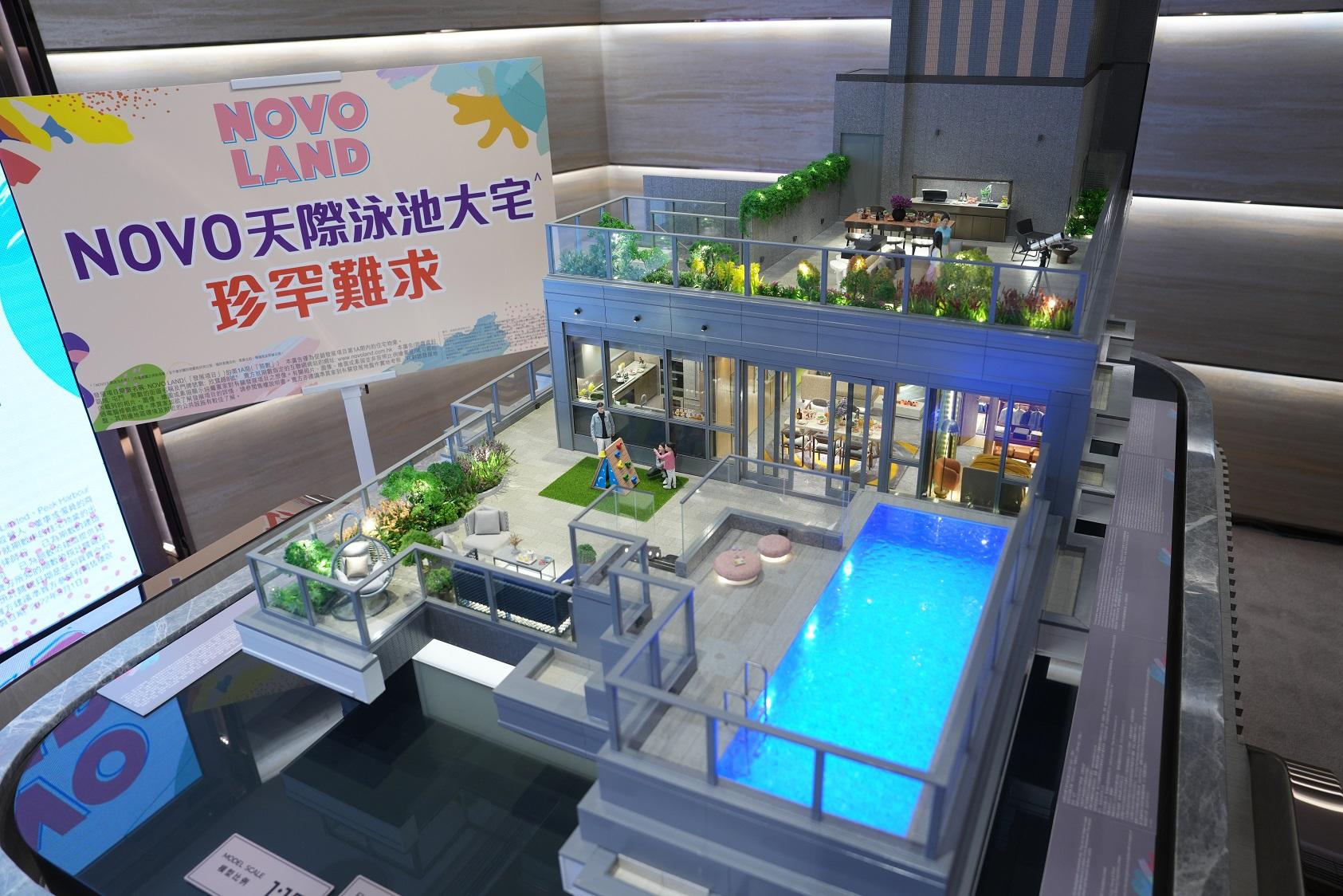 陳漢麟稱,項目2座住宅大樓共設8伙頂層天台特色戶,實用面積介乎1,020至1,467方呎,包括只提供2伙的「NOVO天際泳池大宅」,其中1伙位於第1座頂層35樓A1室,屬四房雙套連多用途房及洗手間間隔,實用面積1,290方呎,連1,060方呎平台連天際私人泳池,平台備有樓梯通往897方呎天台。值得一提,樓層與樓層之間的高度為3.65米及3.85米,而長形客飯廳連接戶外特大平台連戶外私人天際泳池,泳池長約7.465米、闊約2.515米。