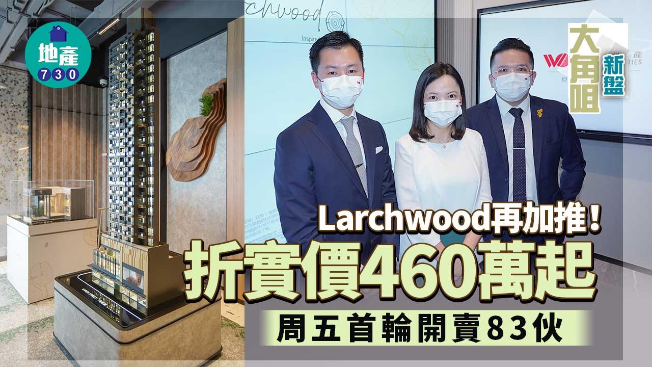 Larchwood位處大角咀洋松街62號,單幢式住宅提供187伙,戶型涵蓋開放式及一房,當中開放式佔114伙或約61%,實用面積介乎202至210方呎,一房共56伙,實用面積介乎250至267方呎;另有17伙屬特色單位。該盤預計入伙日期為2024年4月30日,樓花期長約21個月。該盤備有兩個示範單位,涵蓋開放式及一房戶型,設於尖沙咀天文臺道8號1樓,開放時間為中午12時至晚上8時。