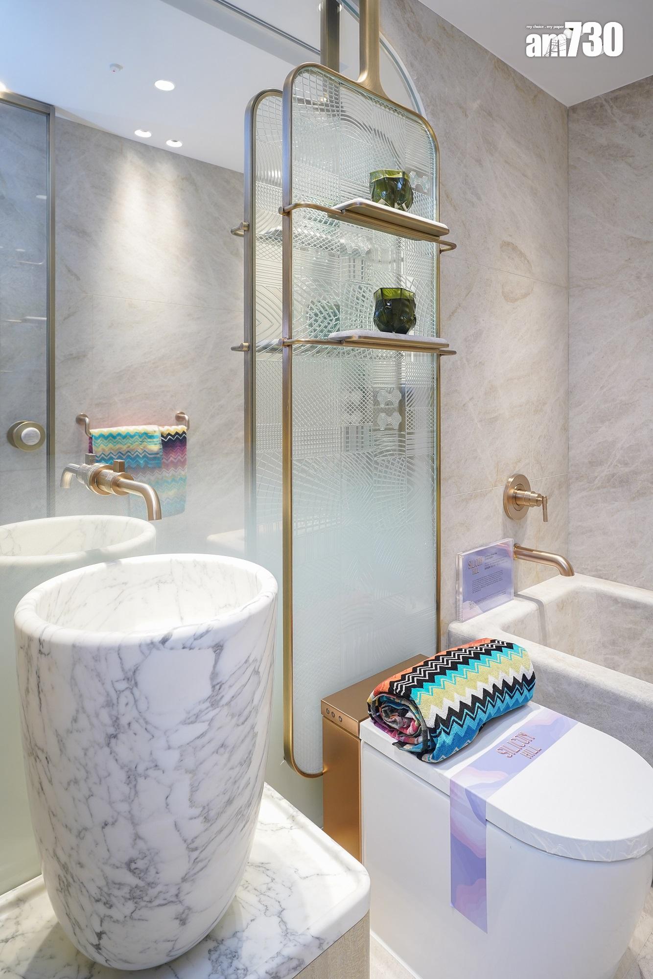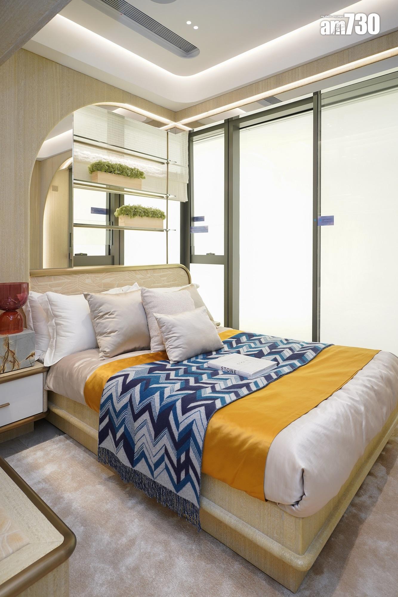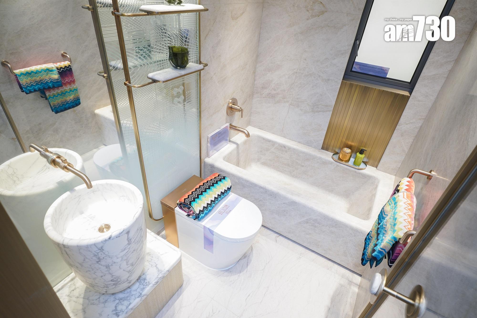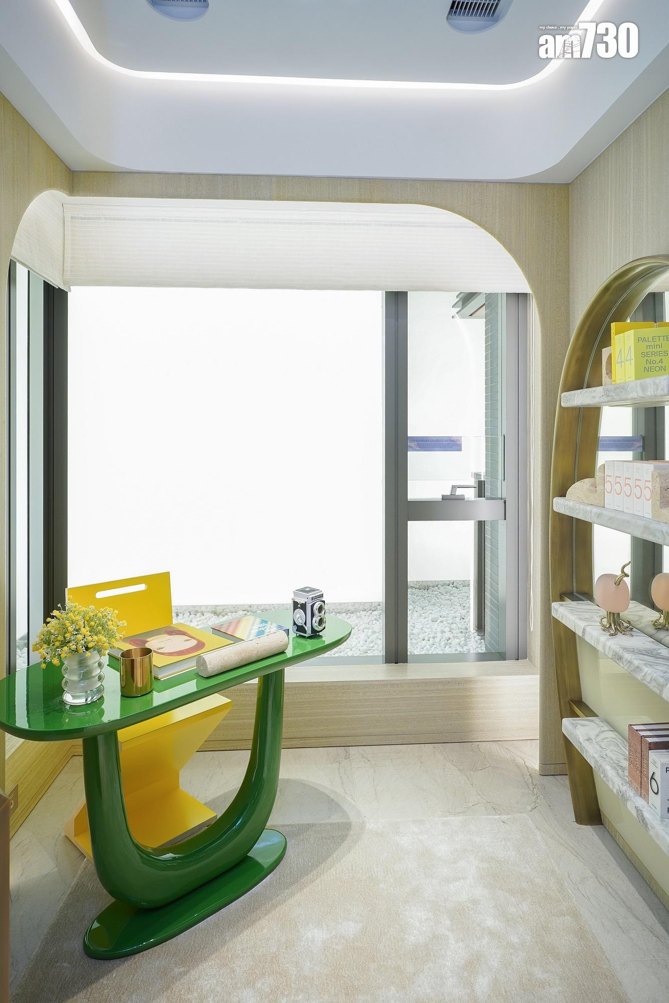 長形客飯廳設計,飯廳除擺放有趣形態的家具外,牆上更掛上最新的NFT藝術。書房及廚房門採特別訂製的波浪玻璃,配以弧型金屬門框,綠色高光書桌夠特別,配以有機形態之書架展示戶主喜愛的書籍。主人睡房亦採用流線型牆身設計,加上落地大窗,提升採光度,主人浴室採浴缸設計;而單位浴室採企缸設計,整體簡潔光亮。