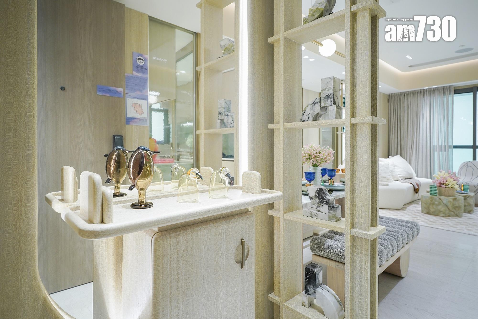 新地今日(14日)開放全新示範單位予傳媒參觀,單位以翠景閣第1座9樓B1室為藍本搭建,實用面積770方呎,屬三房連套房間隔。單位設計選用柔和色調,營造家的感覺。設計師改動玄關原有的高身儲物櫃,空間更見寬敞。
