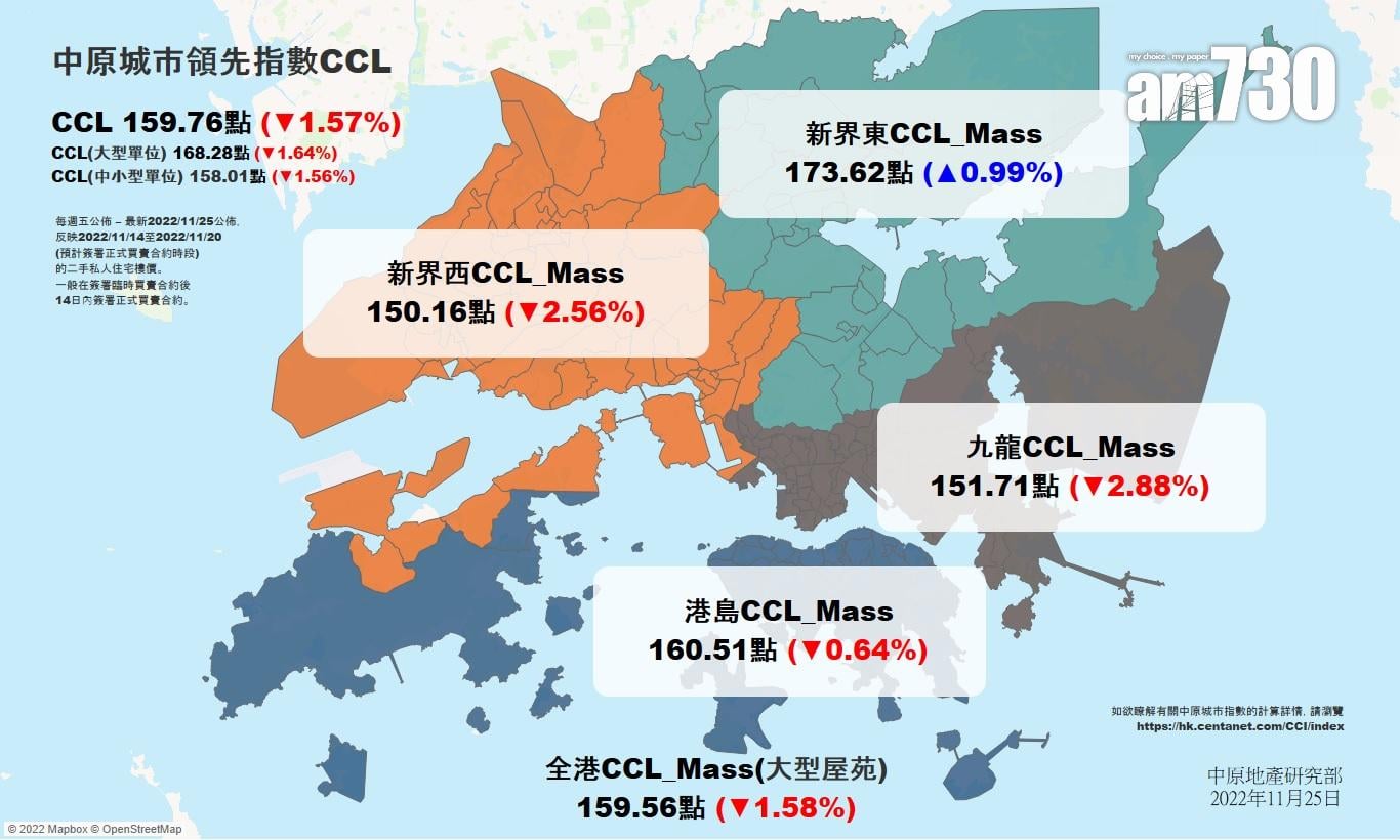 中原地產研究部高級聯席董事黃良昇指出,本周CCL、CCL Mass及CCL(中小型單位)齊跌破160點,是反映11月加息當周的市況。三大整體指數齊跌7周,樓價跌勢未止。如果市場沒有利好消息可以令短期樓價出現爭持,估計明年新春前後CCL將再下試144點支持位,走勢仍有待觀察。由2021年8月歷史高位(191.34點)計,CCL累跌16.5%。若與2021年12底相比,CCL今年累挫13.43%。