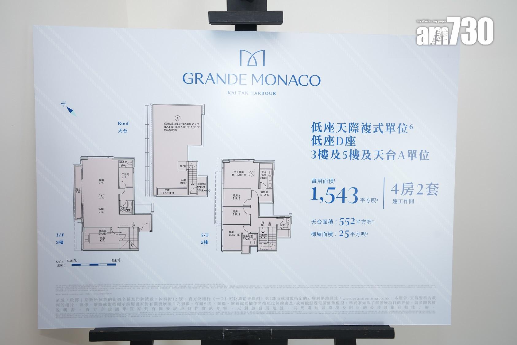 發展商最新開放兩個現樓示範單位,其中包括GRANDE MONACO Mansion D 35A室交樓標準示範單位,屬低座特色天台複式戶,全盤僅提供6伙,實用面積1,543方呎,四房連雙房套加工作間連廁設計,料聖誕假期開放予公眾參觀。
