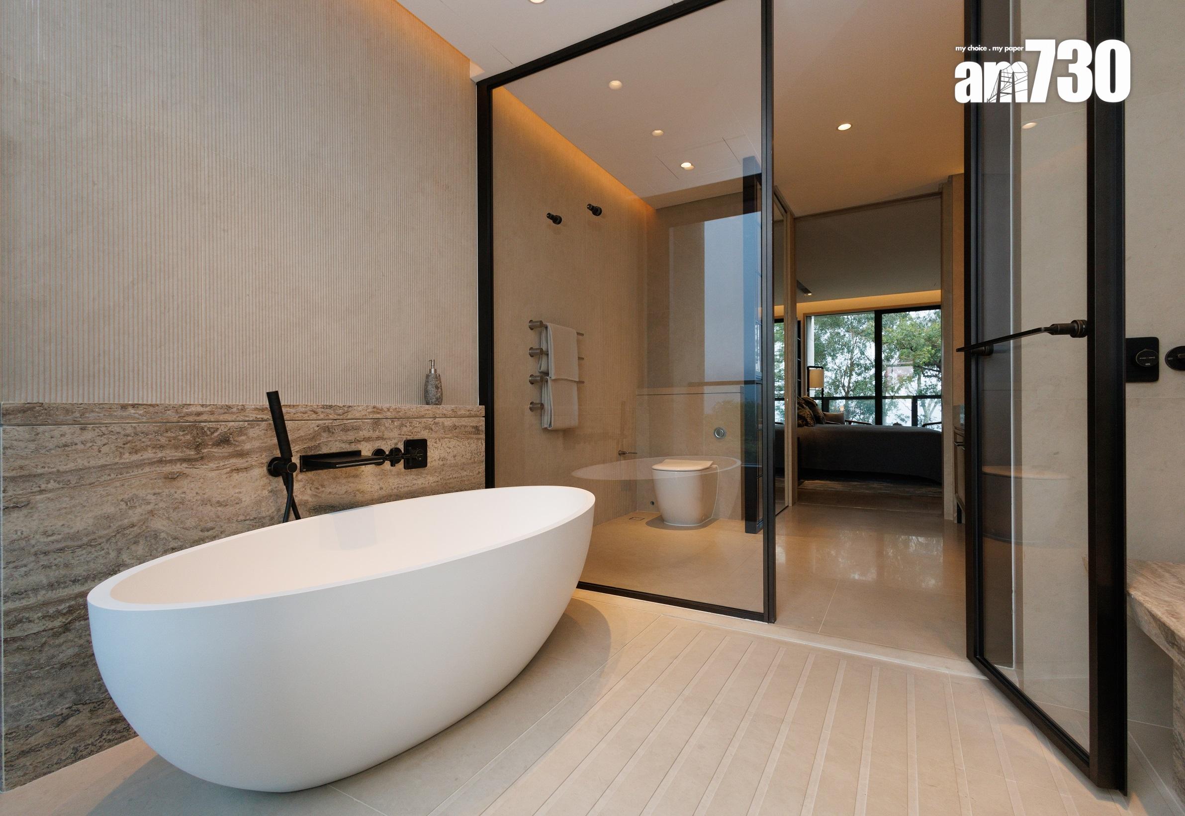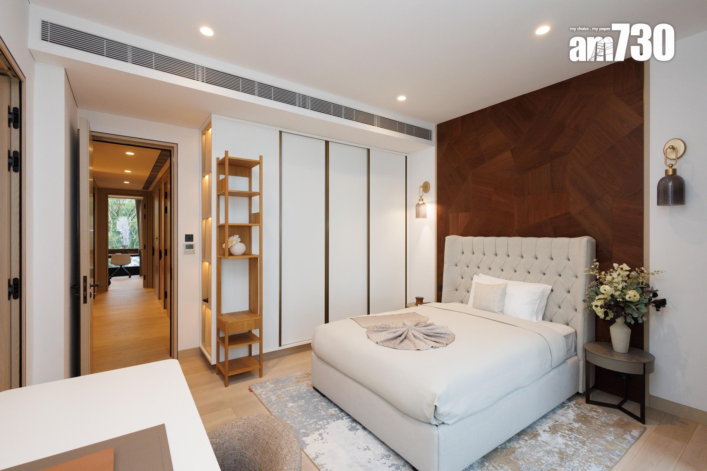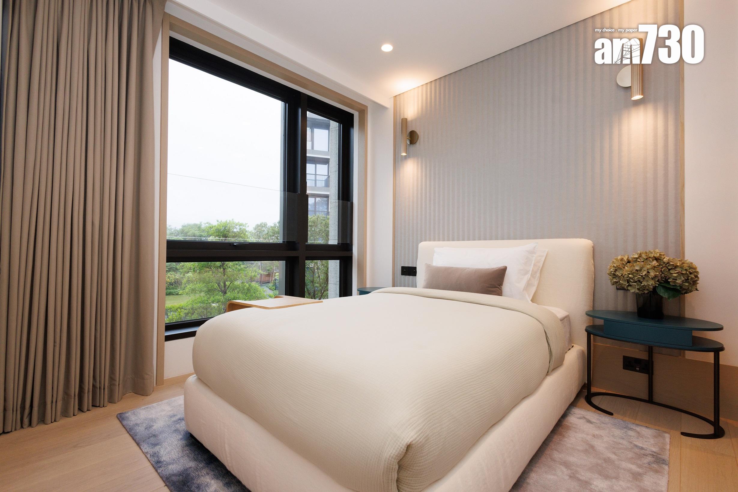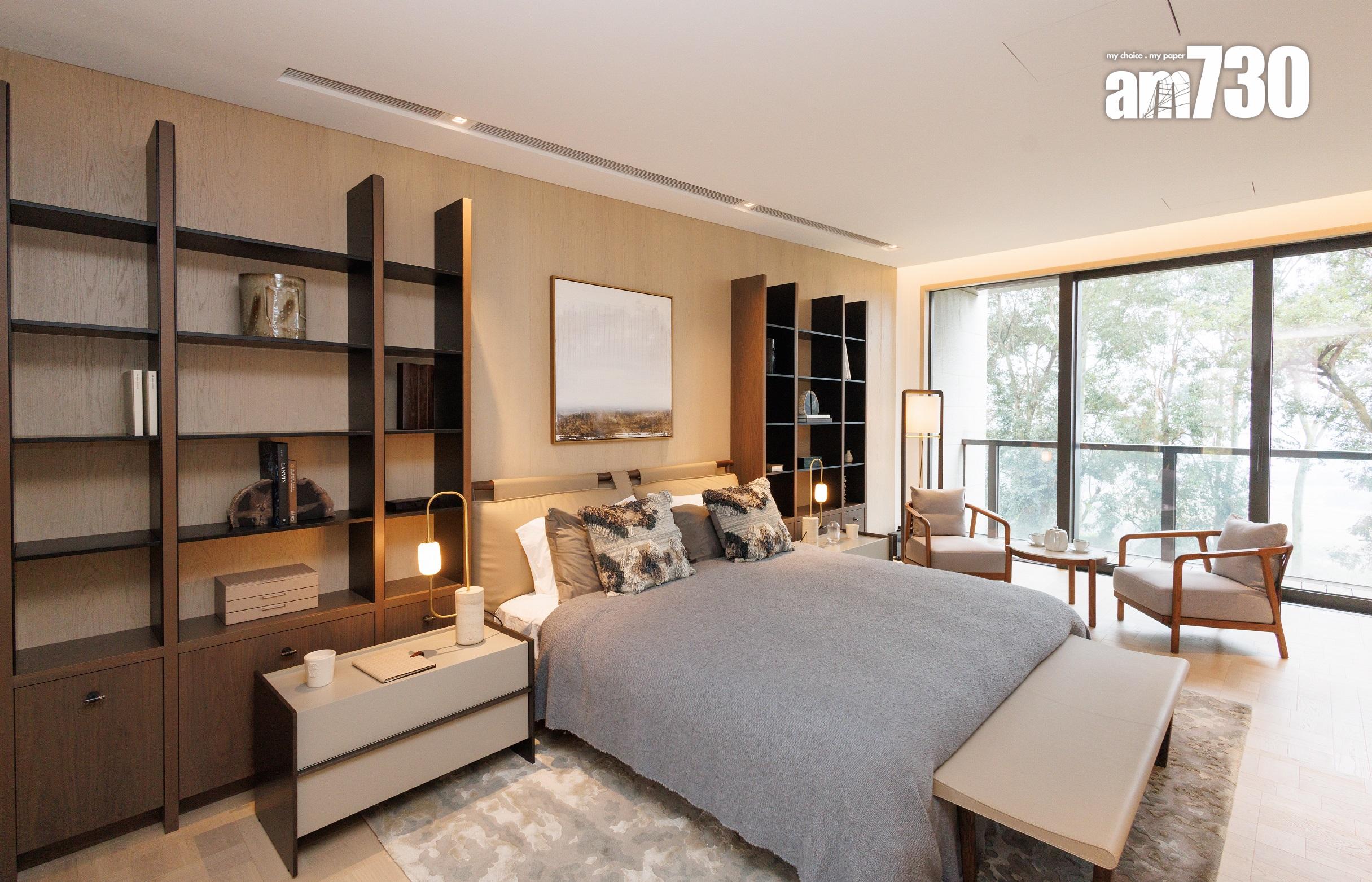 除了客飯廳和多個活動空間,設計師善用二樓主人睡房逾530方呎空間,包括寢室約300方呎、衣帽間近80方呎,以及浴室近150方呎,並將其中一間睡房設計為書房,打造成主人專屬層。主人房擺放大型雙人床後,仍可三邊落床及擺放床尾櫈。主人房設銀幕式趟窗,有助加強空氣流通;在窗前擺放兩張實木單人沙發及一張茶几,供住戶飽覽景致。睡房另一端接連浴室,配備雙洗手盤,加上刻意挑選的燈光效果,營造出如六星級酒店之典雅高貴。