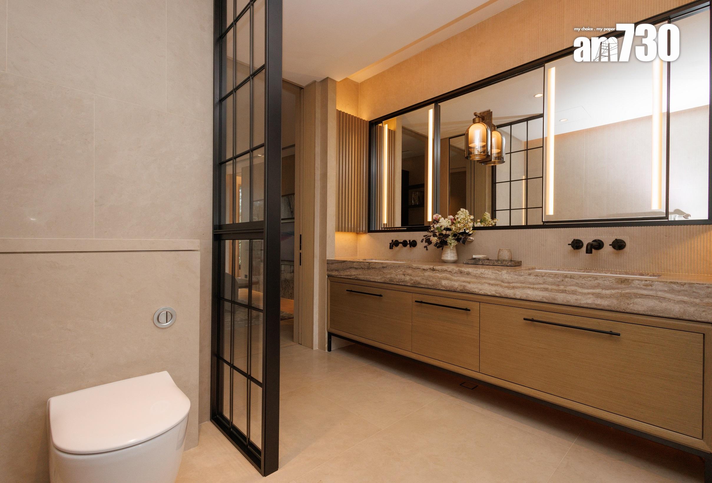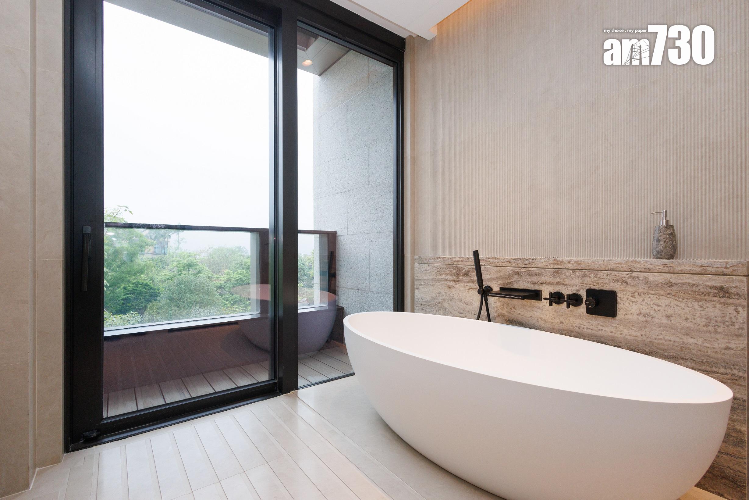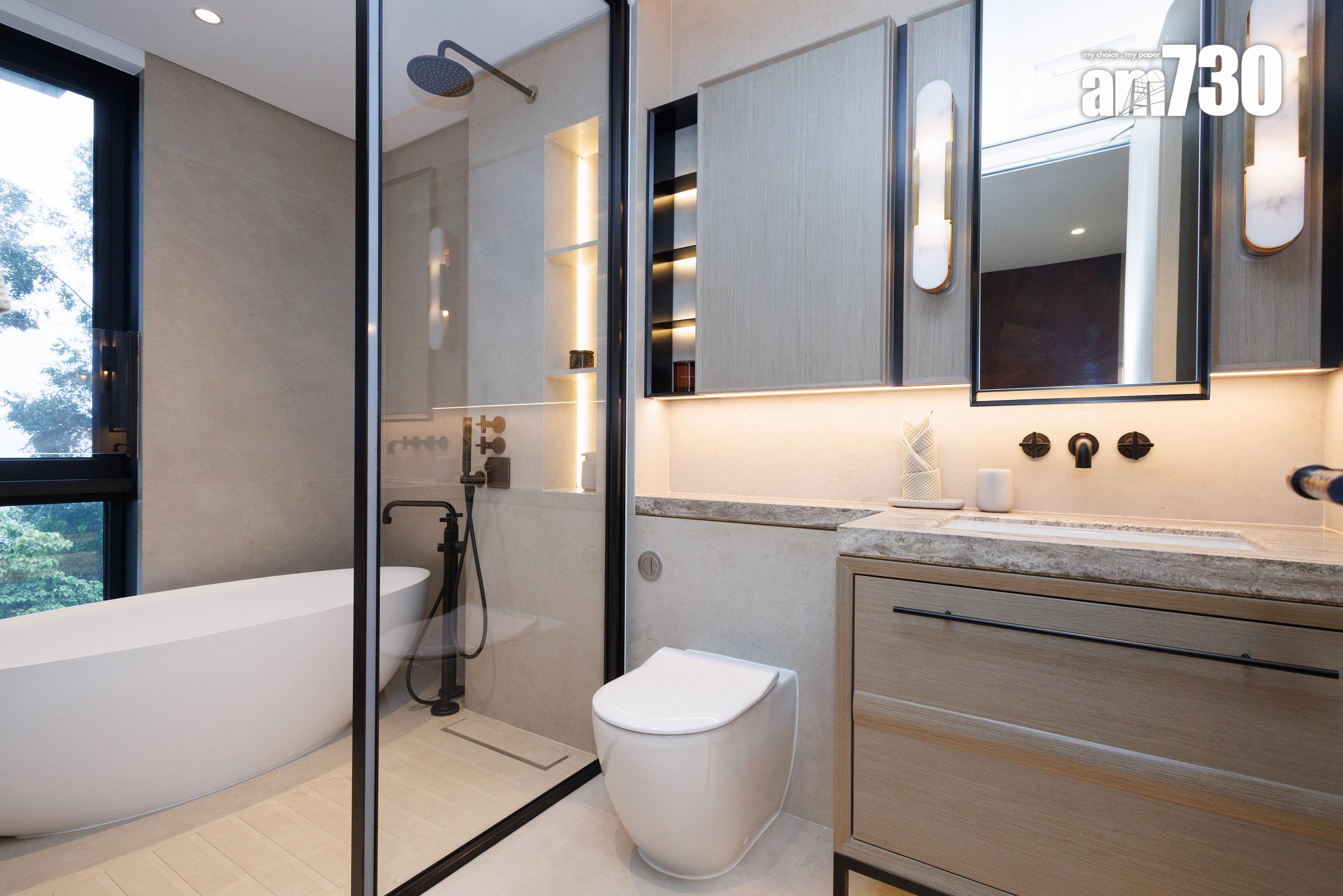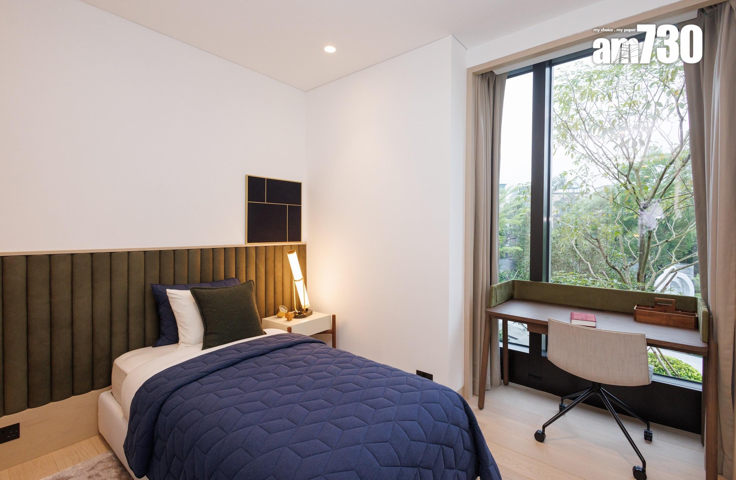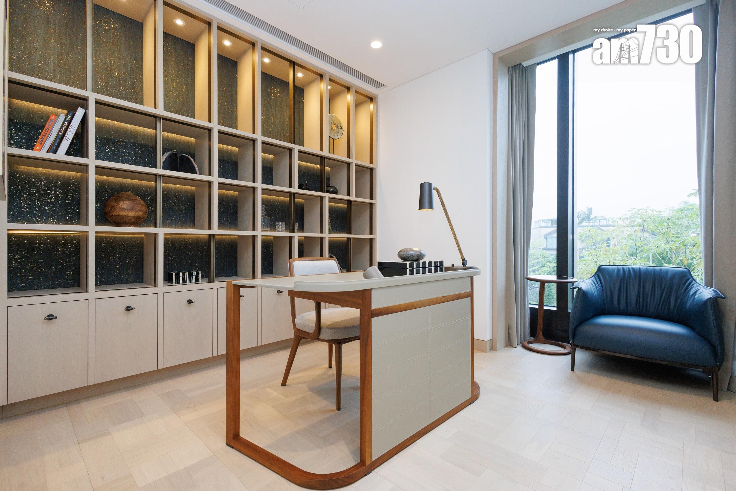 除了客飯廳和多個活動空間,設計師善用二樓主人睡房逾530方呎空間,包括寢室約300方呎、衣帽間近80方呎,以及浴室近150方呎,並將其中一間睡房設計為書房,打造成主人專屬層。主人房擺放大型雙人床後,仍可三邊落床及擺放床尾櫈。主人房設銀幕式趟窗,有助加強空氣流通;在窗前擺放兩張實木單人沙發及一張茶几,供住戶飽覽景致。睡房另一端接連浴室,配備雙洗手盤,加上刻意挑選的燈光效果,營造出如六星級酒店之典雅高貴。