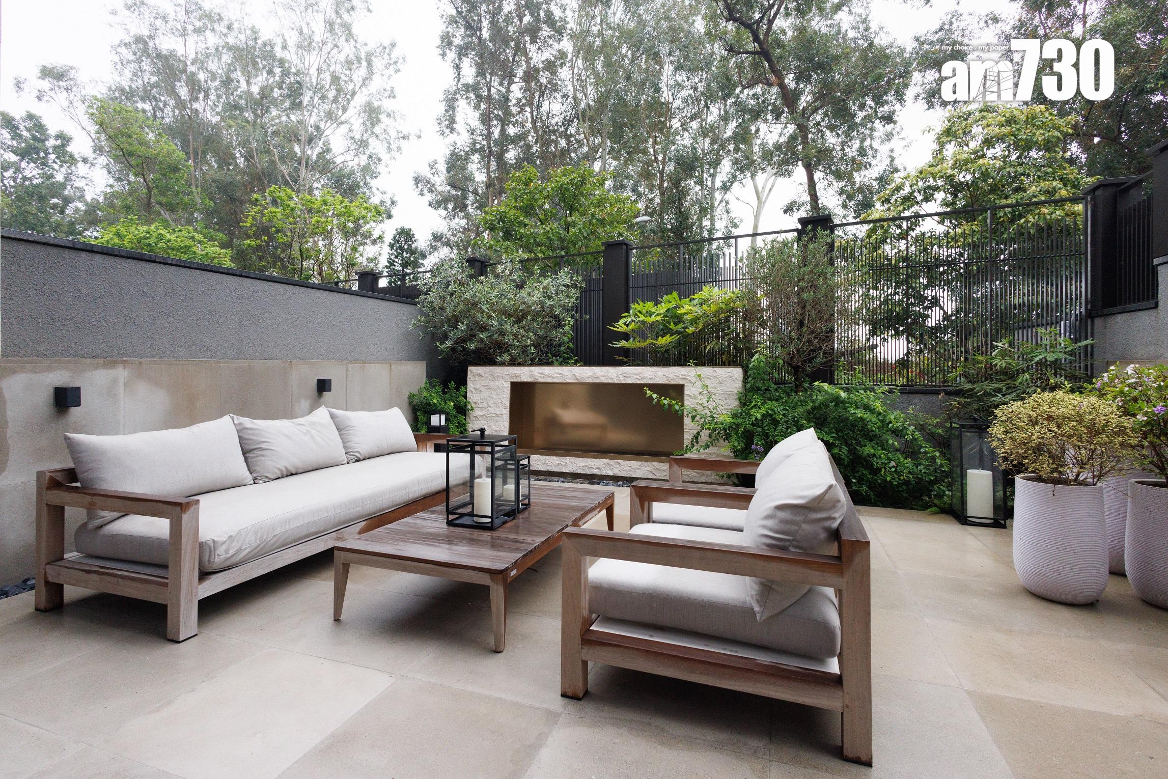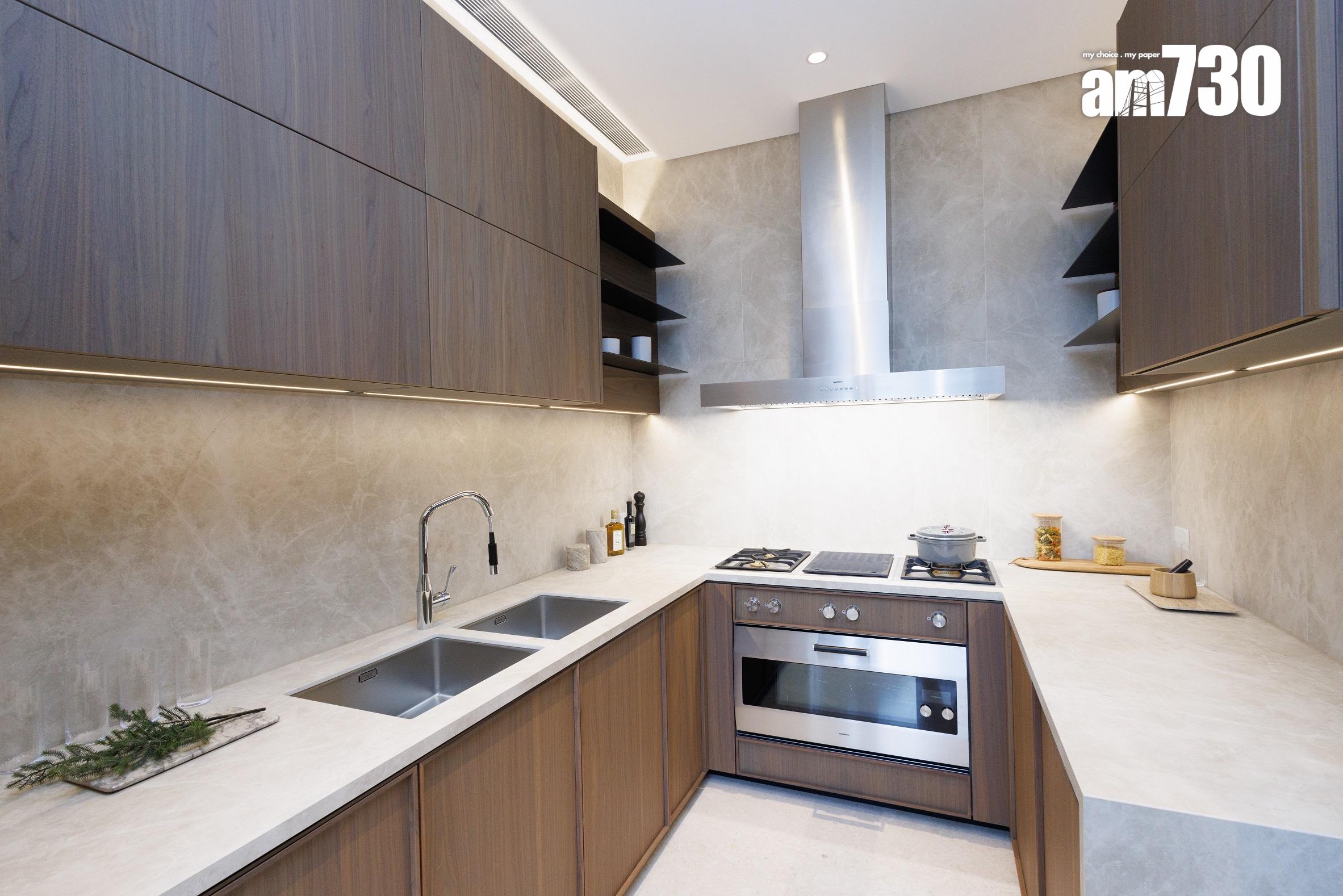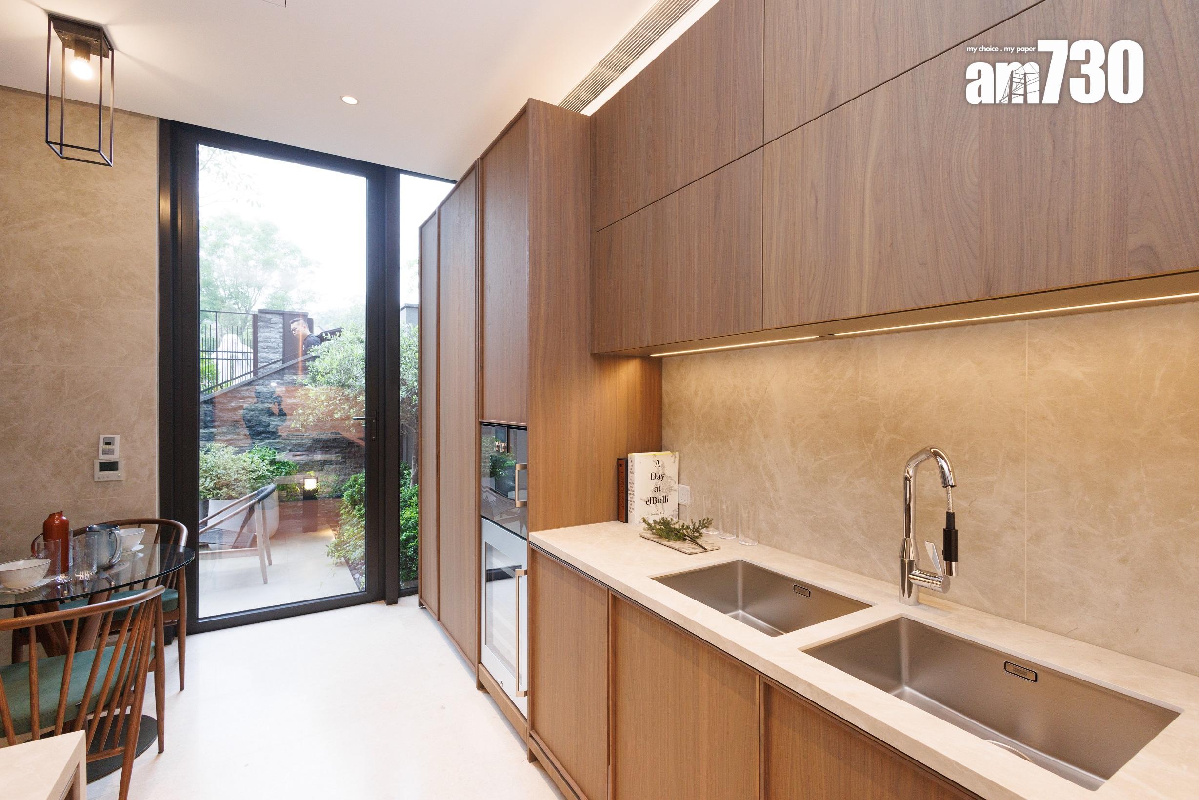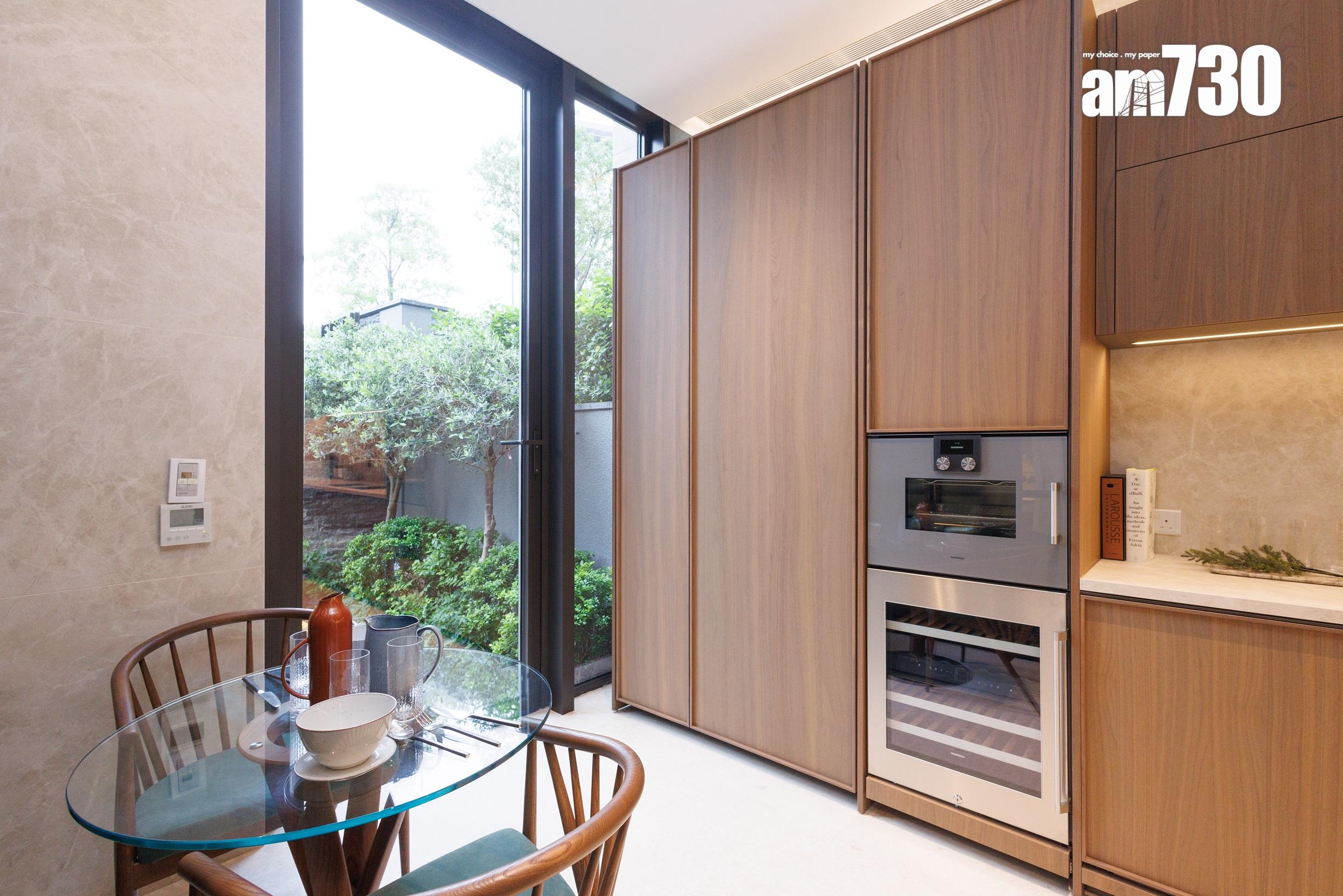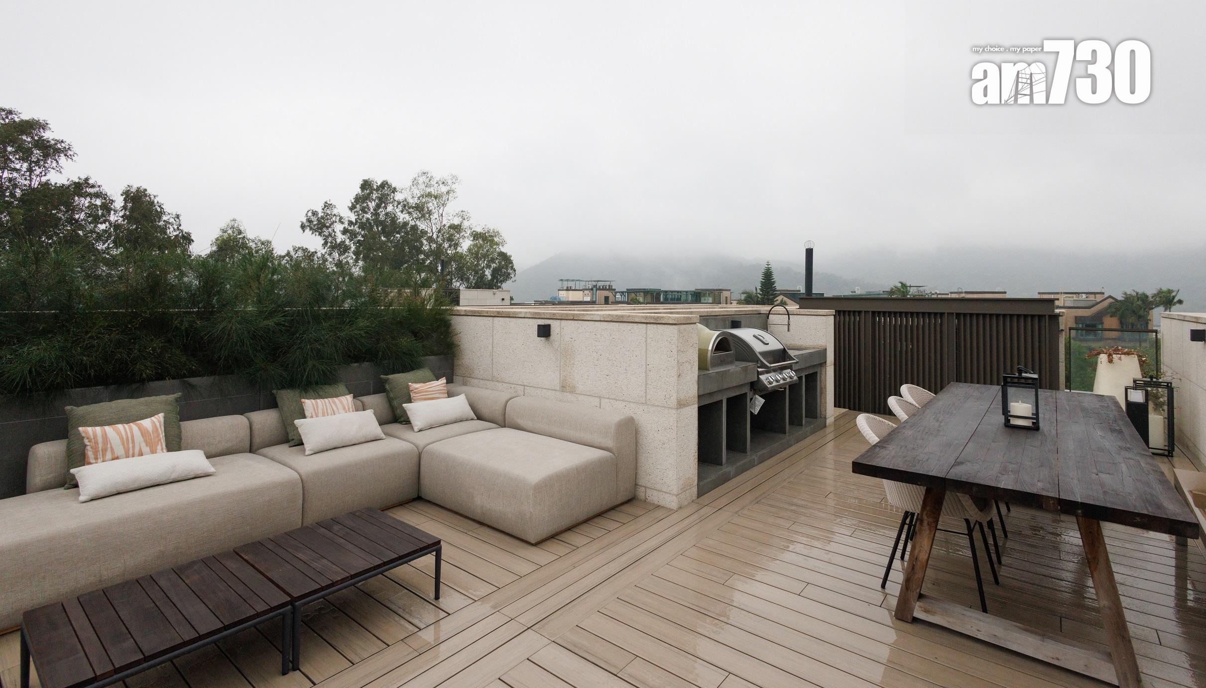 洋房前花園與面積近150方呎的特大廚房相連,設計師於廚房放置早餐桌,住戶可與家人邊享用早餐邊欣賞屋外花園。推開分隔的玻璃門,屋主即可將廚房延伸以舉行戶外派對。廚櫃採用意大利Moldunova的高級廚櫃組合,彰顯大戶氣派。天台的多用途生活空間,備有燒烤爐和烤薄餅爐。