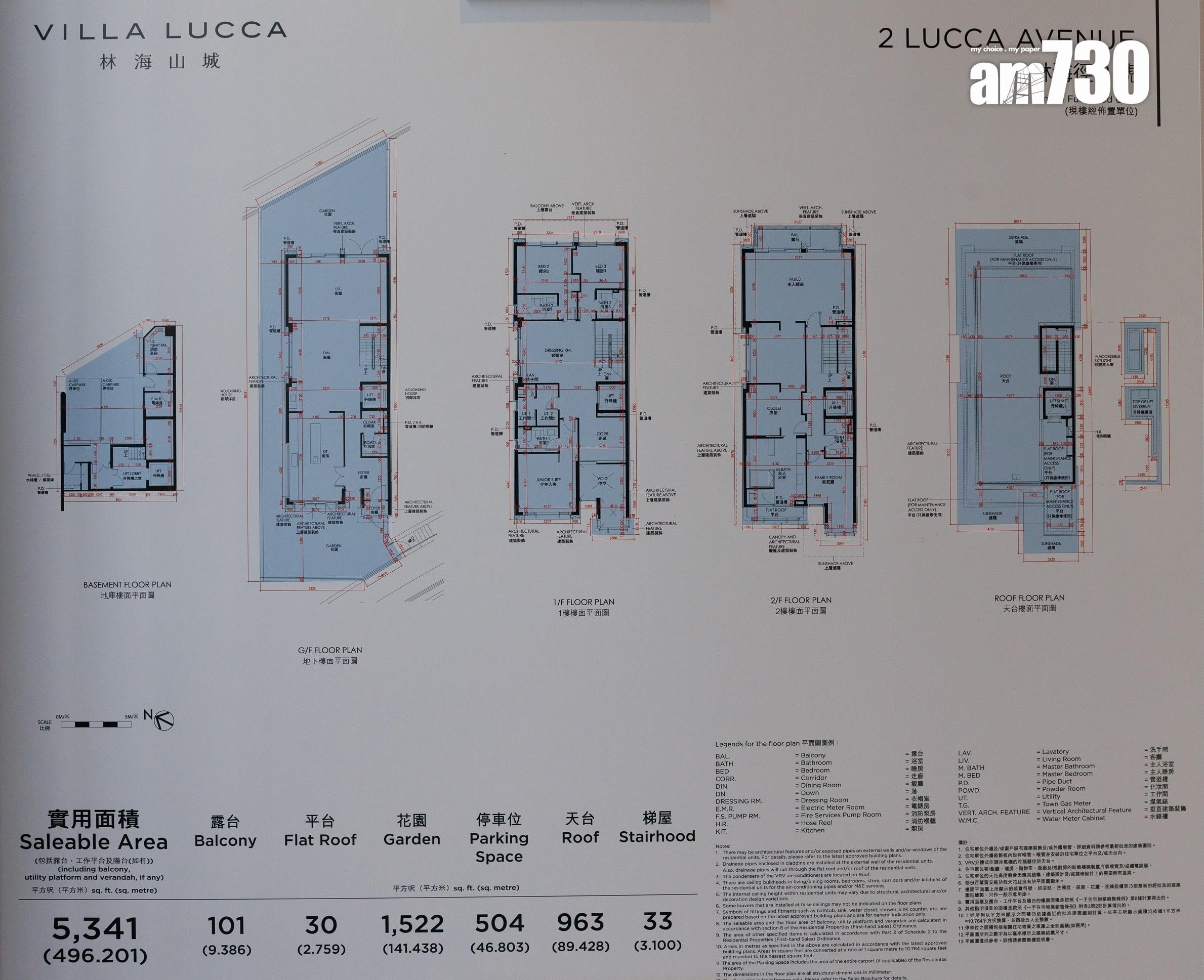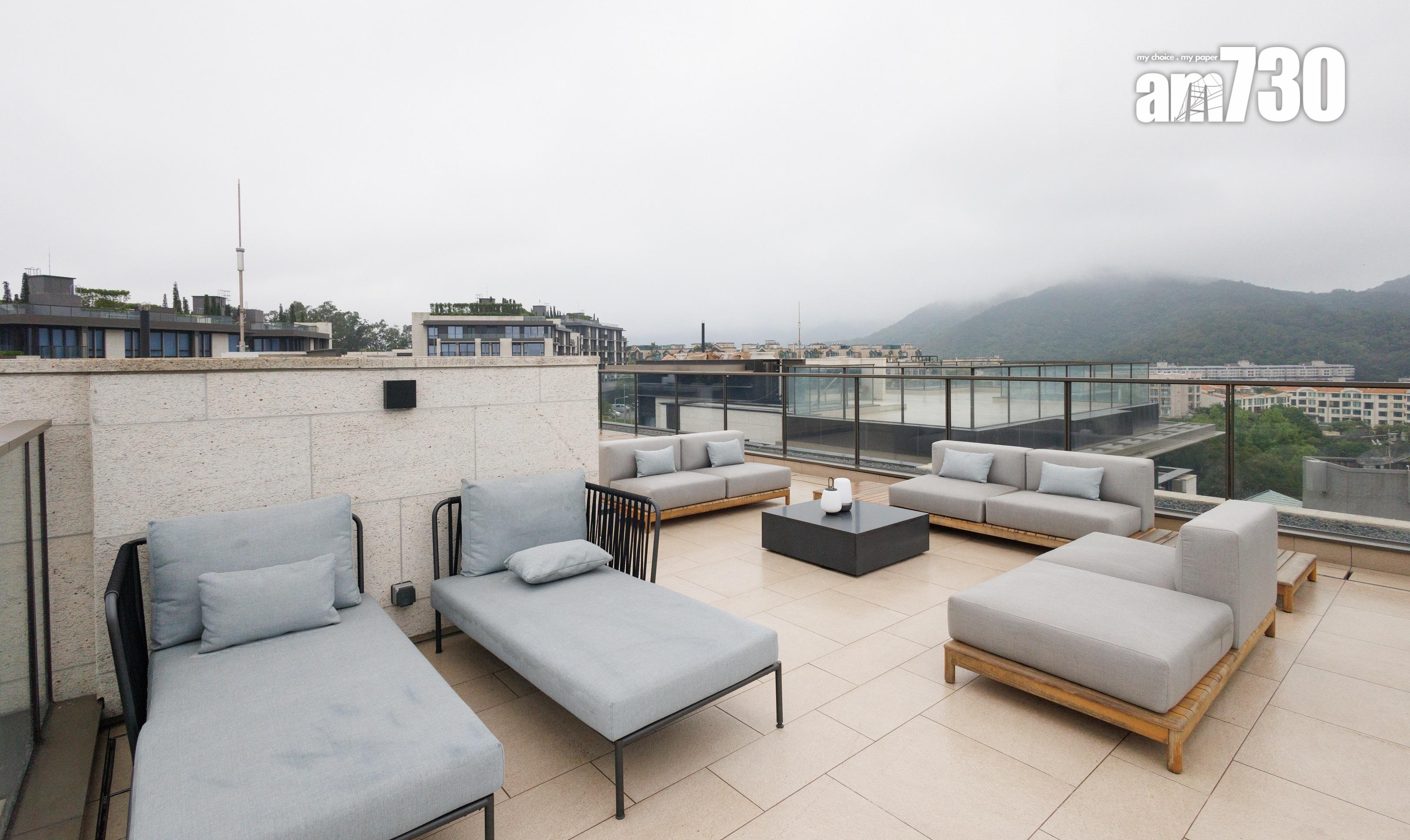 至於洋房地庫位置是歐洲古堡酒窖式設計車庫,佔地約500方呎,寓意佳釀與名車。車庫採用不同材質石材、鋼材與黑鏡,糅合於古堡式拱型門廊的空間設計,流露型格品味。頂層天台實面積963方呎,設有大型戶外梳化,供屋主隨時隨地與親朋好友閒聚小酌。