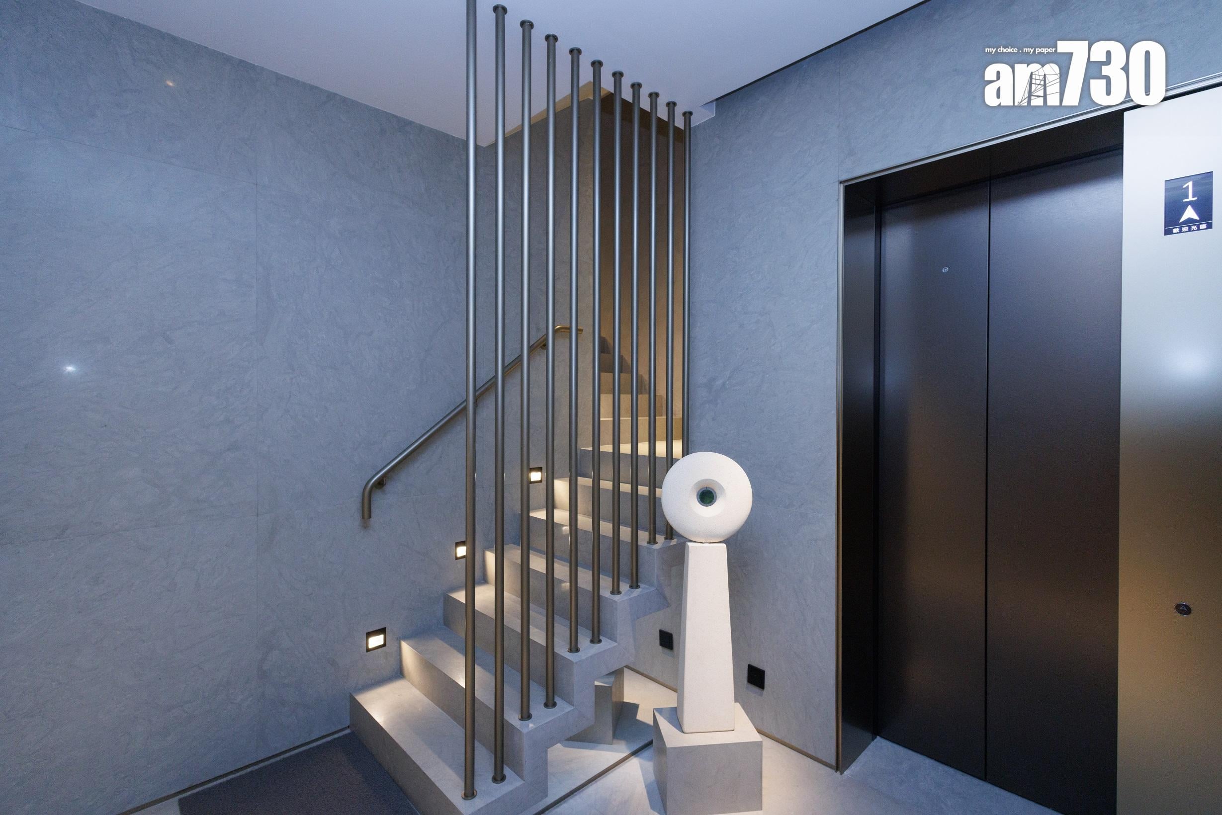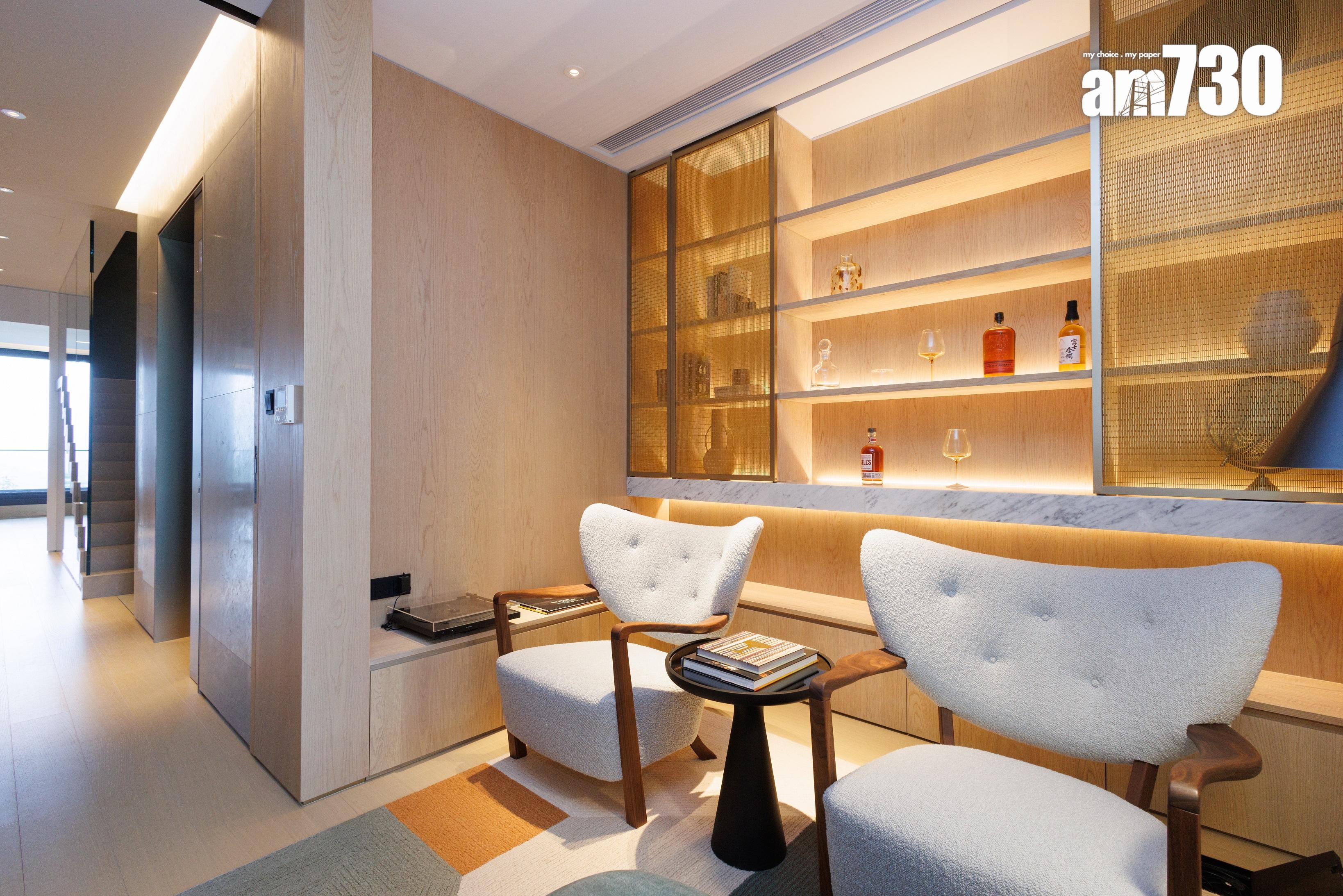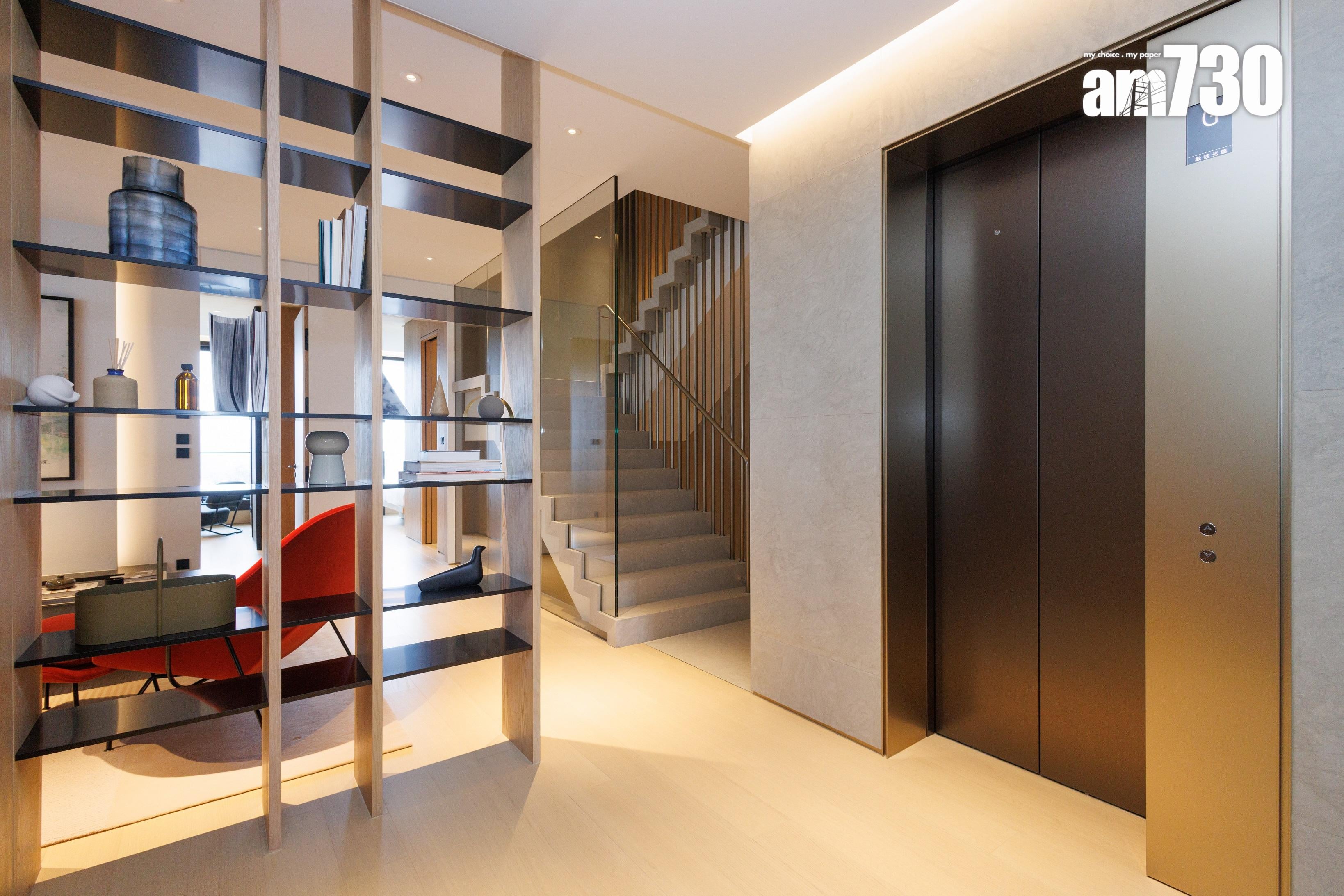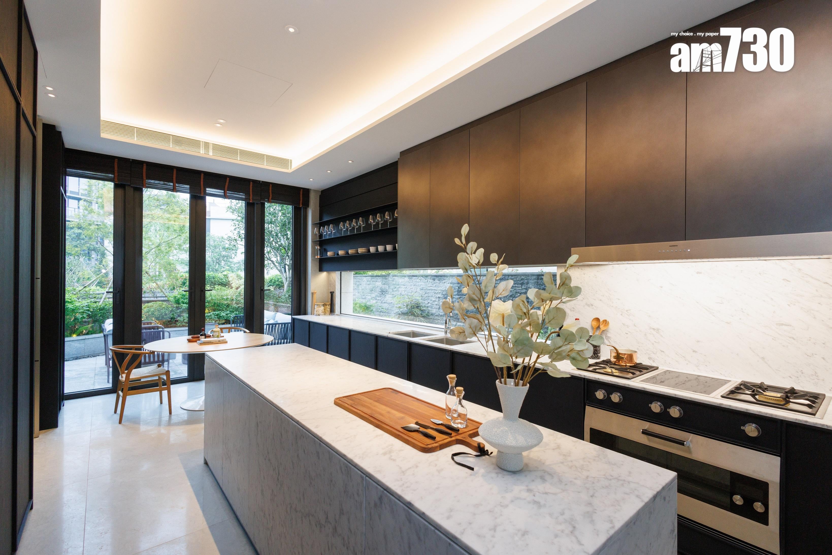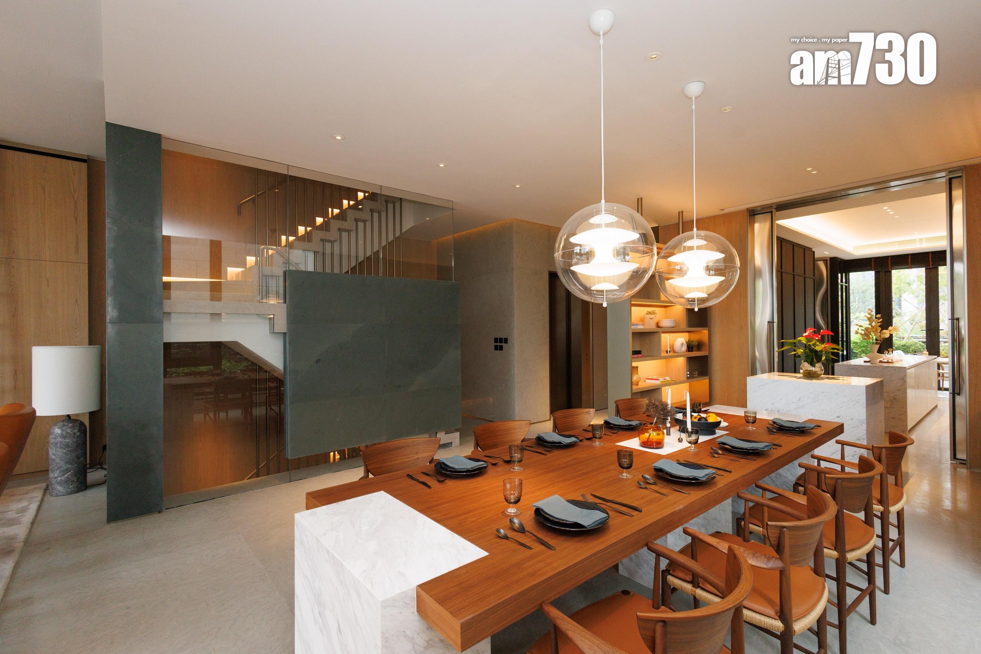 住戶步入家門,7.2米高樓底設計盡入眼簾,設計師刻意在入門玄關及玄關落地玻璃窗外望位置擺放一組型格的現代藝術雕塑作迎門。地下樓層是客飯廳和開放式廚房,布局呈L型設計,靠邊全是落地對流大玻璃窗,採光度十足兼可欣賞窗外的景色。地下樓層可作四個活動區域,迎合不同生活需要,分別是客廳、飯廳、酒吧區及廚房連輕食用餐區。客飯廳長度超過9米,面積超過640方呎;而廚房位置設有一扇門直通玄關位置,按需要關上分隔門可變成一個獨立烹調空間。