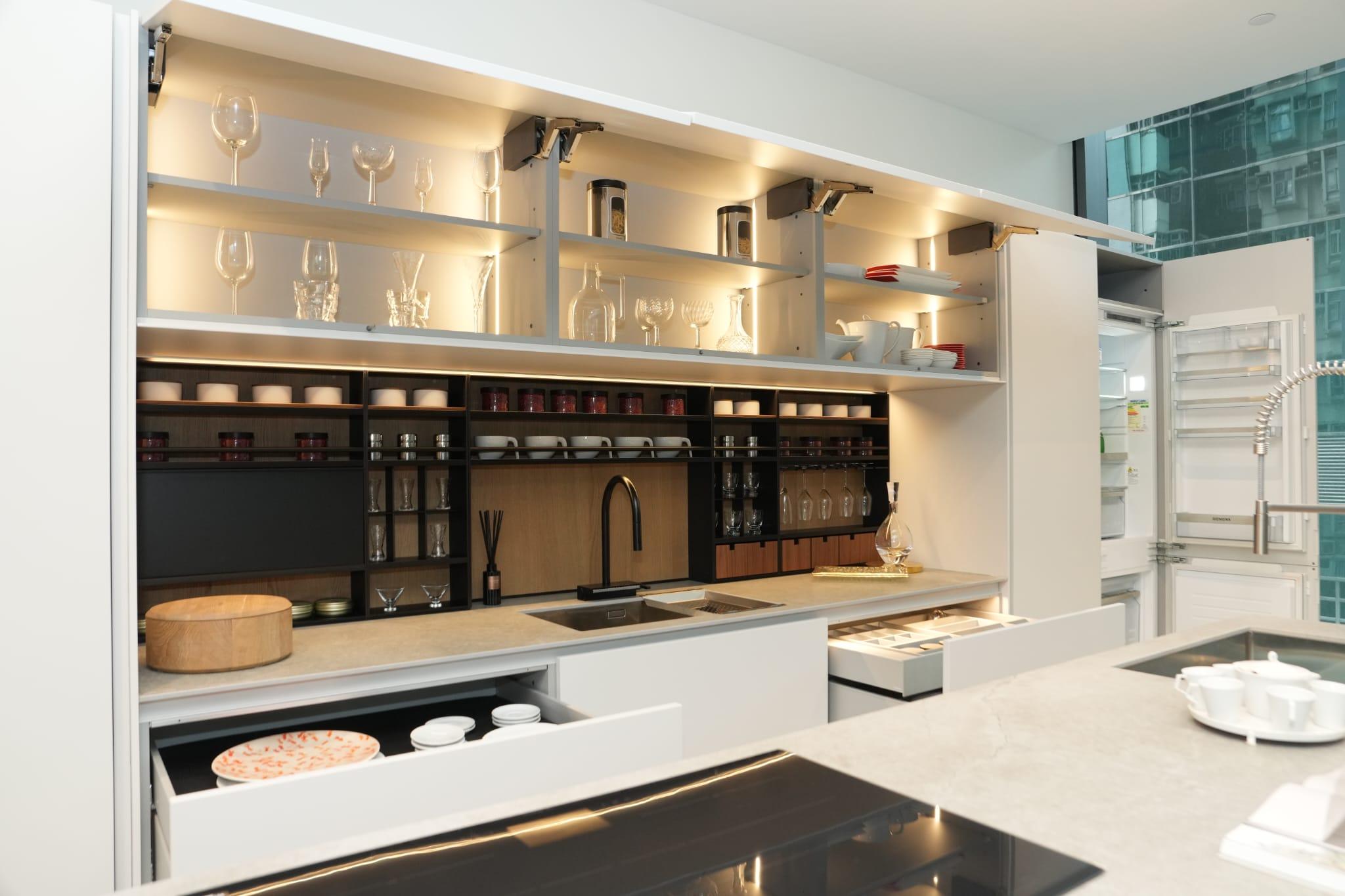 怡邦行旗下Poliform HK銷售經理蔡健文補充,ALEA系列廚櫃線條簡潔,無把手的設計使廚櫃外觀更加簡約、時尚,再配合櫃內的間隔,將廚具、碗盤進行分門別類,搭配嵌入式電器設備,將空間作最大運用。