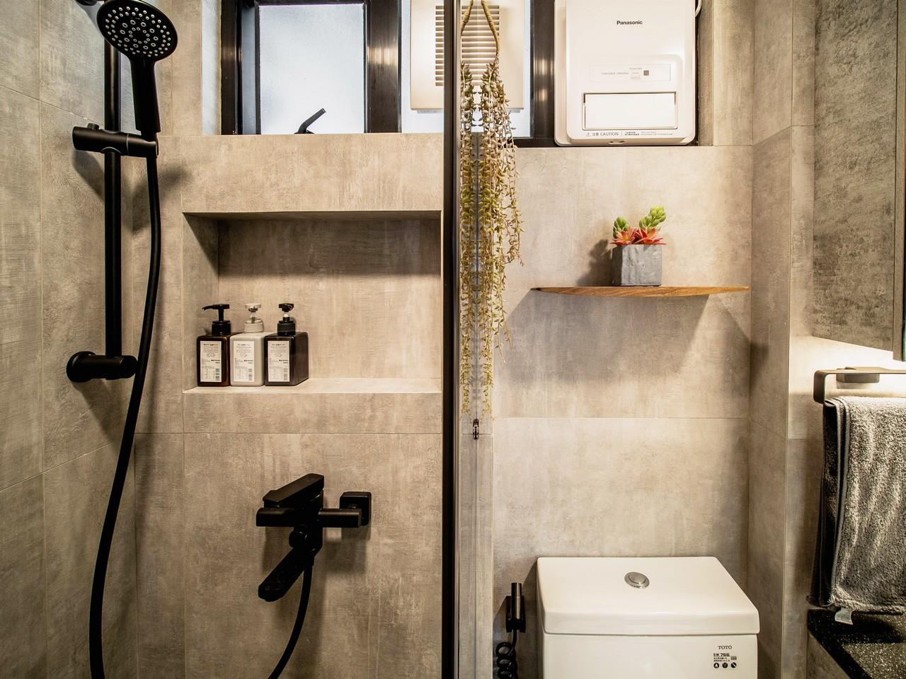很多人都喜歡黑、白及灰顏色配搭的家居,都是不容易出錯的配搭,仿水泥紋磚是其中一款熱門的款式,水泥紋磚帶給人一種型格的感覺,跟現代簡約風或輕工業風的家居設計很搭配,潔具可以選用啞黑色水龍頭及花灑,浴屏亦可以考慮選用灰玻璃,而較深色的木櫃亦適合配襯。如果浴室空間有限,可以考慮牆身與地板選用同一種款式的水泥紋磚,更有和諧感,有放大空間的效果。