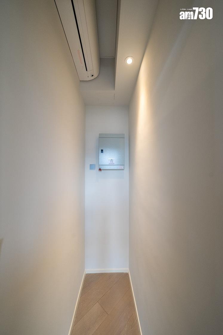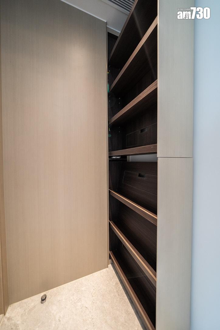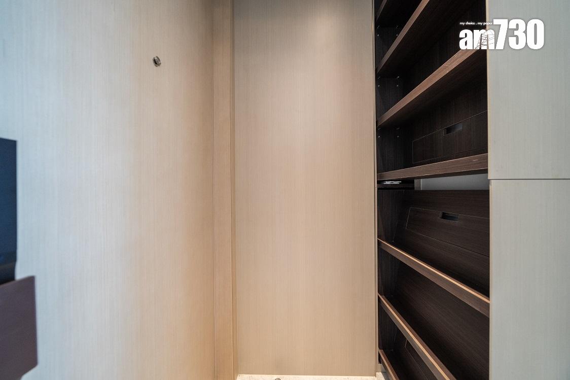 單位層與層之間高度達約3.5米,比同區大部分住宅項目的樓底高。客廳設天花燈槽連隱藏式LED燈飾,更能突顯單位高樓底的設計。客廳設計一組全身、推拉式多功能儲物櫃,內設鞋櫃空間及可儲存其他物品。