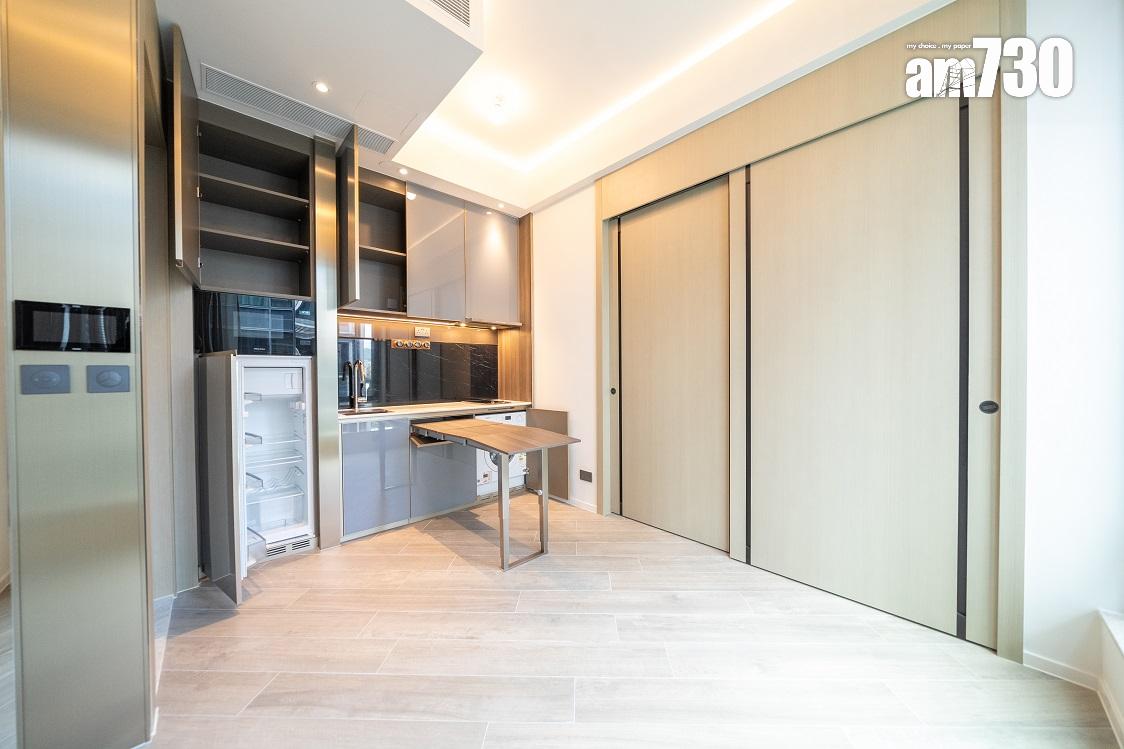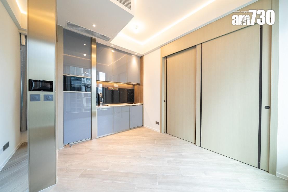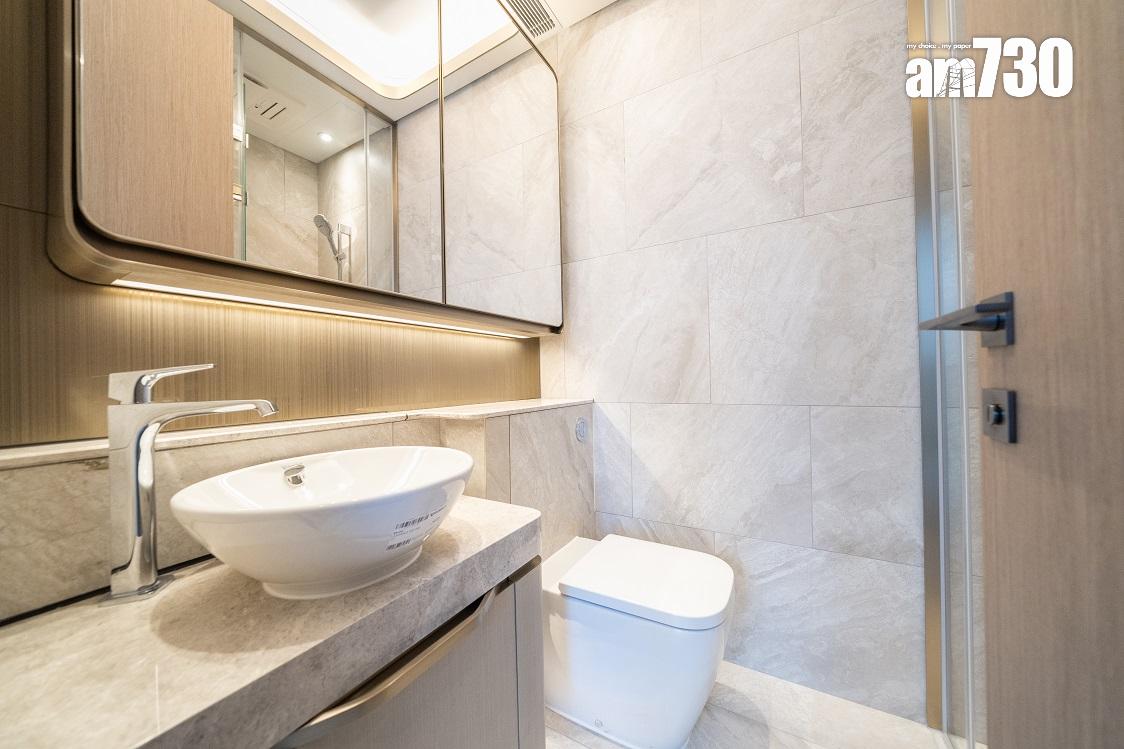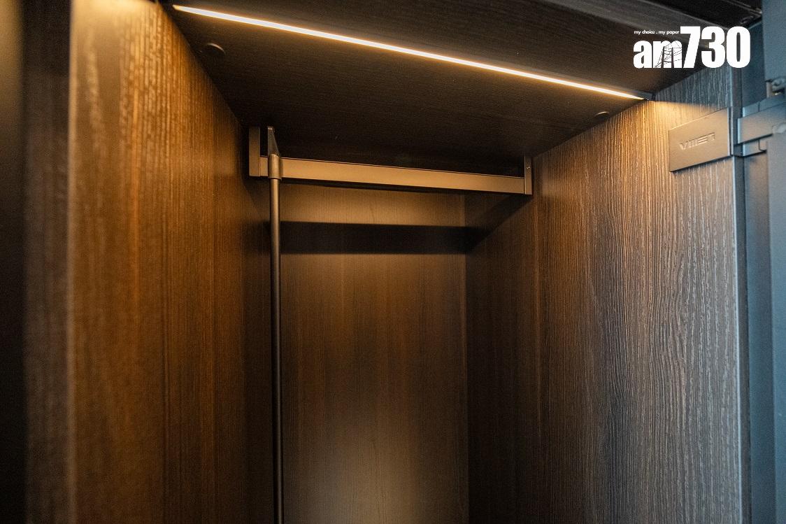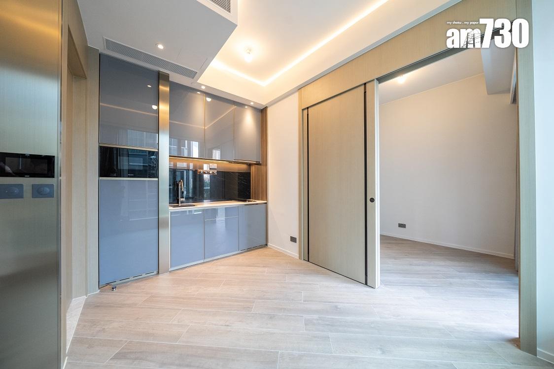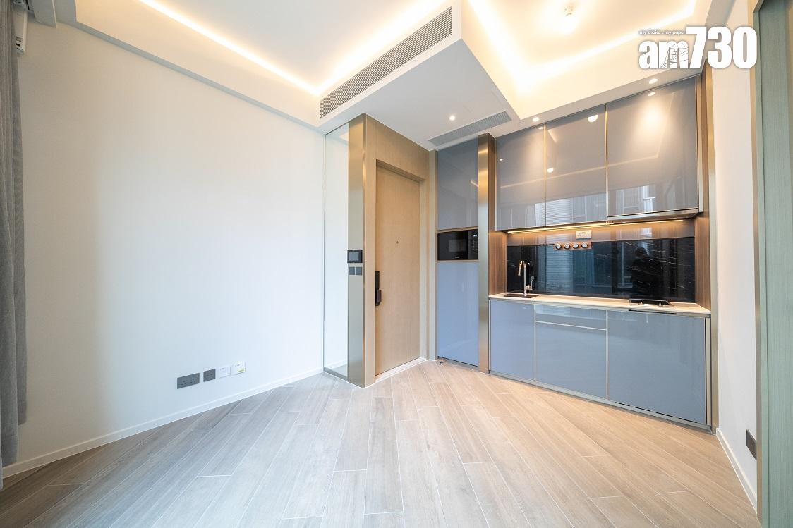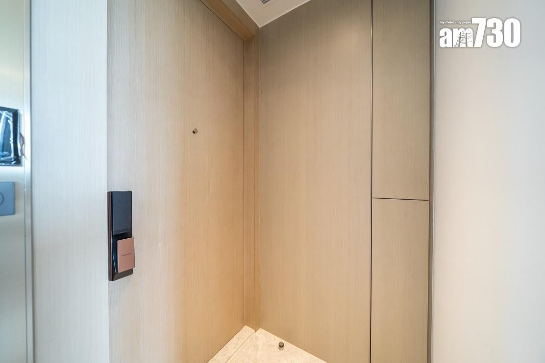 現樓示範單位為低座A座3樓B室,屬無改動示範單位,三房一套連衣帽間及工作間間隔,實用面積649方呎。單位層與層之間高度達約3.5米,較同區大部分住宅項目的樓底更高。客飯廳已設天花燈槽連隱藏式LED燈飾,更能突顯單位高樓底的設計。客飯廳設計一組全身、推拉式多功能儲物櫃,內設鞋櫃空間及可儲存其他物品。