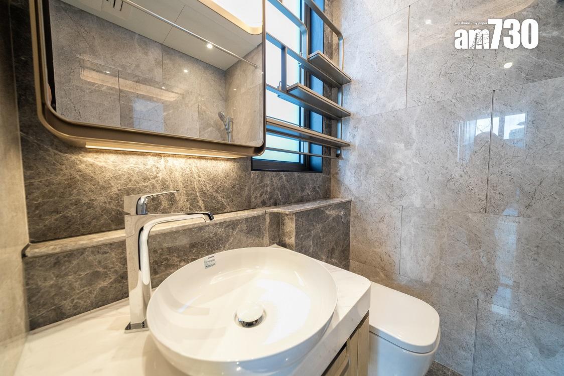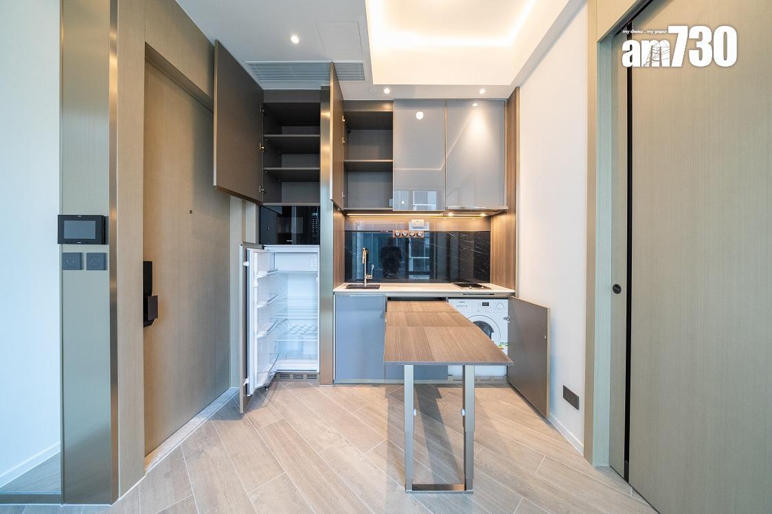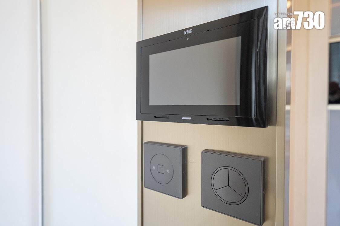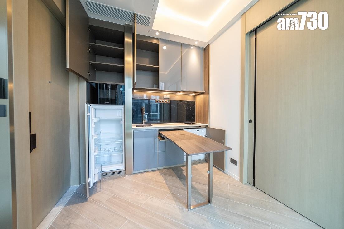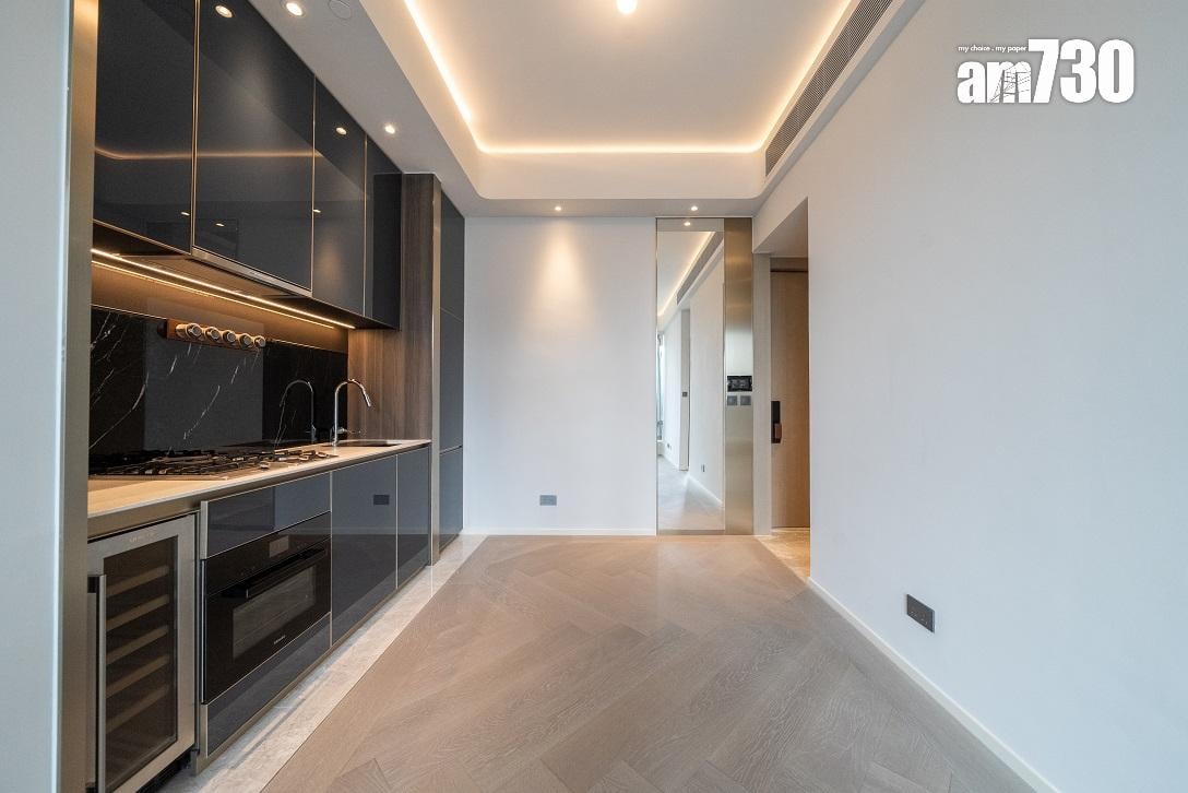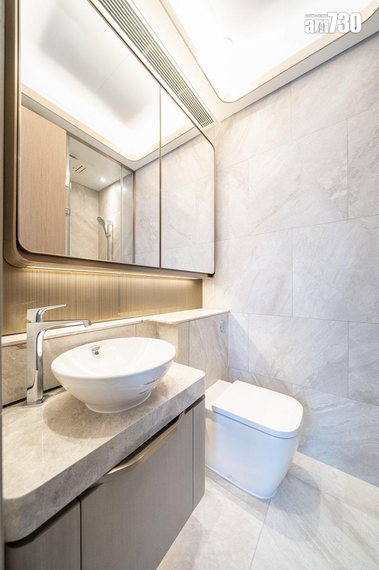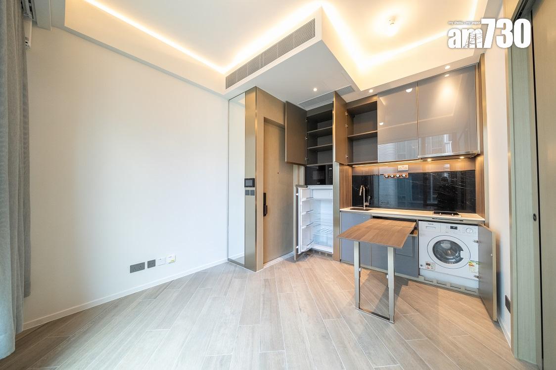 現樓示範單位為低座A座3樓B室,屬無改動示範單位,三房一套連衣帽間及工作間間隔,實用面積649方呎。單位層與層之間高度達約3.5米,較同區大部分住宅項目的樓底更高。客飯廳已設天花燈槽連隱藏式LED燈飾,更能突顯單位高樓底的設計。客飯廳設計一組全身、推拉式多功能儲物櫃,內設鞋櫃空間及可儲存其他物品。
