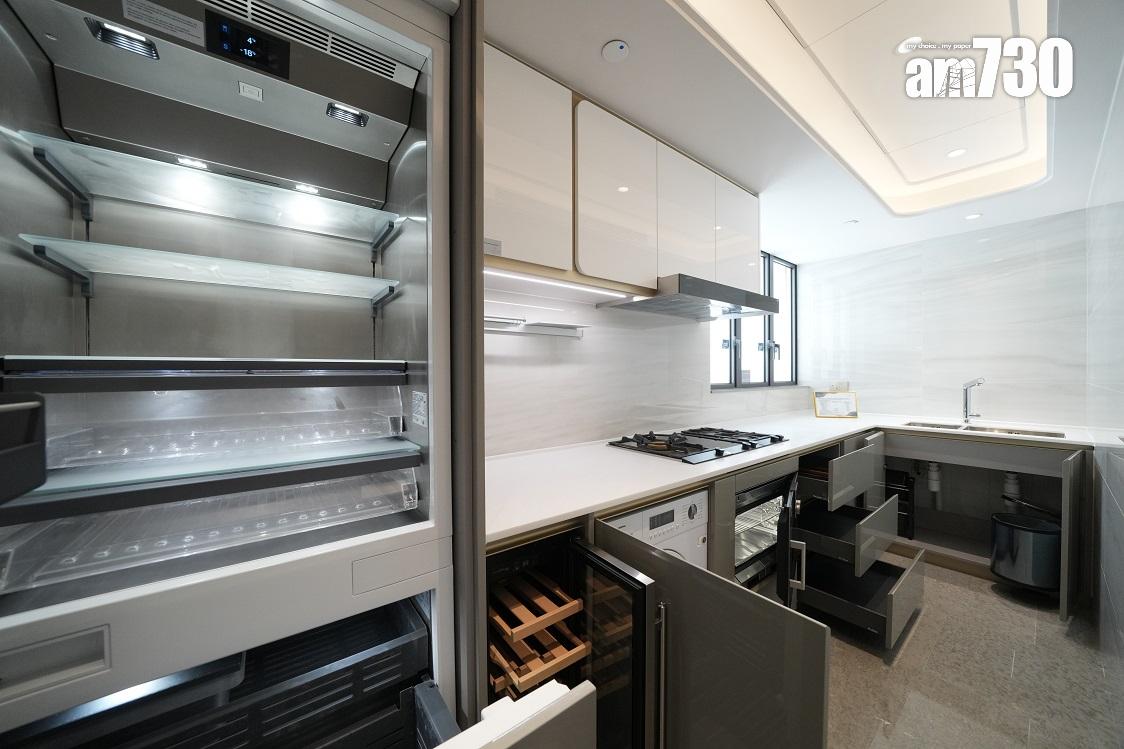 為貫徹單位的南美洲動感主題,廚房工作檯面及牆身均採用同對比強烈的黑白色雲石鋪砌,既耐看實用,同時令廚房空間有如藝術品般呈現眼前。廚房備有各款名牌家電,包括德國高級廚具品牌GAGGENAU的蒸焗爐、煮食爐、電磁爐、雪櫃、洗衣乾衣機及抽油煙機等,另更設有法國Vinvautz酒櫃。