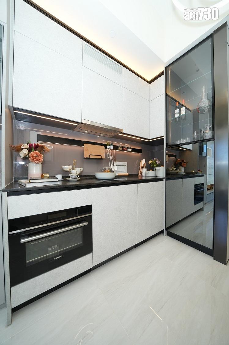 單位向東南可享九龍寨城公園翠綠景觀,眺望啟德發展區及維多利亞港海景。全屋室內布置採用灰色、白色配以大量原木傢俬作點綴,以深淺色作對比,瞬間提升單位溫暖感。橫向型客廳長約5米,設計師充分利用高樓底優勢,於客廳上方打造約25方呎的空中書房,令到偌大空間方正實用、布局分明。單位設有落地玻璃摺門連接約38方呎的三合一露台,延伸室內空間之餘,更可迎納充足天然光。