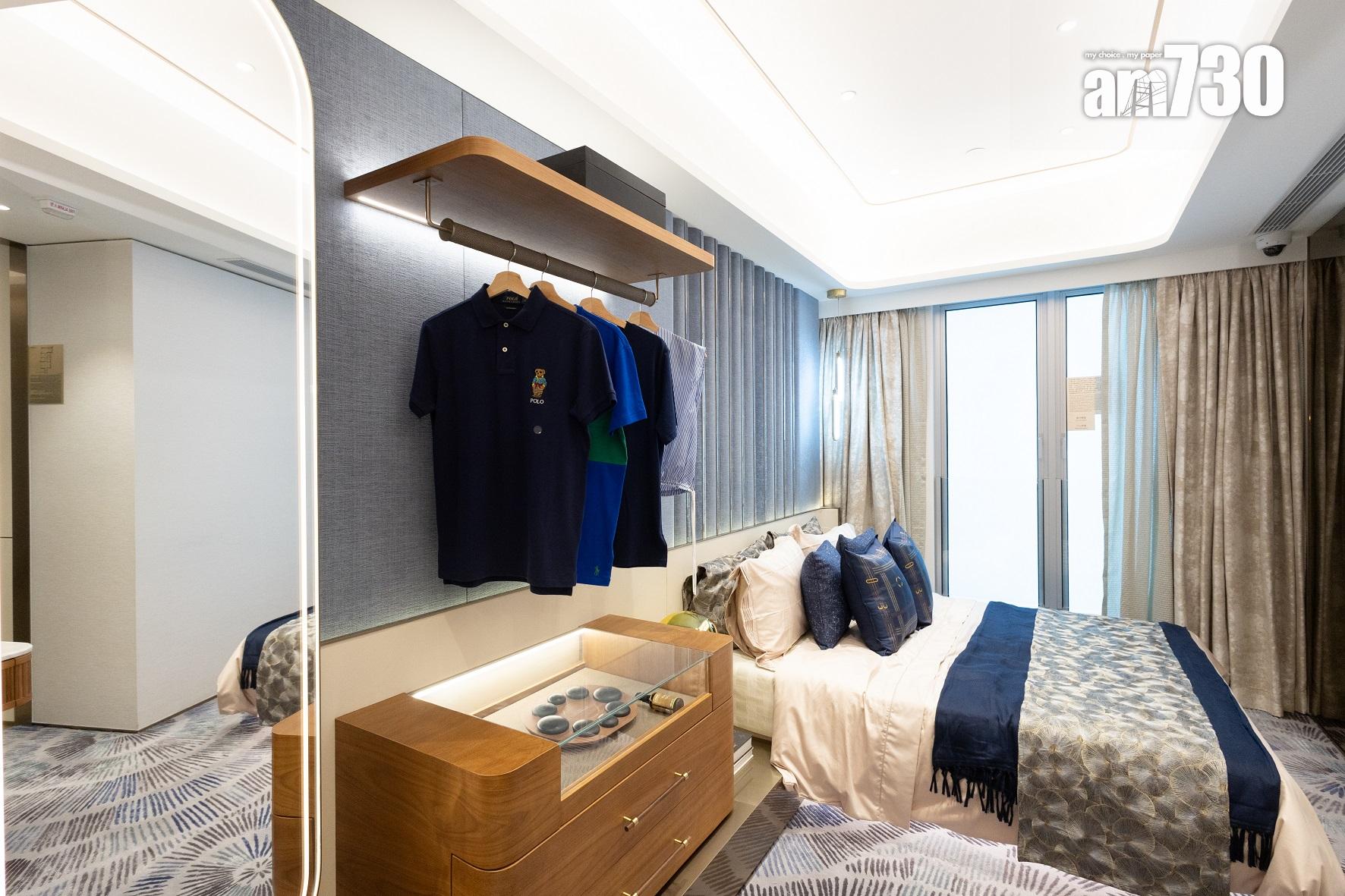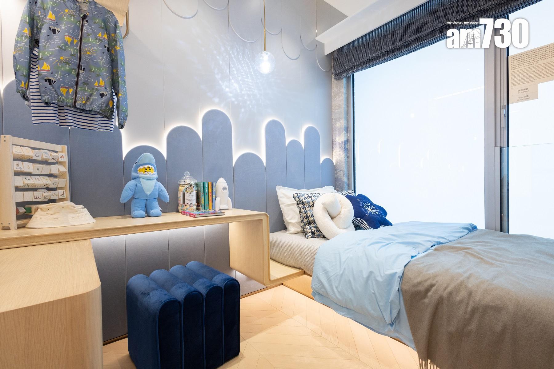 走廊貫穿寢區,設計師將其中一間睡房改造為書房,且將部分牆身拆除,打造開放式的格局,與客廳空間結合,感覺更為寬敞。主人睡房方正實用,長約13呎11吋,最寬處約7呎10吋,空間寬裕,除可做到三邊落床外,並預留衣櫃位置及化妝枱位置,方便住戶放置衣櫃收納衣物及化妝品。主人睡房及睡房與客廳坐向相同,享同一景觀,配置大幅玻璃窗設計,光線充裕,可飽覽維港海景。至於主人睡房及睡房牆身均以藍色作主調,兒童房更配有大海紋理特色牆,帶出柔和舒適的環境。