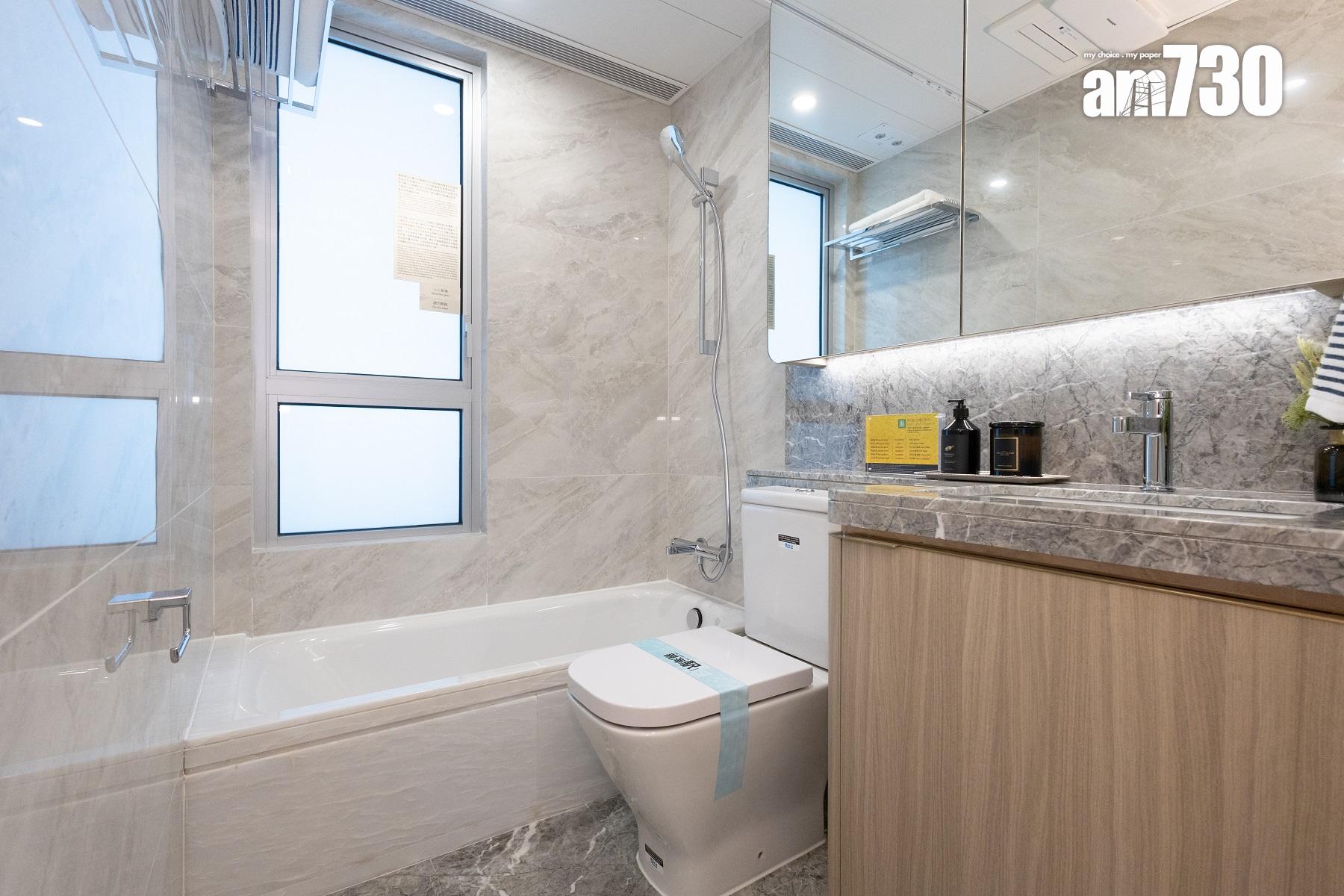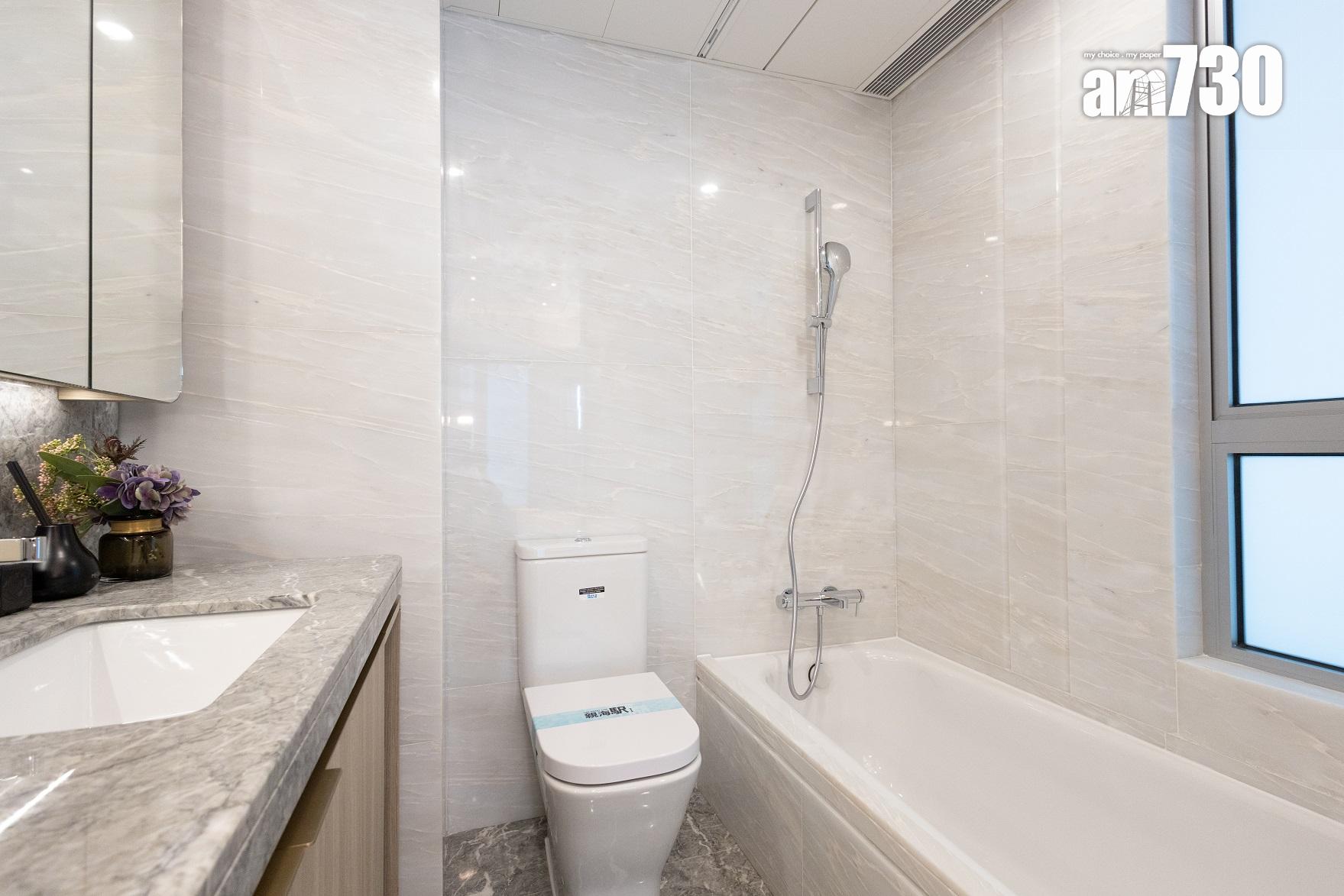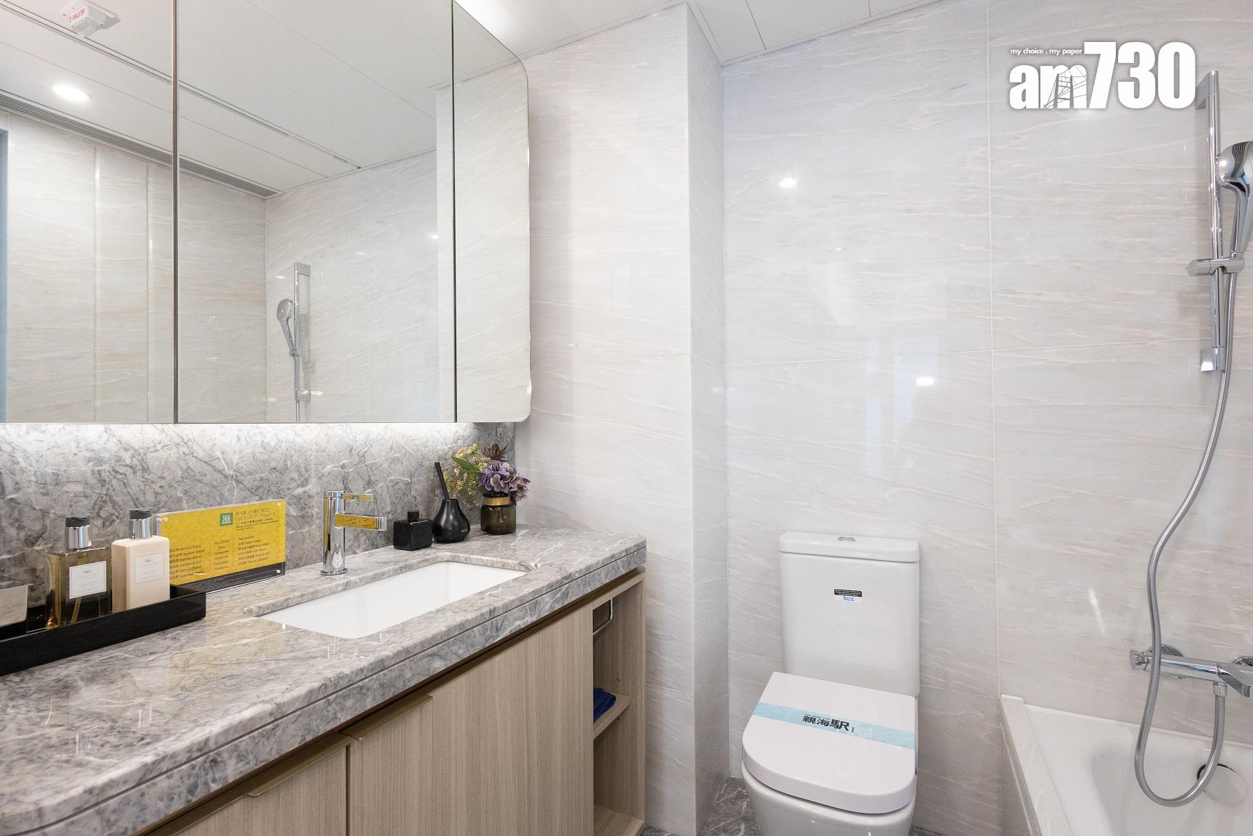 主人浴室及浴室均設有窗戶,屬「明廁」設計,並設有特大的方形梳妝鏡,洗手盆及浴缸設計,梳妝鏡內配置層架裝置,增加廁所內的儲物空間。簡潔的灰色天然雲石洗手盆枱面配上淺色的雲石牆身,提升整體浴室空間感。交樓標準的浴室配備多個歐洲知名品牌衞浴設備,包括德國Hansgrohe鍍鉻花灑套裝及洗面盆龍頭、KALDEWEI的瓷釉鋼浴缸、西班牙Roca的搪瓷坐廁。