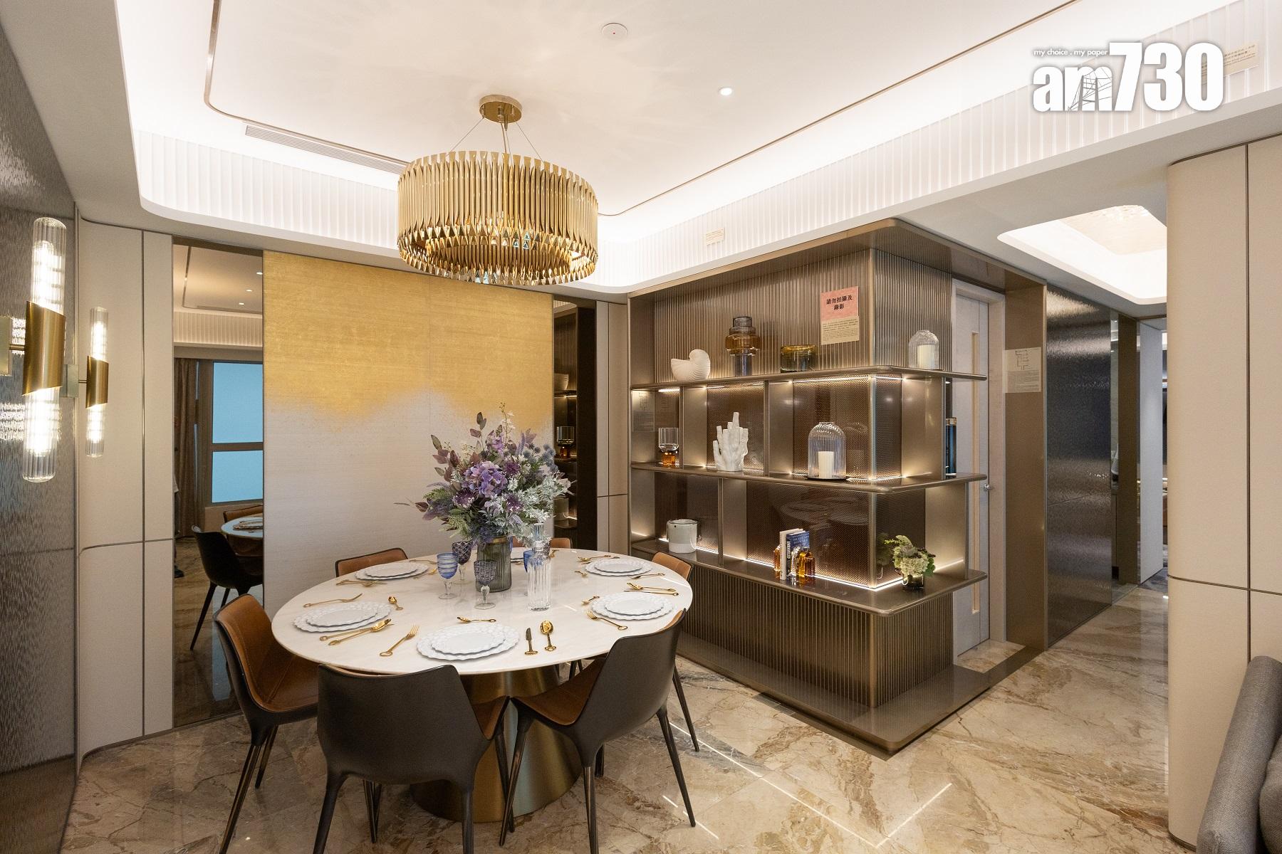 客飯廳以長形開則,合共長約18呎10吋,最闊處約9呎10吋,空間感十足。客廳設有大玻璃窗,景觀開揚,採光度極高,盡享維港海景。飯廳設有「L型」金屬裝飾櫃,以金色特色牆襯托大圓飯枱,突顯高貴感覺。地飾面以暖色系的天然雲石鋪砌,令客廳及飯廳感覺更遼闊、更優雅、更具藝術氣質。