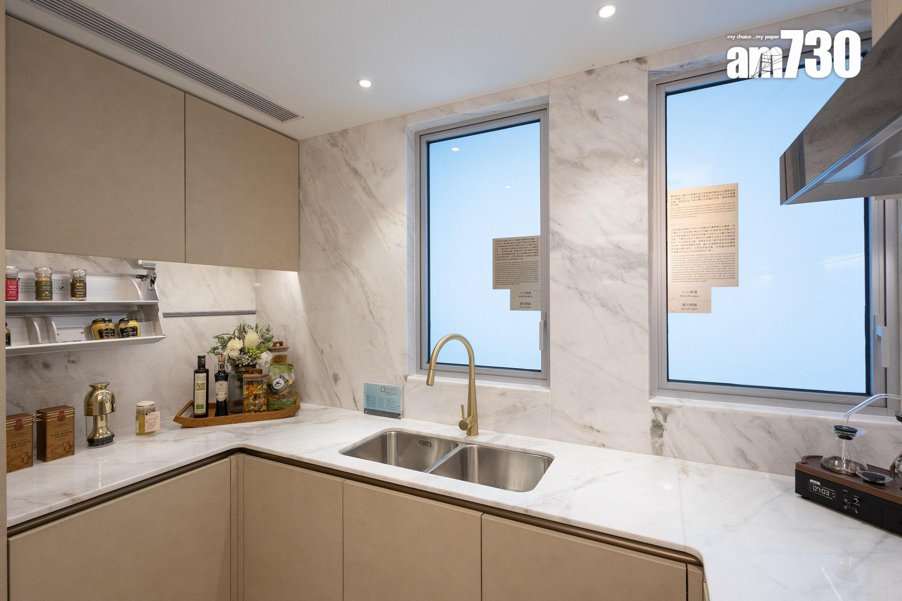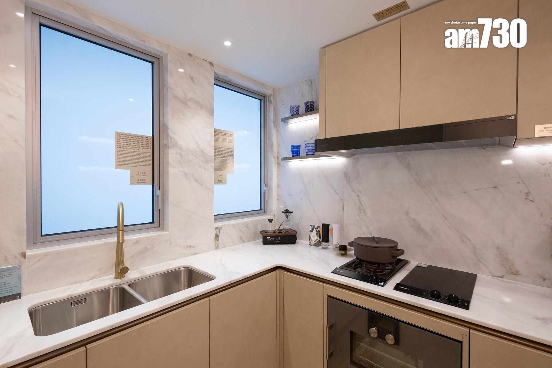 廚房屬梗廚設計,設有特長工作枱,提供更多工作空間。交樓標準配備德國家電品牌Gaggenau,包括有煤氣煮食爐、電煮食爐、抽油煙機、蒸焗爐、雪櫃及洗衣/乾衣機;同時廚櫃配置智能感應燈,無需觸碰,住戶手掃即可控制開關。交樓標準下部分廚房電器可連接Home Connect功能,可透過智能電話或平板電腦遙距操控電器。