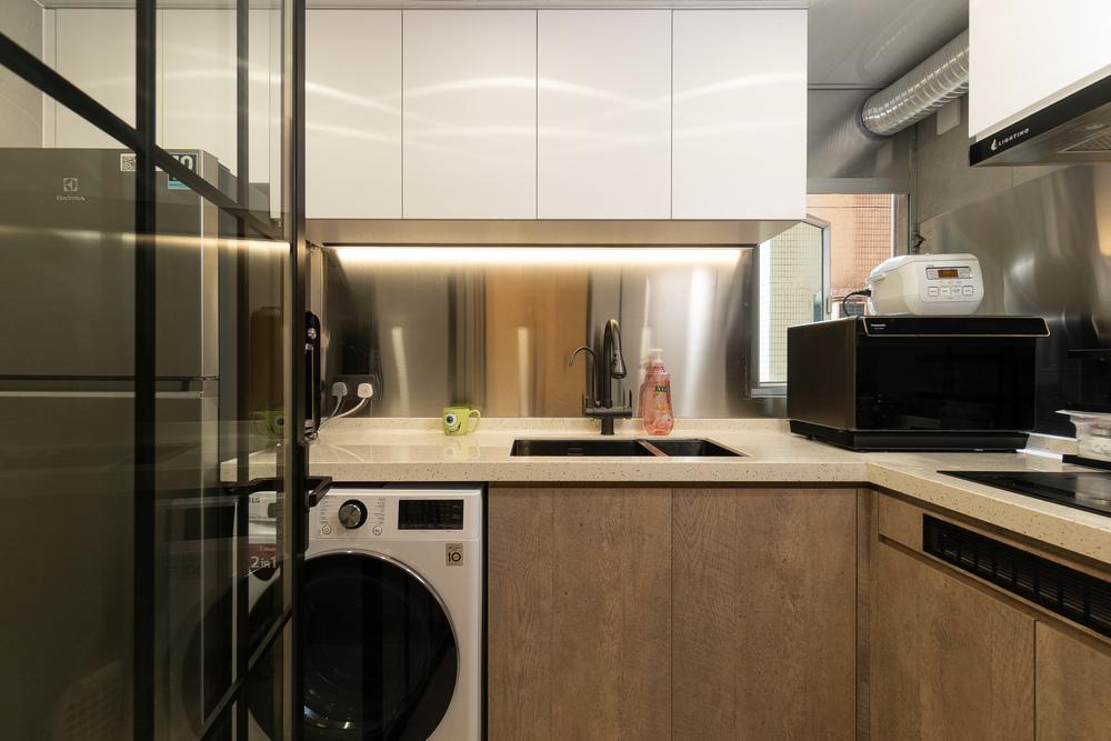 至於廚房門則造了方格玻璃門,亦變成了其中一個設計焦點。廚房用色較穩陣,上下廚櫃分別用米白色及木色的配搭,牆身裝了不鏽鋼板,方便打理。