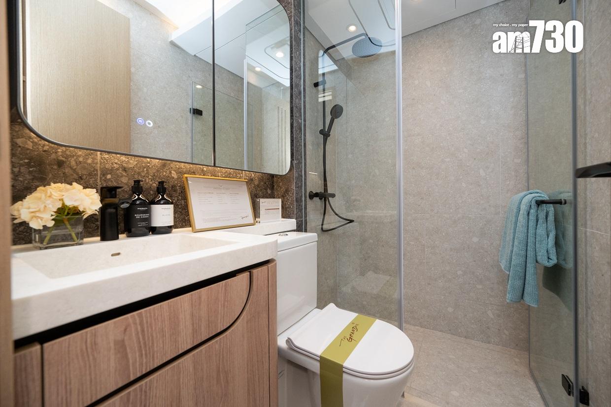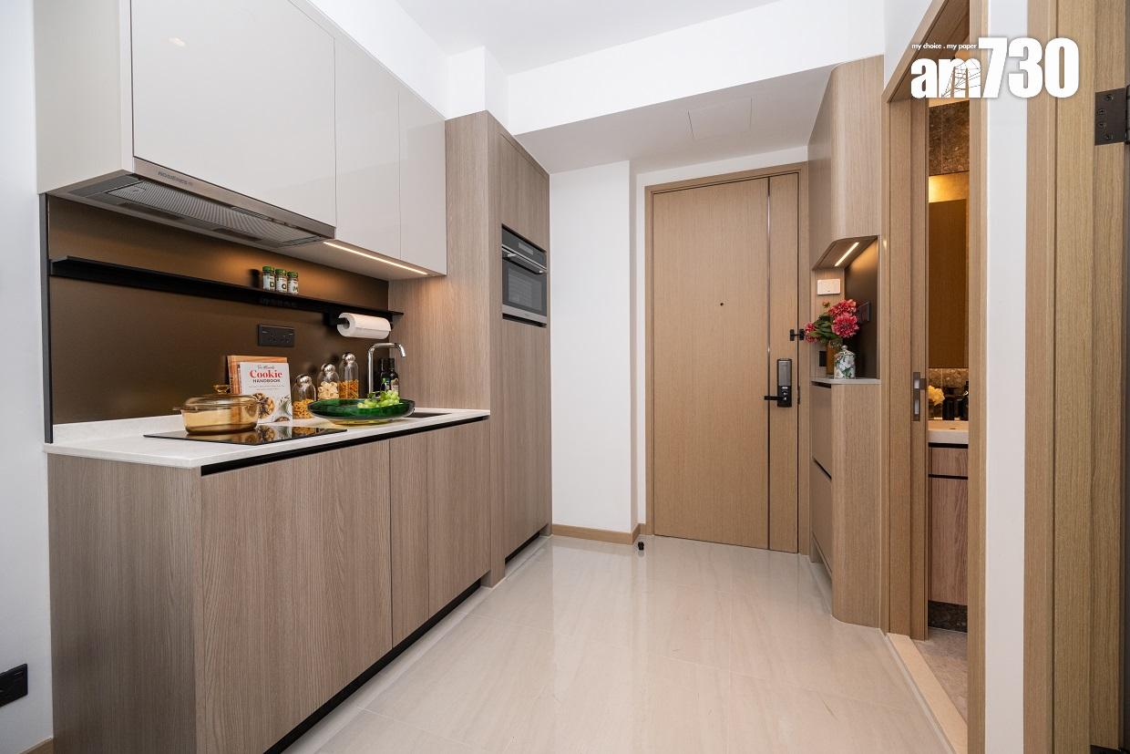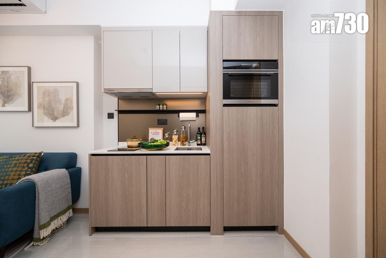 廚房為開放式設計,淺色系的廚櫃內置不同層板,方便住戶分類擺放各式廚具,收納空間整條有序。配合比例得宜的浴室,打造酒店式奢華年輕新生活。