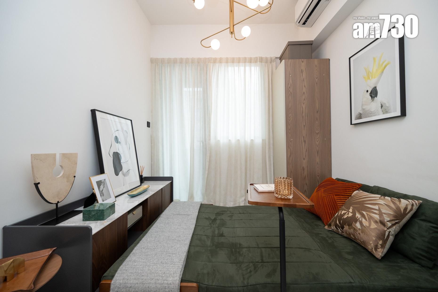為創造雙倍寬敞空間感,設計師精心於客飯廳放置墨綠色的多用途梳化床,日常為座位梳化,展開後即可變成雙人床,隨時配合住戶所需。沙發側旁放置木製圓形小茶几;另一旁亦放置胡桃木色電視櫃,配上米色地毯。