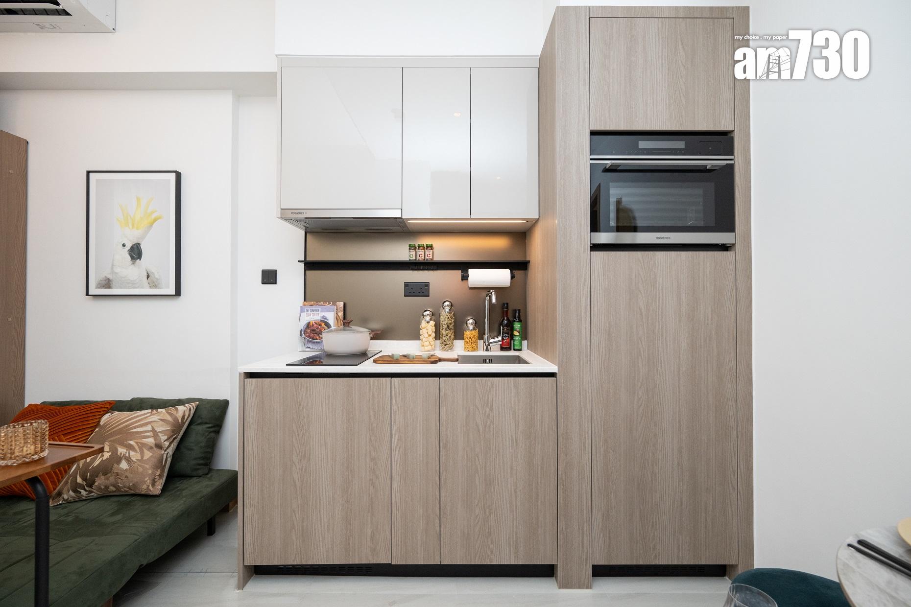 廚房為開放式設計,淺色系的廚櫃內置不同層板,方便住戶分類擺放各式廚具,收納空間整條有序。設計師特意在開放式廚房旁放置圓形餐椅及閃亮的金色掛鏡,提升整體和諧感,運用花瓶加以點綴,突顯客飯廳高雅格調。