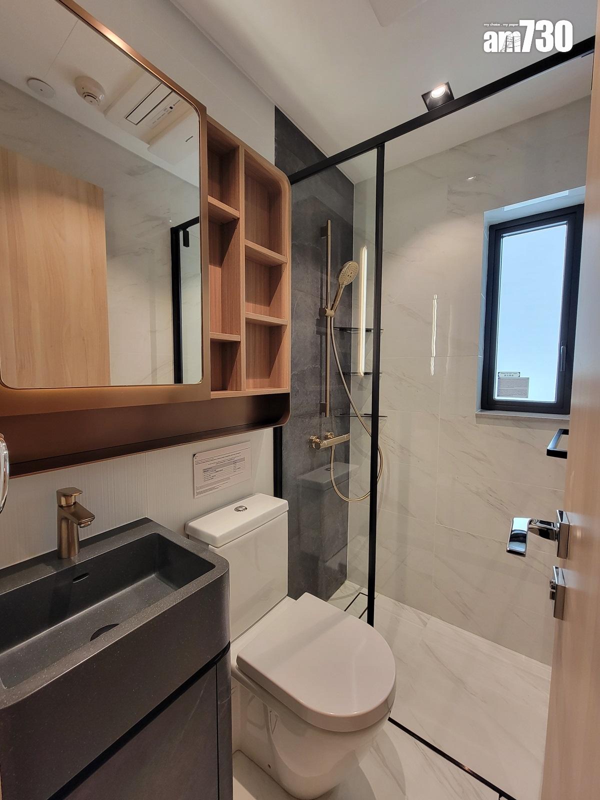浴室設計簡約奢華,白色暗條子紋牆身襯托銅色鏡櫃及深灰色石紋洗手盤櫃。配備德國Hansgrohe衛浴產品,企缸更採用意大利高級浴屏門,同時以黑白兩款雲石紋磚舖砌牆身,盡顯設計心思,亦配上德國著名品牌Stiebel Eltron電熱水爐及貼心裝設Panasonic Nanoe X浴室寶。