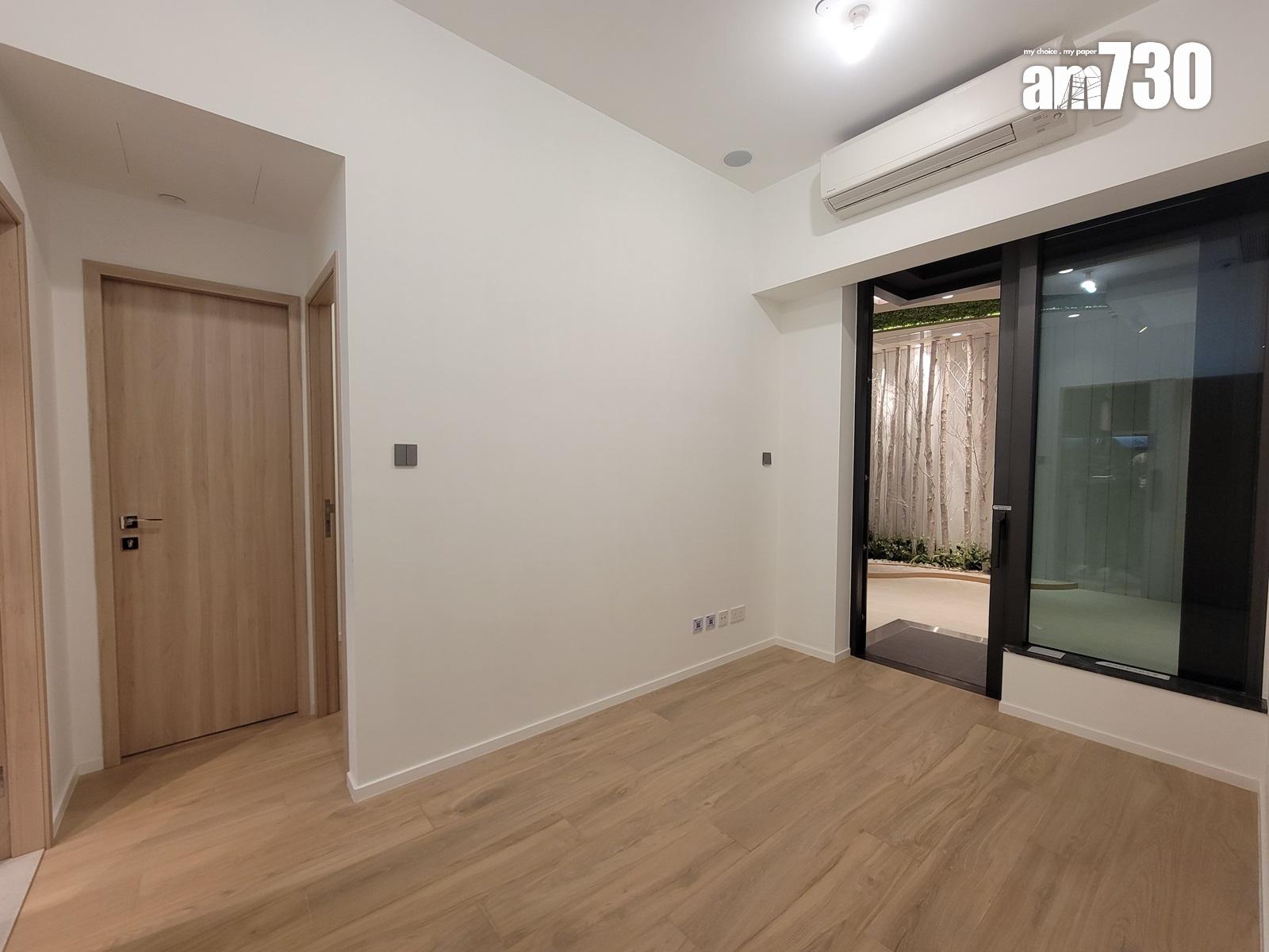 以18樓A室為藍本搭建的無改動示範單位,實用面積341方呎,兩房間隔。客飯廳以長形開則,寬敞實用,客飯廳間隔分明,地面鋪設意大利品牌木紋磚,配襯米白色牆身。客廳連接約23方呎露台,配以落地玻璃趟門,提升室內採光。單位配置Daikin分體式變頻冷暖冷氣機,透過智能偵測,自動調節空內溫度。