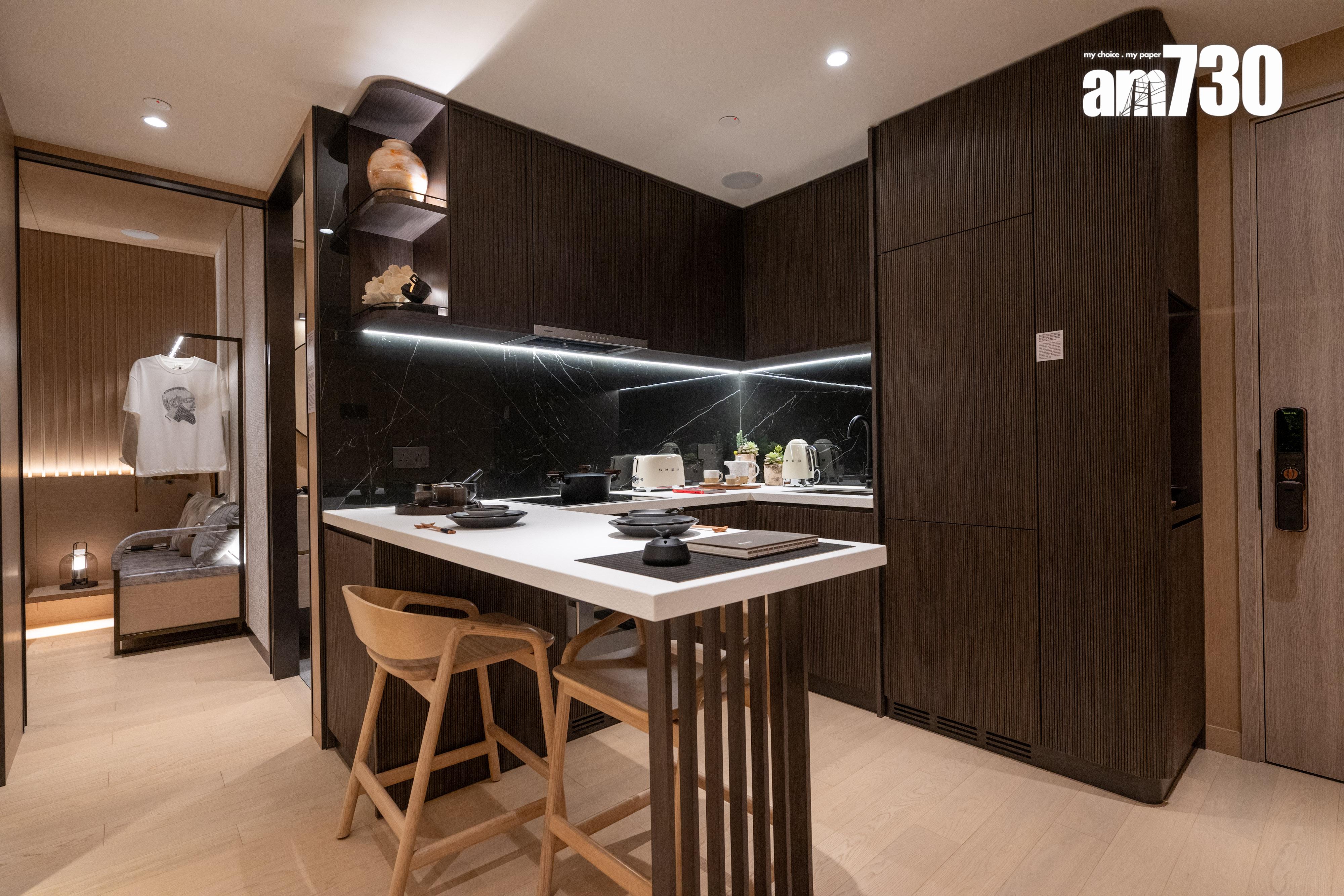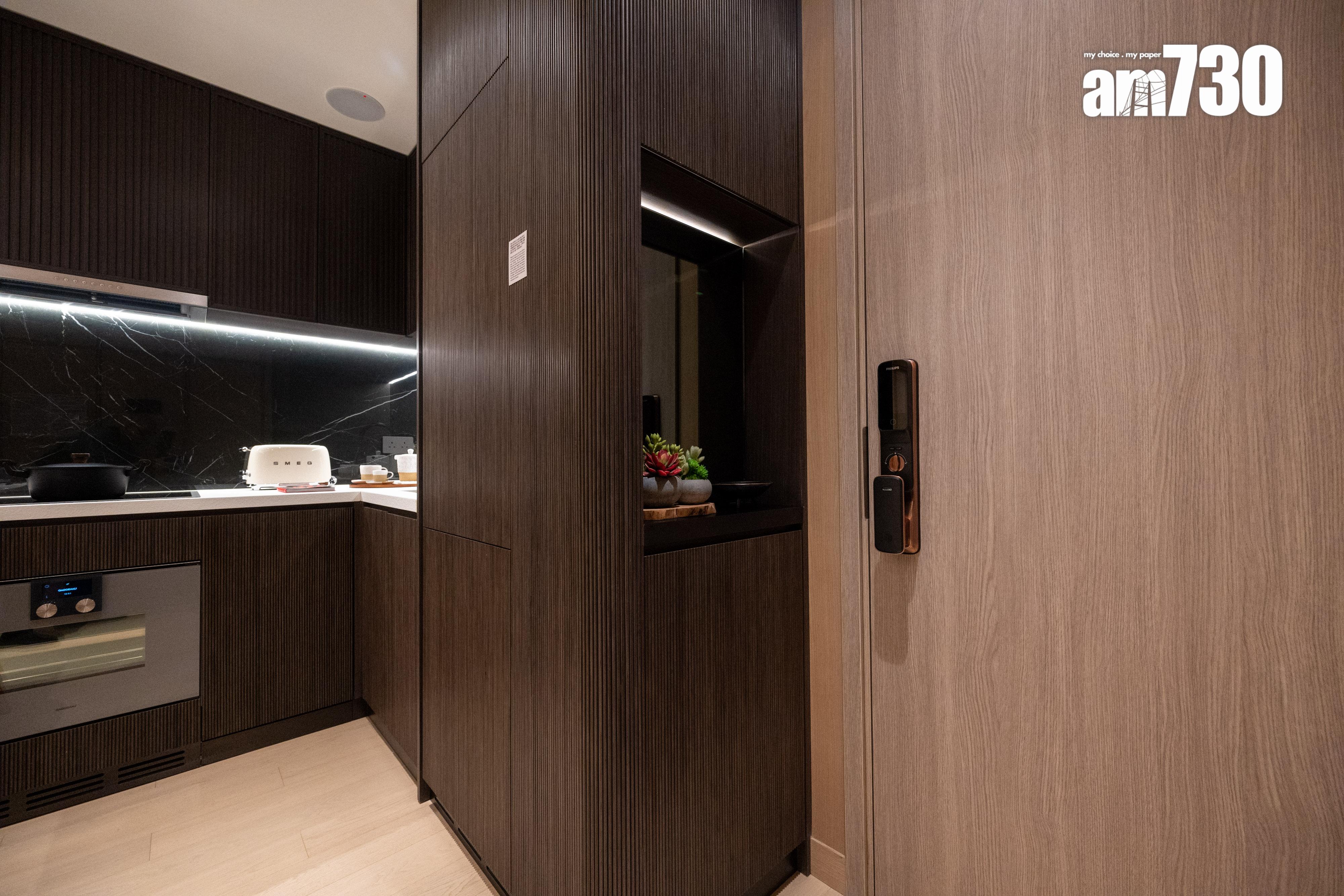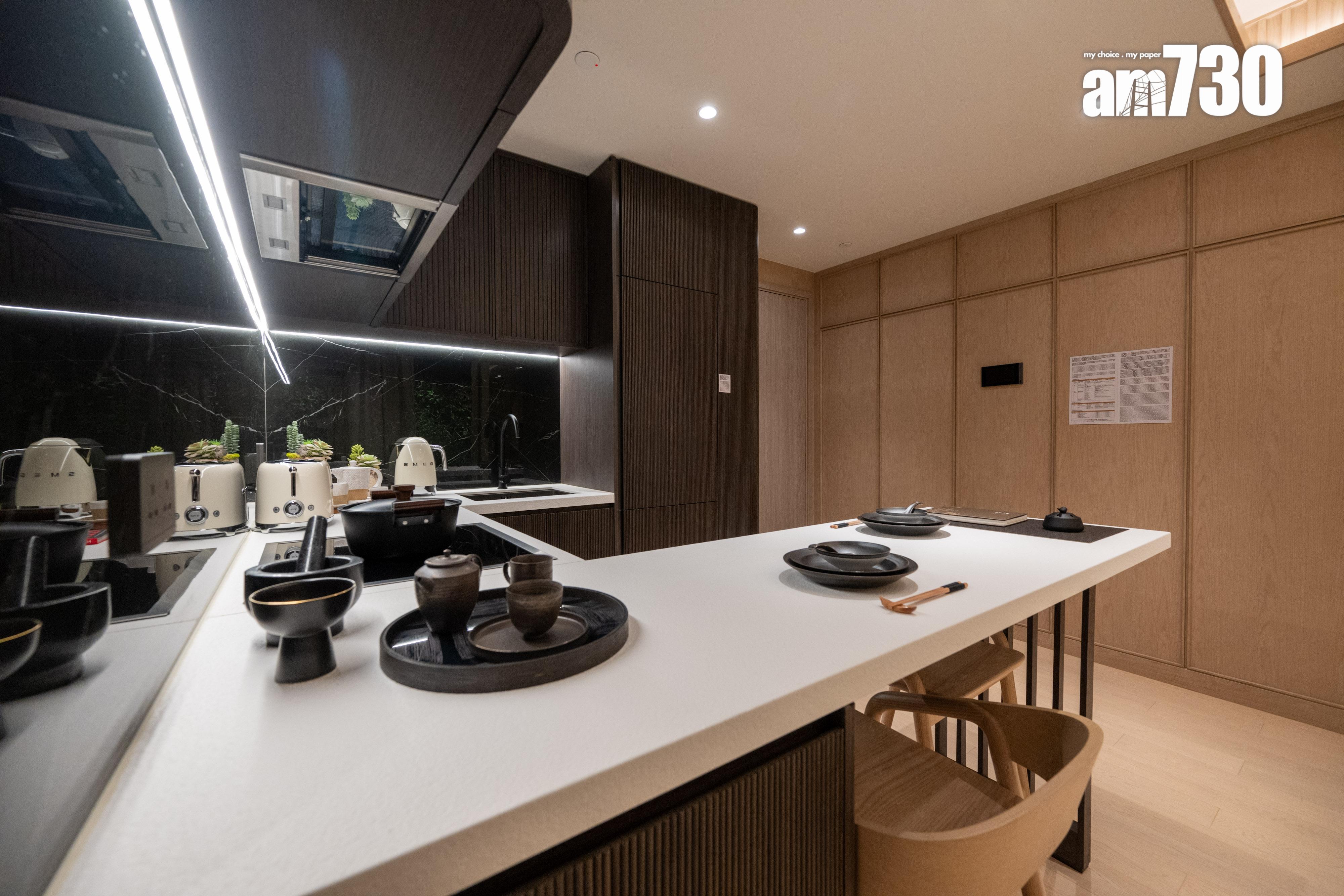 另外,單位廚房採用開放式設計,設計師將吧枱和開放式廚房連接起來,除方便用餐更提升空間實用性。開放式廚房使用深啡色隱藏式櫃門設置多個吊櫃,避免凌亂的感覺之餘,提供大量儲物空間。檯面選用白色天然石材料,並搭配搭深色系碟具,增添藝術簡約氣氛之餘,帶出簡潔日式元素。