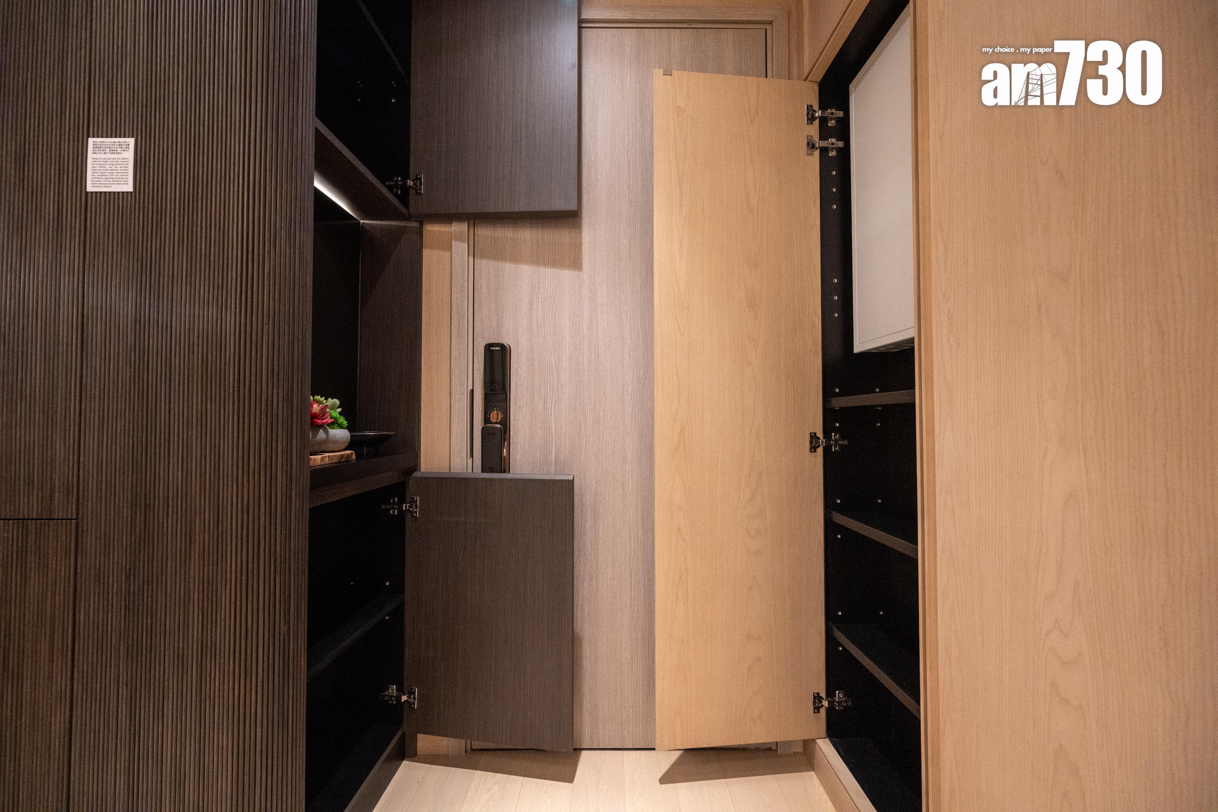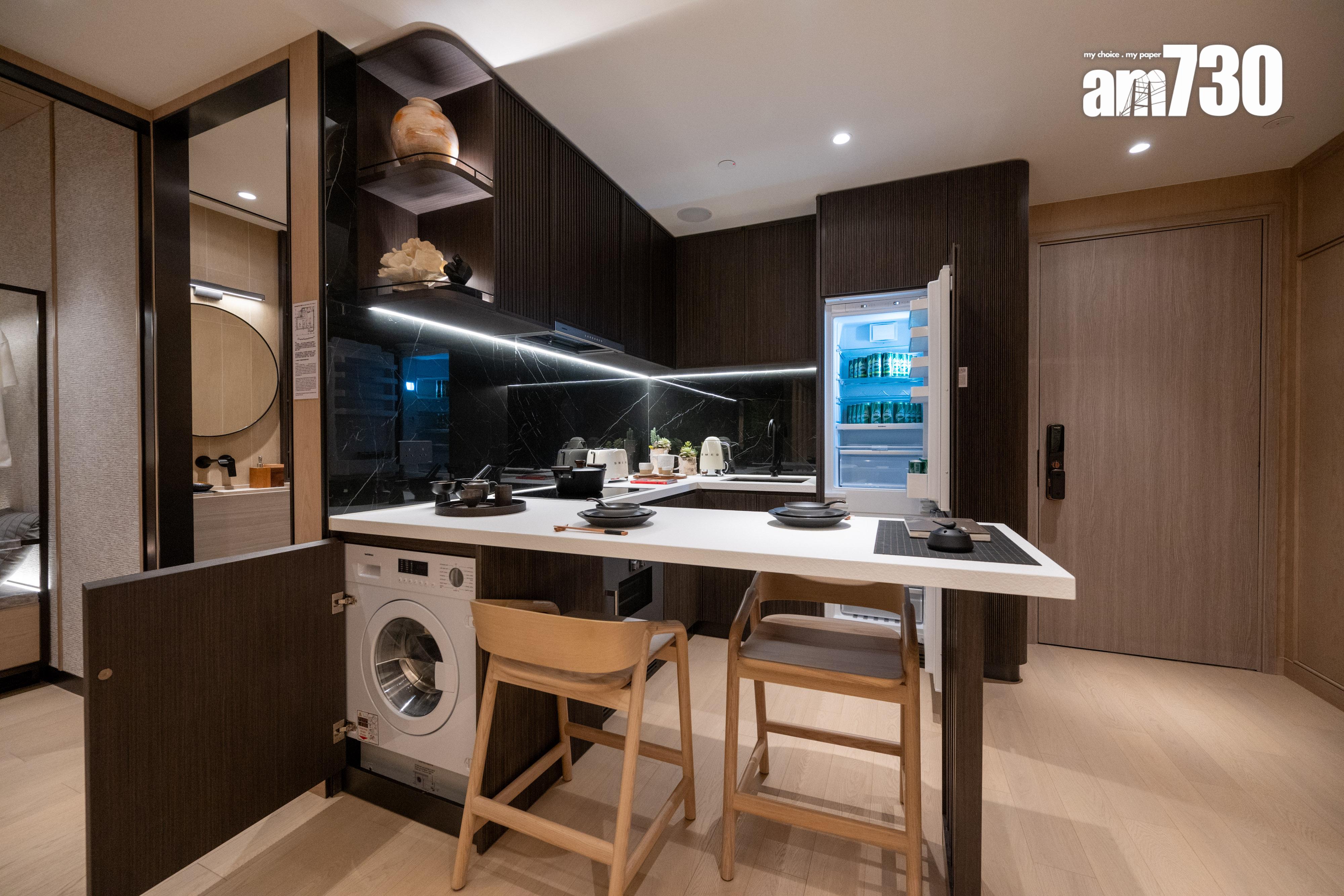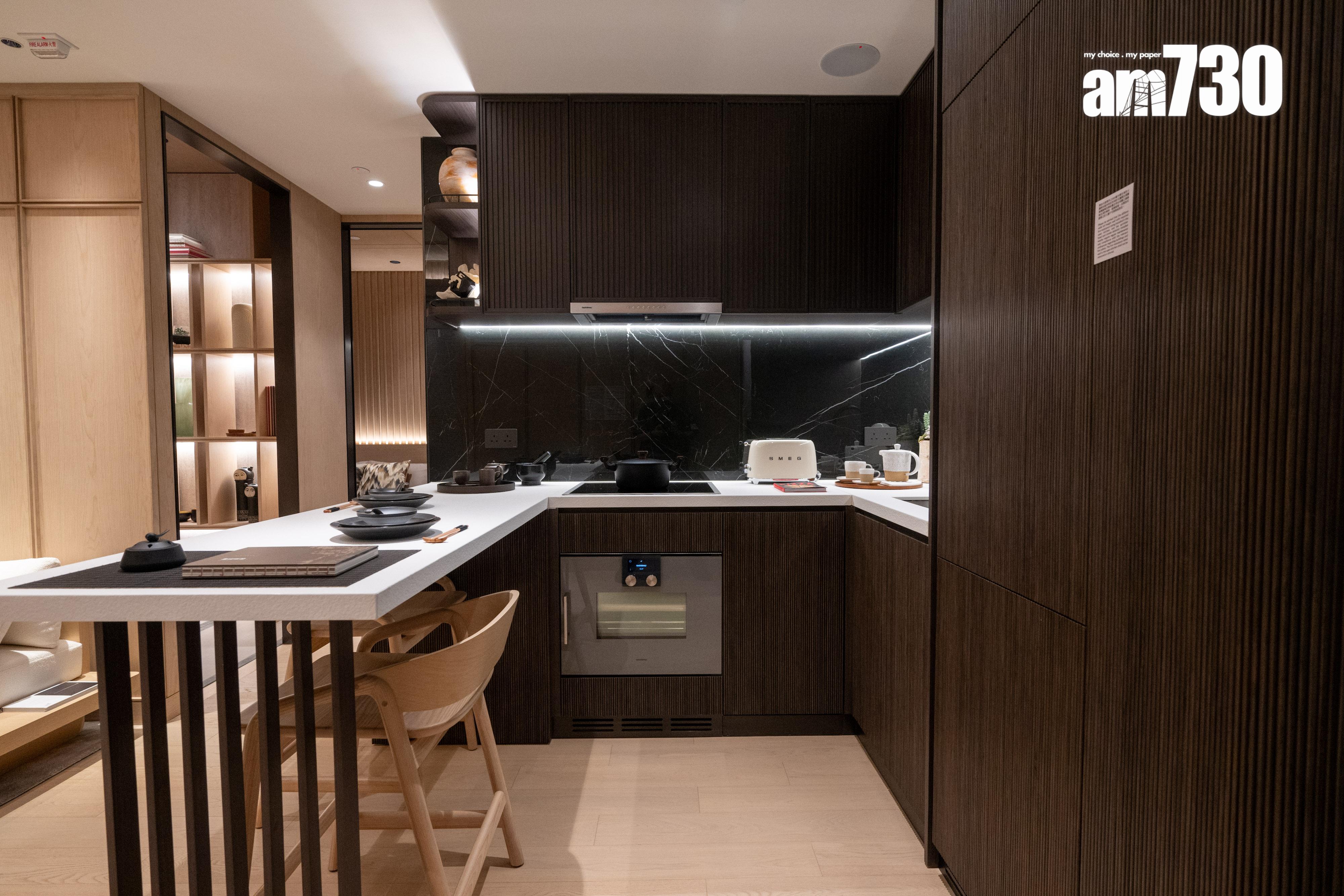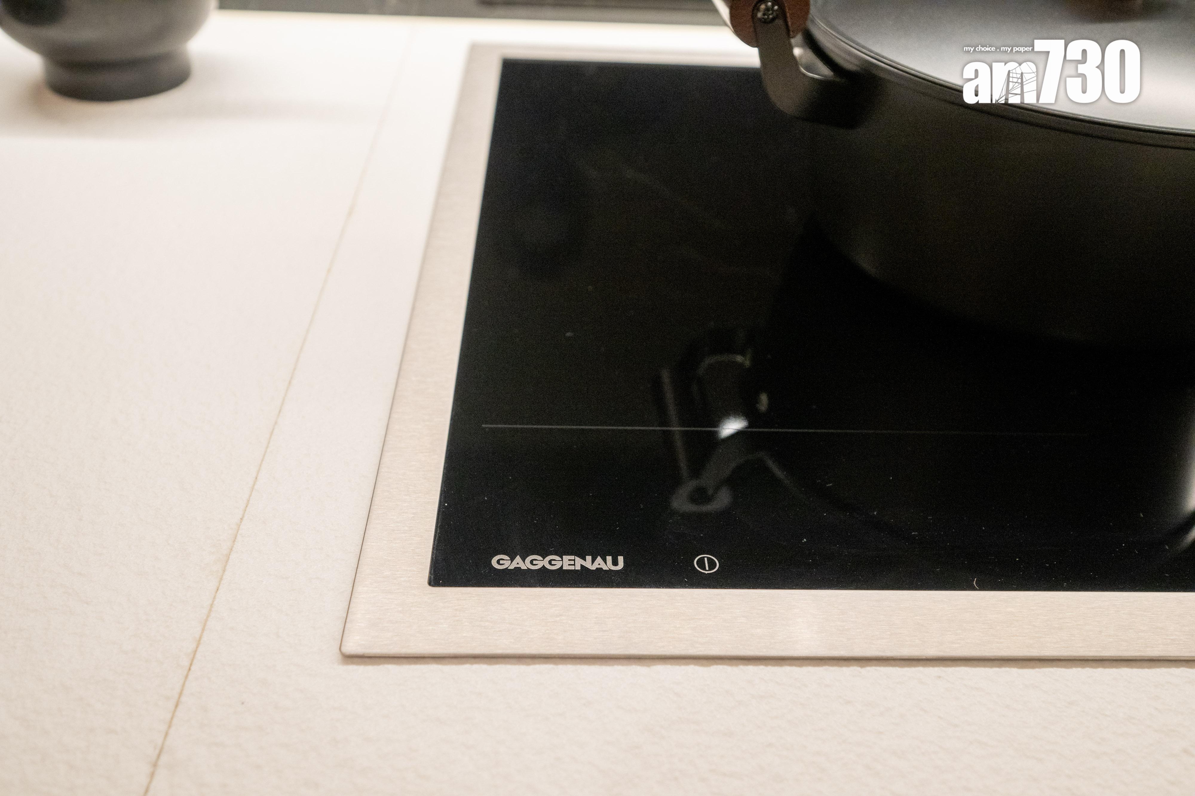 另外,單位廚房採用開放式設計,設計師將吧枱和開放式廚房連接起來,除方便用餐更提升空間實用性。開放式廚房使用深啡色隱藏式櫃門設置多個吊櫃,避免凌亂的感覺之餘,提供大量儲物空間。檯面選用白色天然石材料,並搭配搭深色系碟具,增添藝術簡約氣氛之餘,帶出簡潔日式元素。